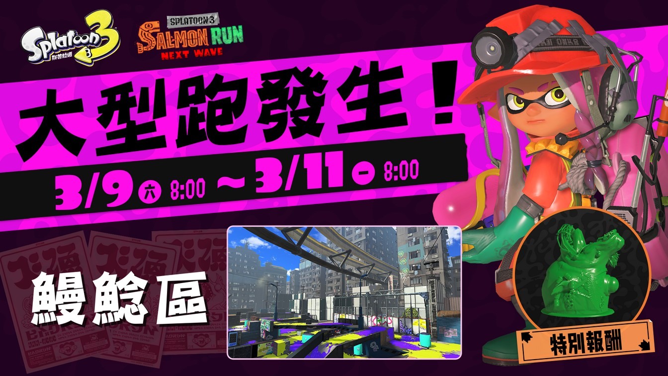在鮭魚跑裡,除了新場地「鮭魚心臟鬥技場」會登場之外,大量鮭魚逼近占地對戰場地的「大型跑」,目前預測將會於 3 月 9 日(六)早上 8:00~11 日(一)早上 8:00 在「鰻鯰區」發生。
