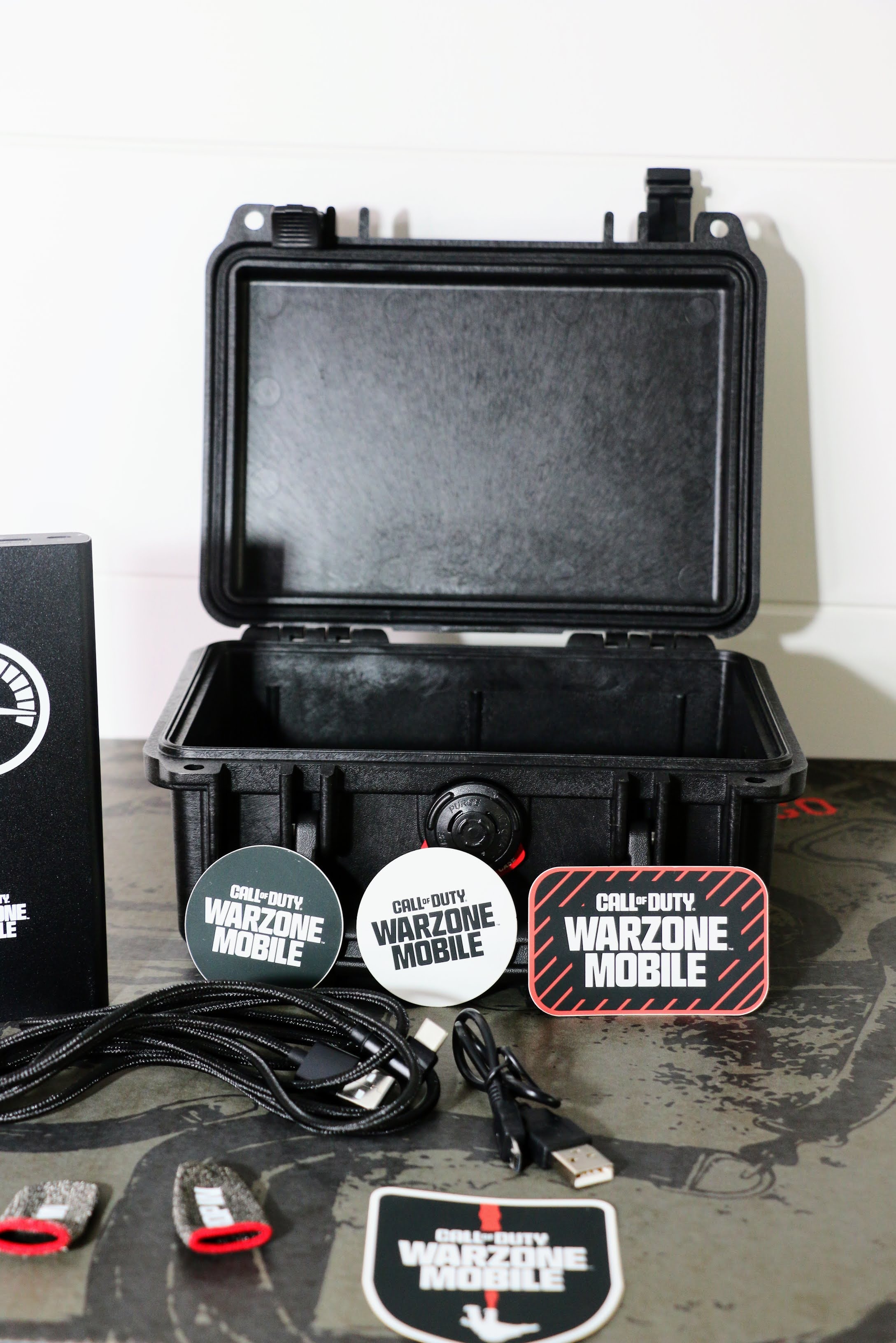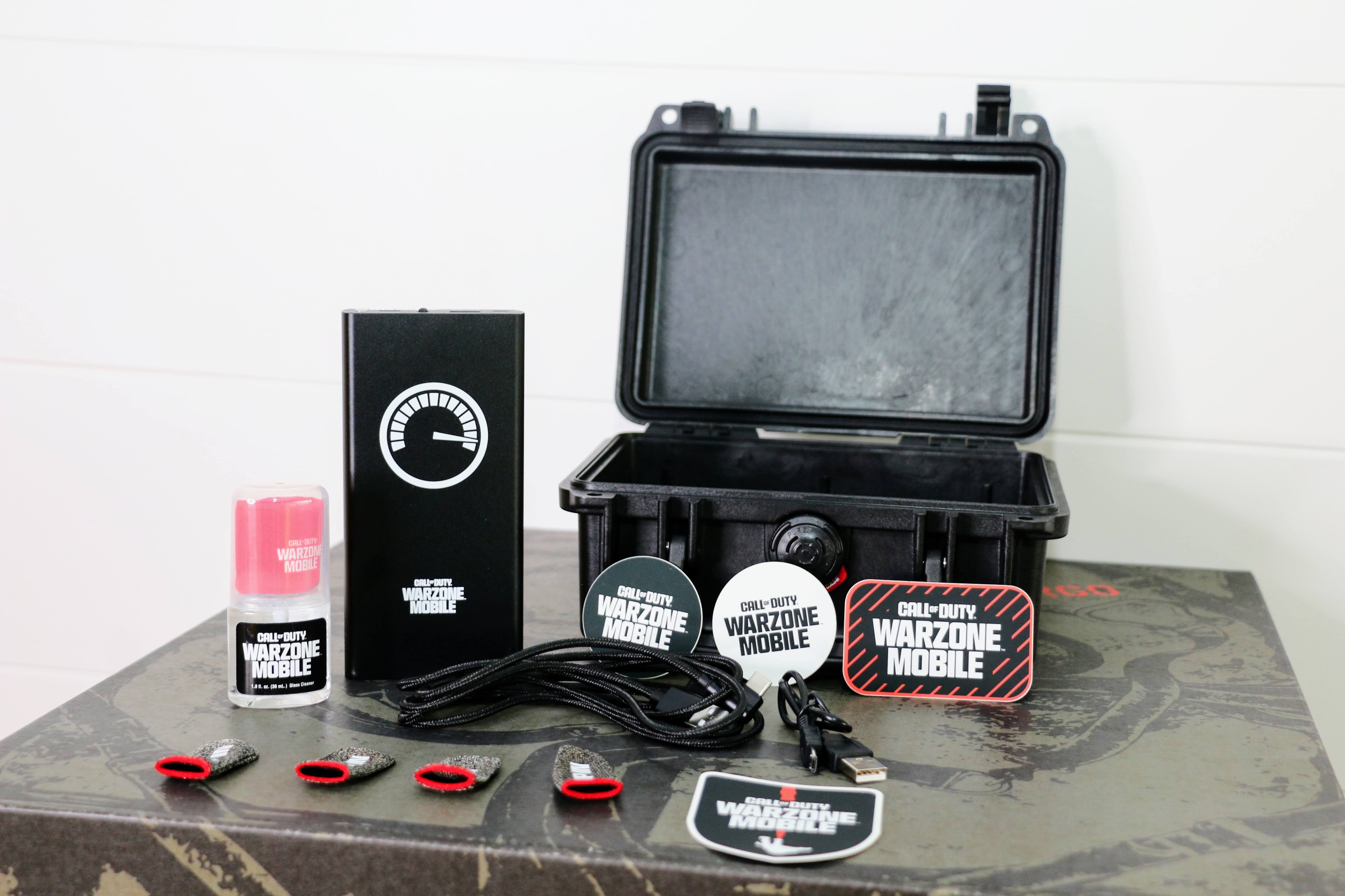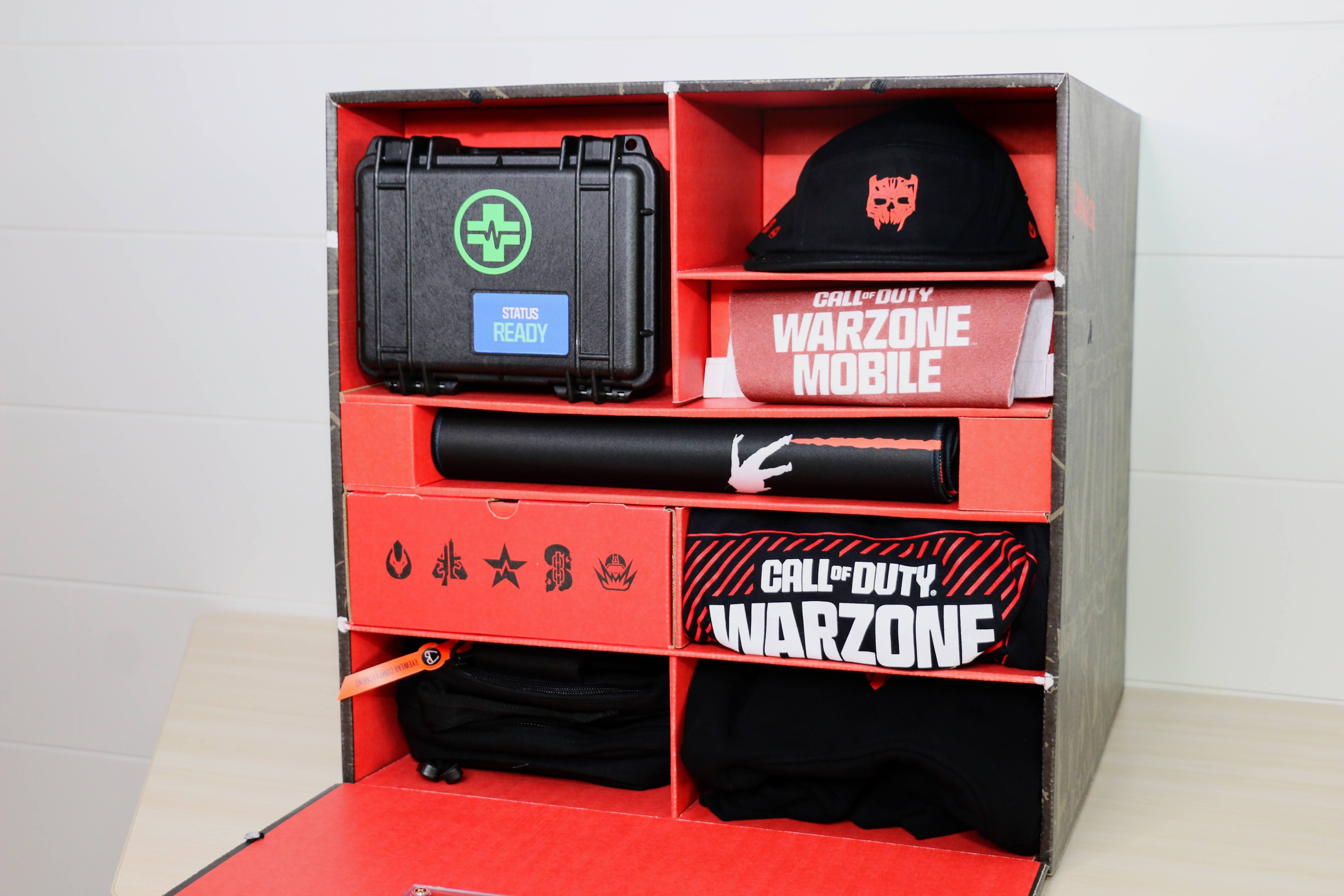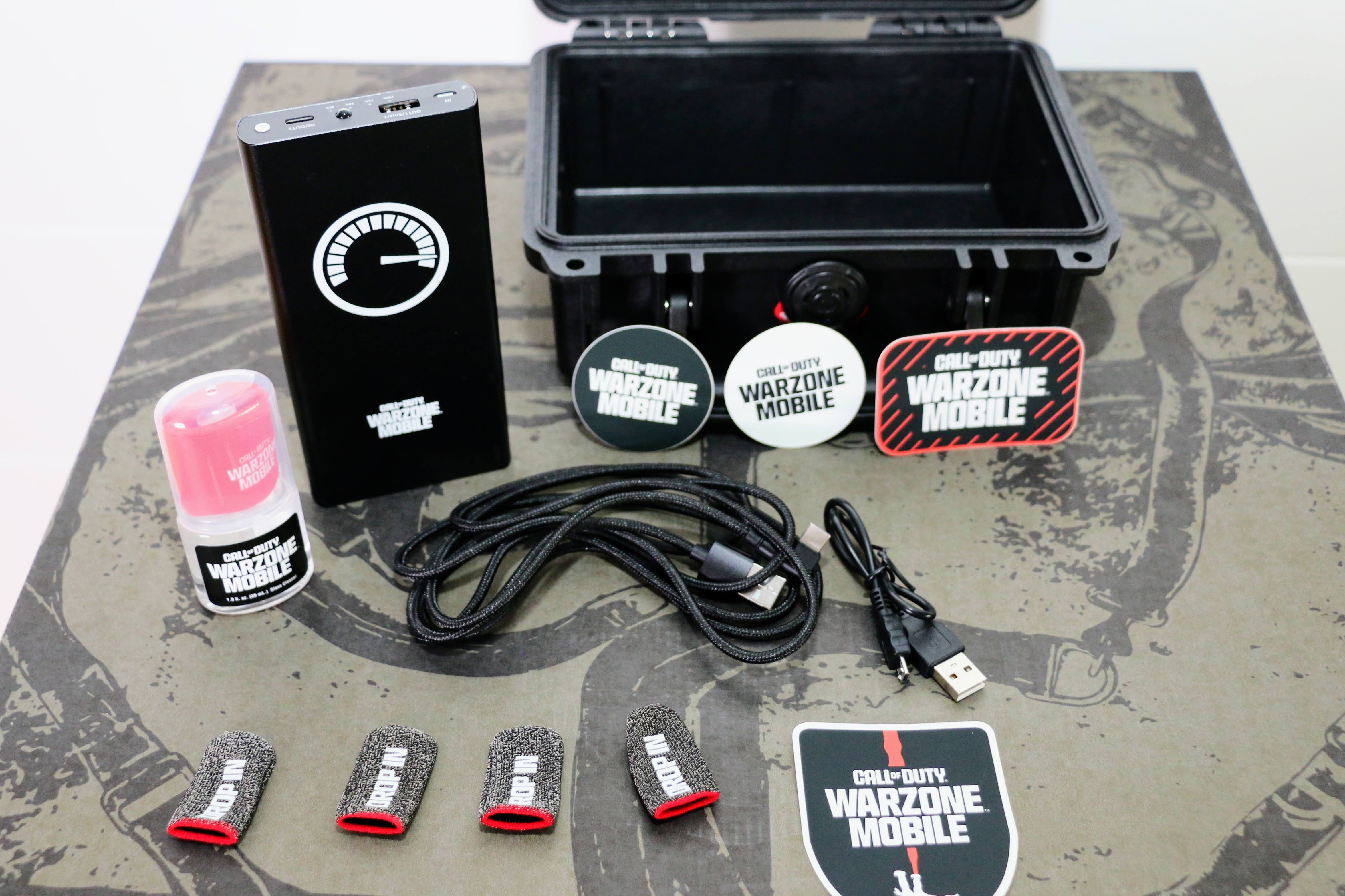 決勝時刻:現代戰域 Mobile》禮盒相當龐大,而內容物也是琳瑯滿目,從帽子、背包、T 恤、連帽上衣、行動電源、手機架、掛旗、滑鼠墊、眼鏡清潔液、徽章、貼紙到指套,讓人目不暇給,以下將透過圖片及影片的方式呈現。