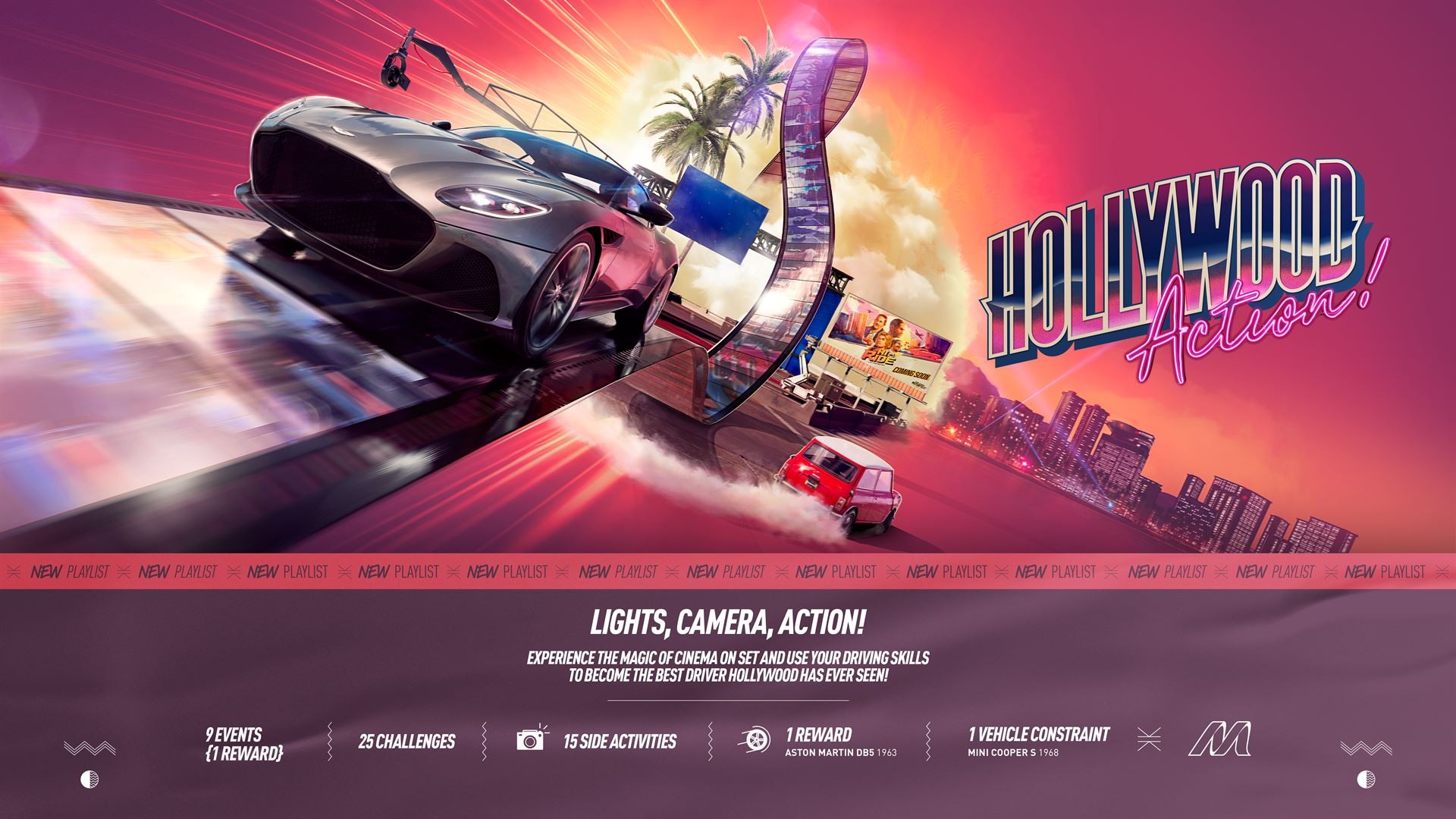 全新的「Hollywood Action!」遊玩清單。在壯闊重現的強檔電影場景中,玩家將在即將上映的電影《Hi-Ride》裡飾演主角,為拍出史上最精彩的動作強片貢獻一己之力。玩家將駕駛一些大銀幕上最經典的車輛,在「破壞性駕駛」中考驗自己的駕駛技巧,盡可能地大量破壞物體,讓場面變得更加壯觀;或者在「拍攝路線」中緊跟著導演的鏡頭,面對充滿挑戰的路線。化身充滿抱負的電影明星的玩家,必須完成 9 項刺激無比的主要賽事,才有機會解鎖最著名的經典間諜座駕 Aston Martin DB5(1963)。