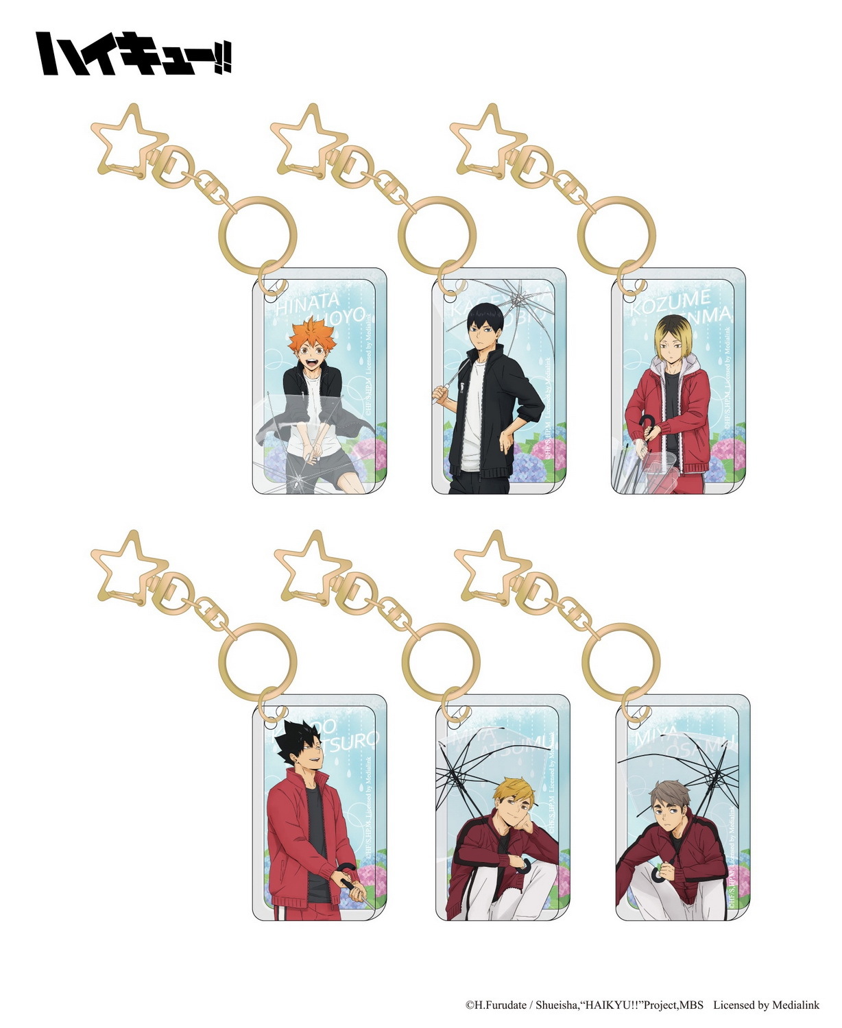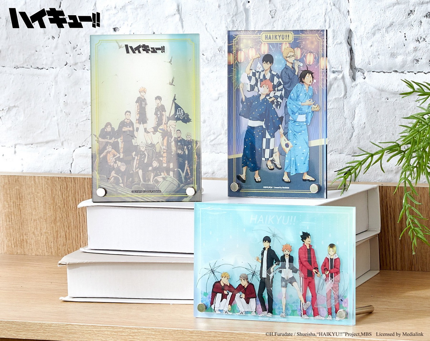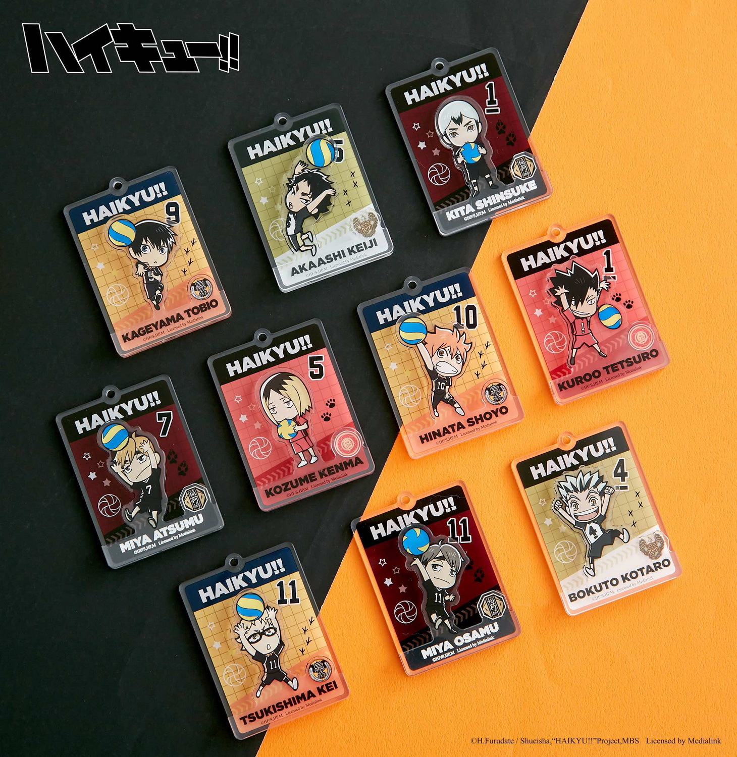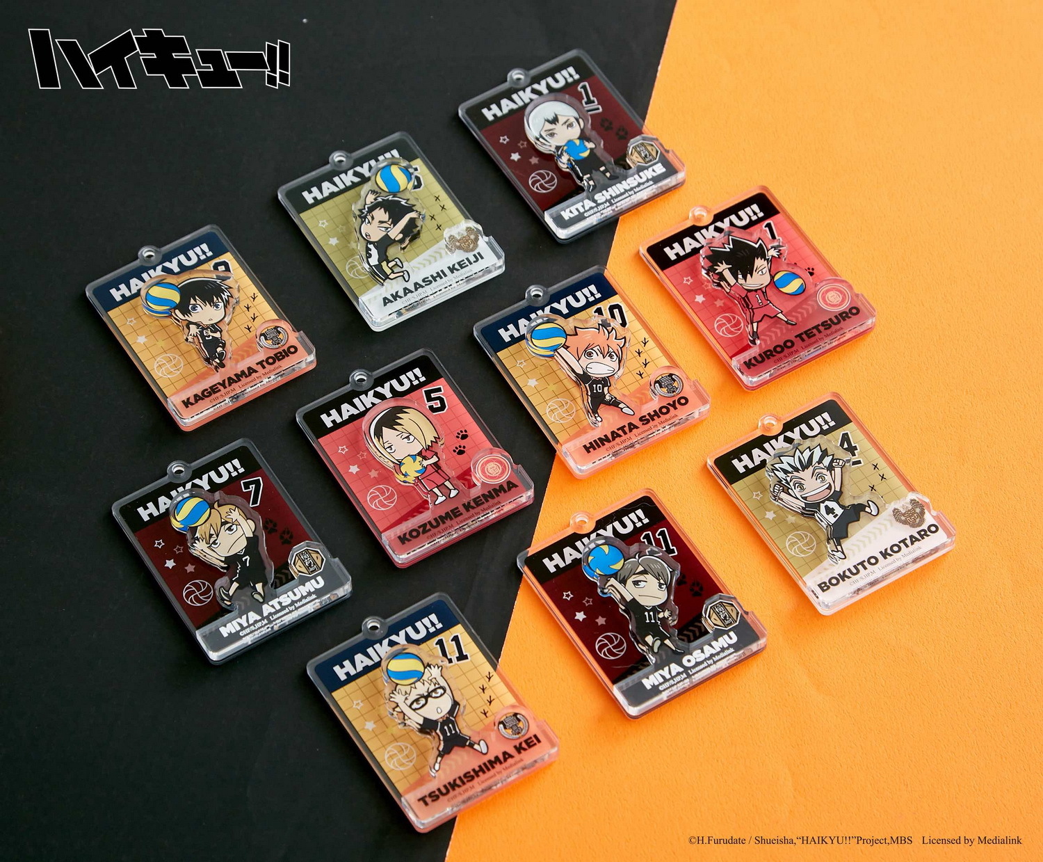 鑰匙圈幾個都不嫌多,想要有殺球的日向、攔網的黑尾或托球的宮侑等 10 個角色「雙層鑰匙圈」嗎?還是有著日向、影山及研磨等六個角色撐著與雨傘的日常生活感「壓克力鑰匙圈」任你選!兩款「角色抱枕」不論是認真托球的影山款,還是準備殺球的日向款,都讓人想要一把抱住啊!這些男人太危險了!「壓克力相框」有著換上和服參加祭典的烏野一年級生款、烏野排球隊全員垃圾場款以及六位人氣角色的撐傘款,款款令人瘋狂!還有小動物「摩天輪組」讓你組合出有各隊球員動物化的摩天輪,叫人怎麼能不收藏?看了就心情好的「壓克力磚」日向與影山兩人殺球的動作真是帥到爆!