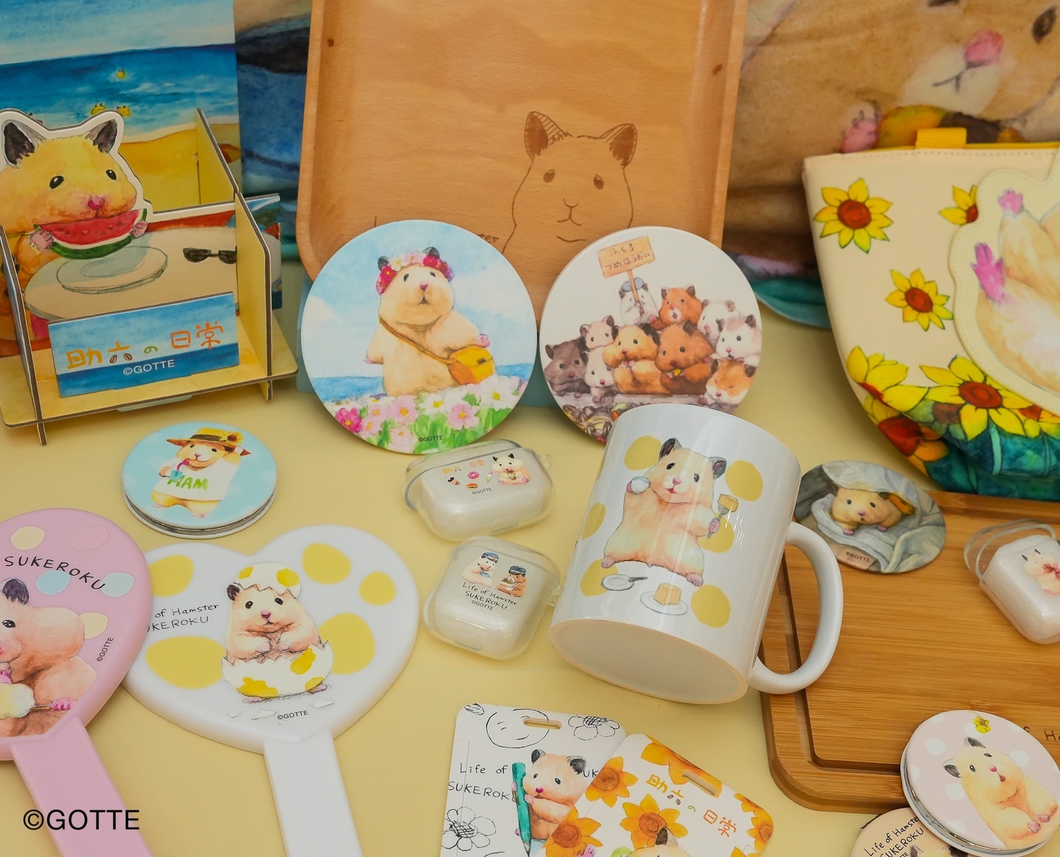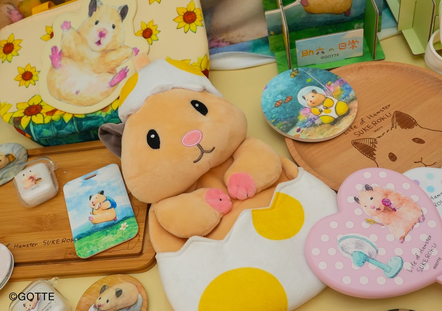 新春想要好喜氣、討吉祥,可別錯過這些求吉小物!助六破蛋而出的愛心「手拿鏡」,還有助六吹電扇及助六吃東西等四款,春天就要這樣充滿生命力!助六跟最愛的向日葵交織等三款圖案「口罩吊繩」,帶在身上陪你一起抵抗病菌!「飲料提袋」有助六一雙小手合十、擺出祈福動作,和助六打鼓兩款,外出拿飲料也方便!「陶瓷杯墊」除了有助六戴花圈在海邊度假,還有助六海底探險及助六與小夥伴上市場共三款,看著小倉鼠爭先恐後挑菜的興奮模樣,今年必定大吉大利!「手機架」有助六在向日葵田漫步、助六吃西瓜及助六接電話三款,放辦公室或家裡都適合,讓助六陪你一起努力!