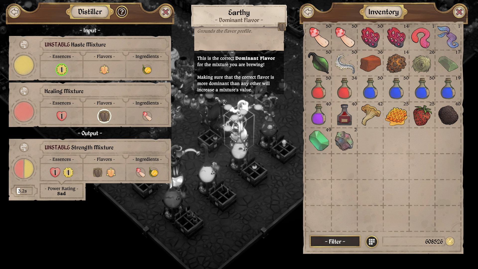 色彩繽紛美術風格設計,加上經典奇幻幽默,並保持舒適的煉金術體驗;多種環境等玩家探險並收集原料。玩家要用種類豐富的工作站打造全自動生產線來生產藥水;平衡液體比例、將效果提到最高、選擇正確的原料、取得味道平衡,再將其全部裝進你盡全力製作的瓶子中。只要商品讓客人開心,他們就會再上門,不過英雄想要的藥水不見得都一樣,所以玩家要要花時間好好了解你的顧客;隨著他們的等級提高,他們就需要更强大、更先進的藥劑。