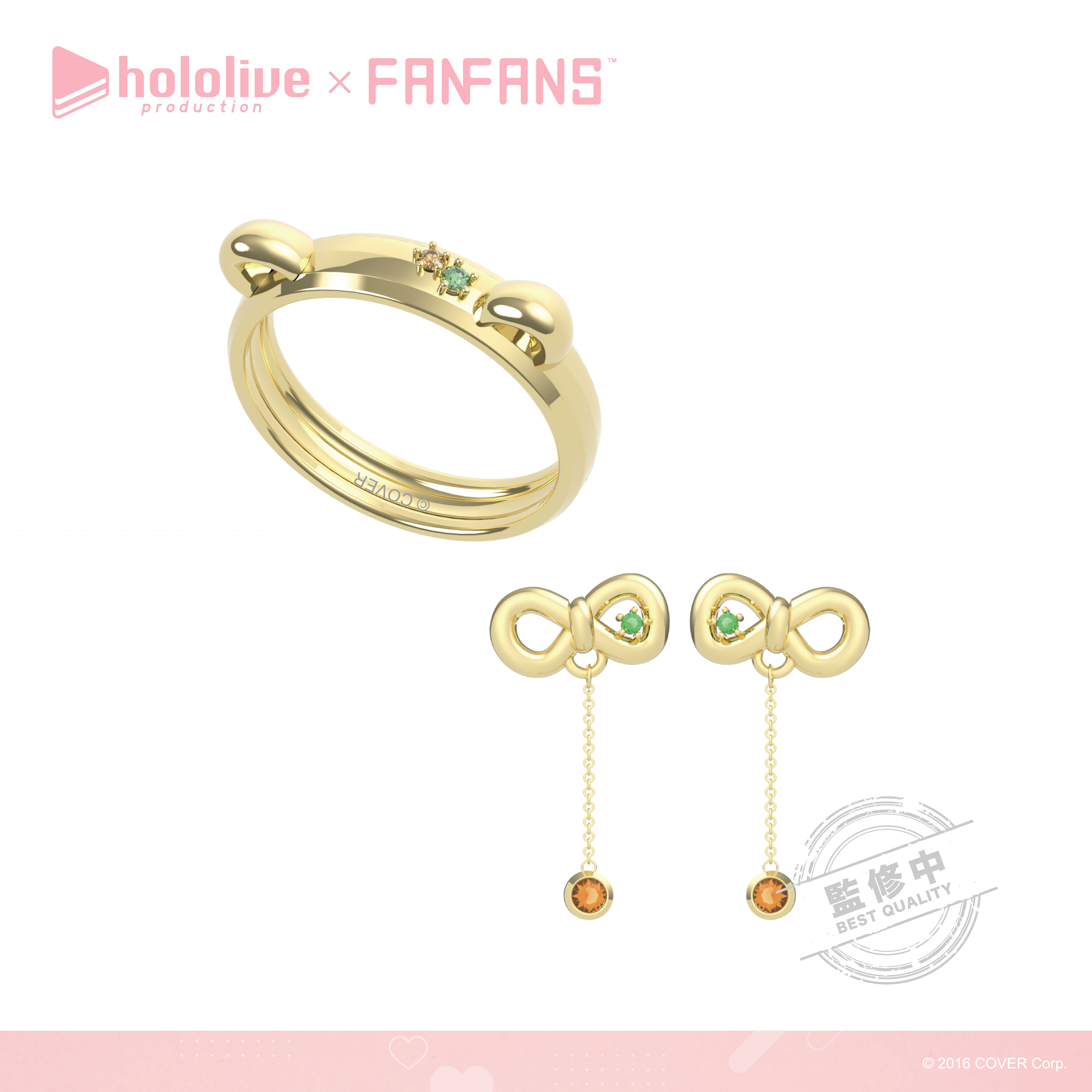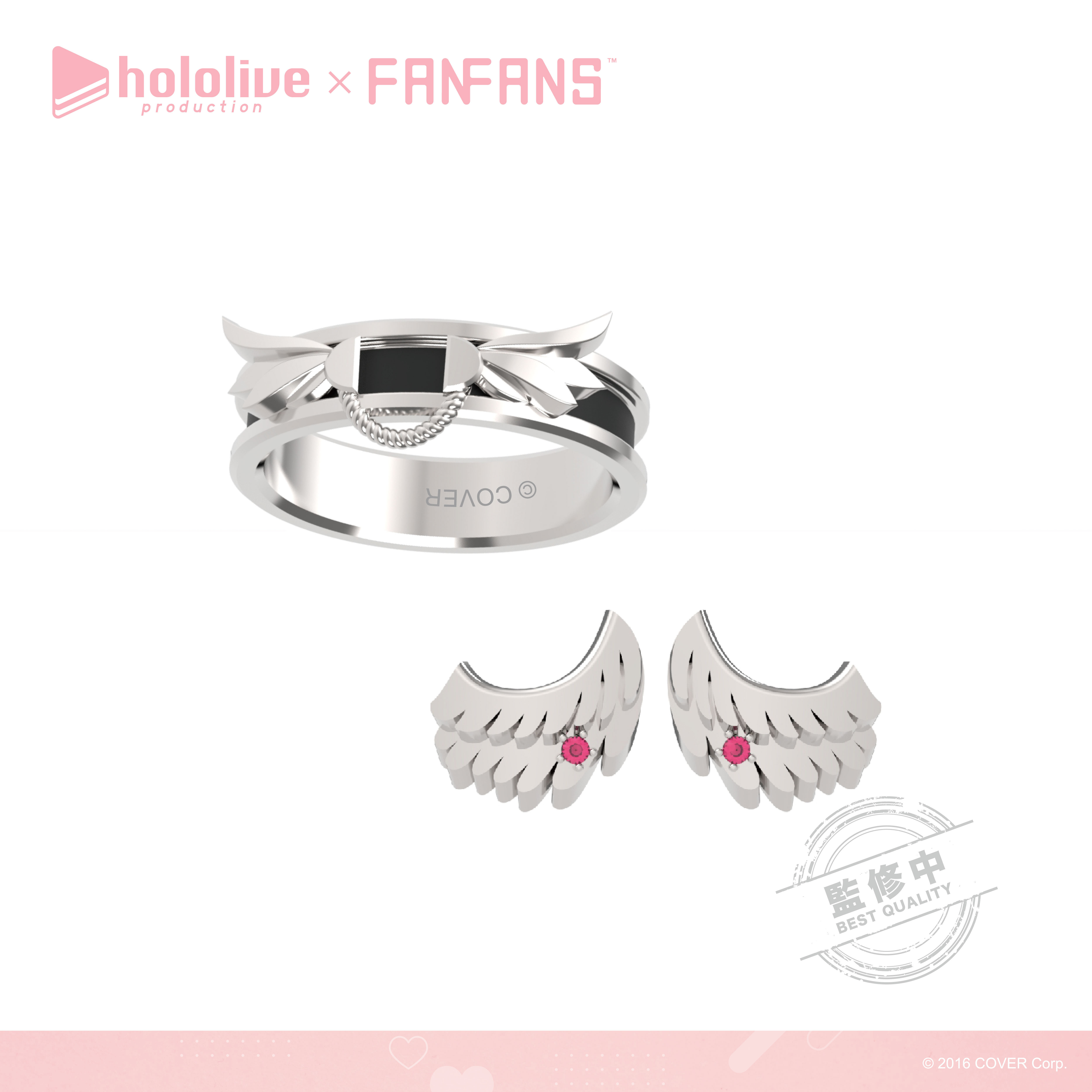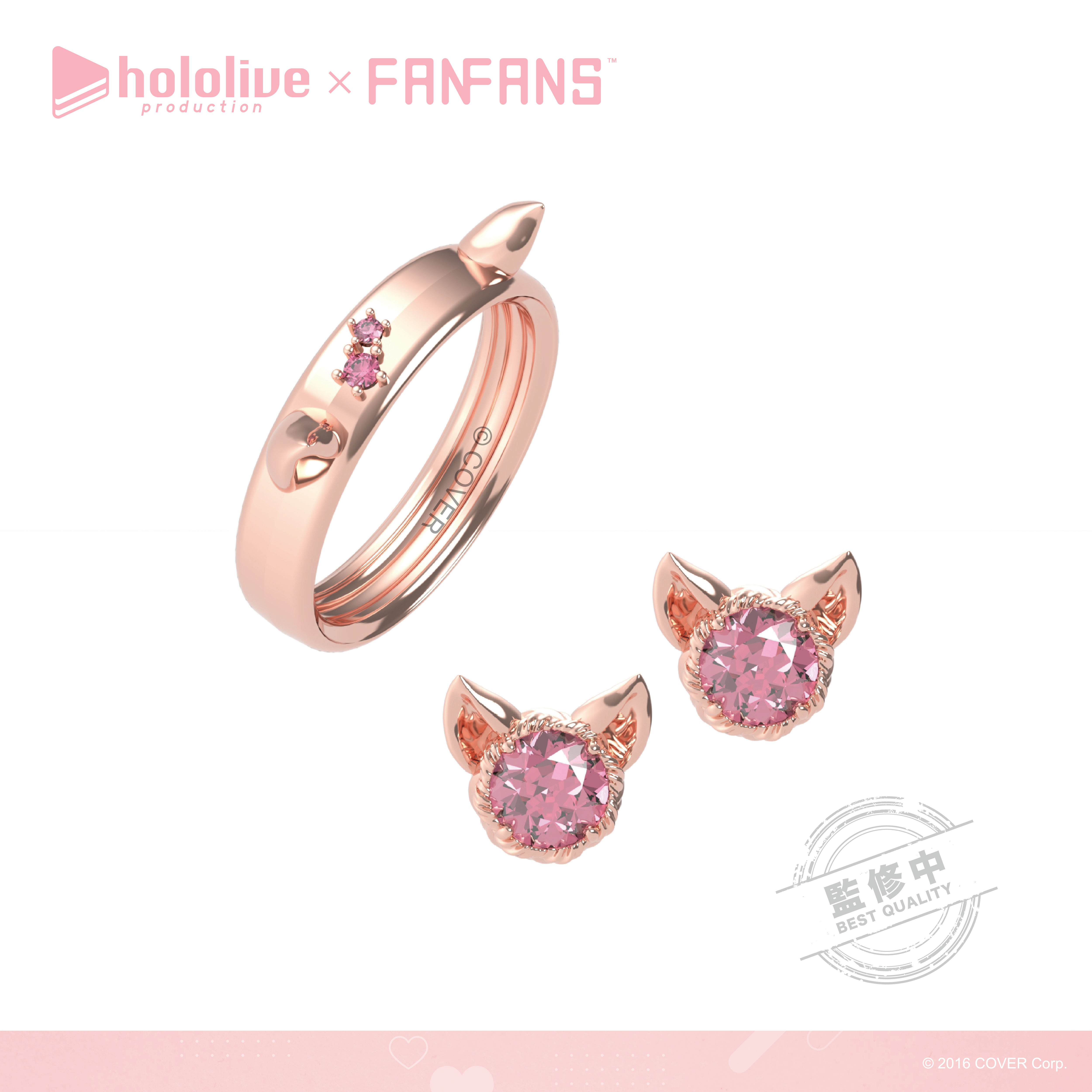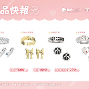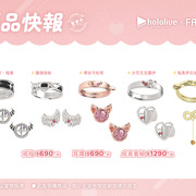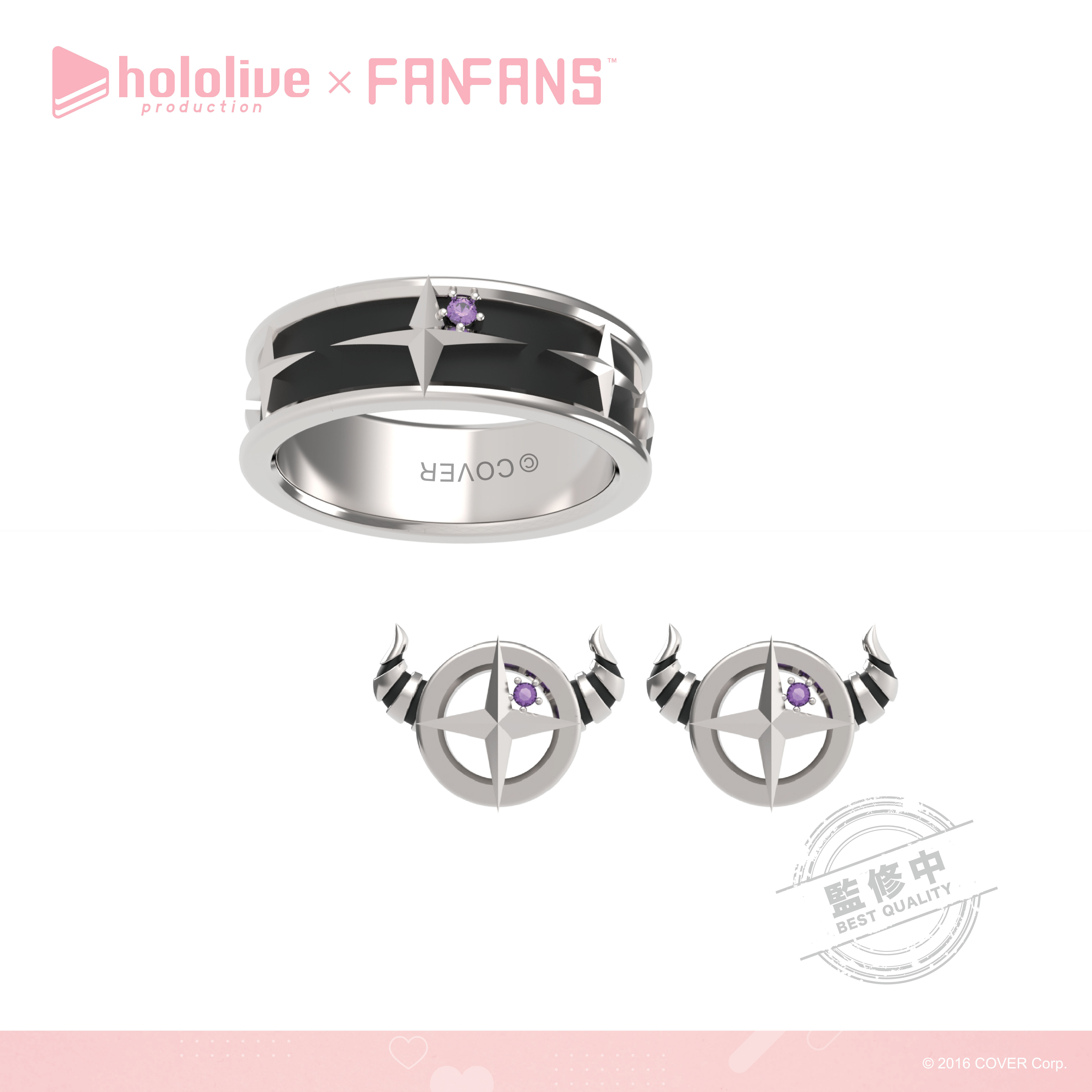 「拉普拉斯.暗黑」以霸氣感十足的粗黑戒指,配上代表拉普拉斯的十字圖案及紫色鋯石,耳環更立體還原了拉普拉斯的尖角。「鷹嶺琉依」將琉依大衣上的翅膀扣鍊元素融合黑色戒指,以不一樣的設計帶出琉依姊的氣場,耳環則是風格典雅的翅膀元素;「博衣可佑理」以玫瑰色系戒指,配上立體的郊狼耳朵,耳環則是以狼耳造型搭配大顆粉色鋯石。;「沙花叉克蘿伊」戒指和耳環皆採用了大衣上的愛心型裝飾,搭配經典紅色小鋯石。;「風真伊呂波」則在淡金色的戒指上做出立體的可愛小狸貓ぽこべぇ的耳朵,加上代表伊呂波的黃色及綠色鋯石,搭配結飾風格的耳環。