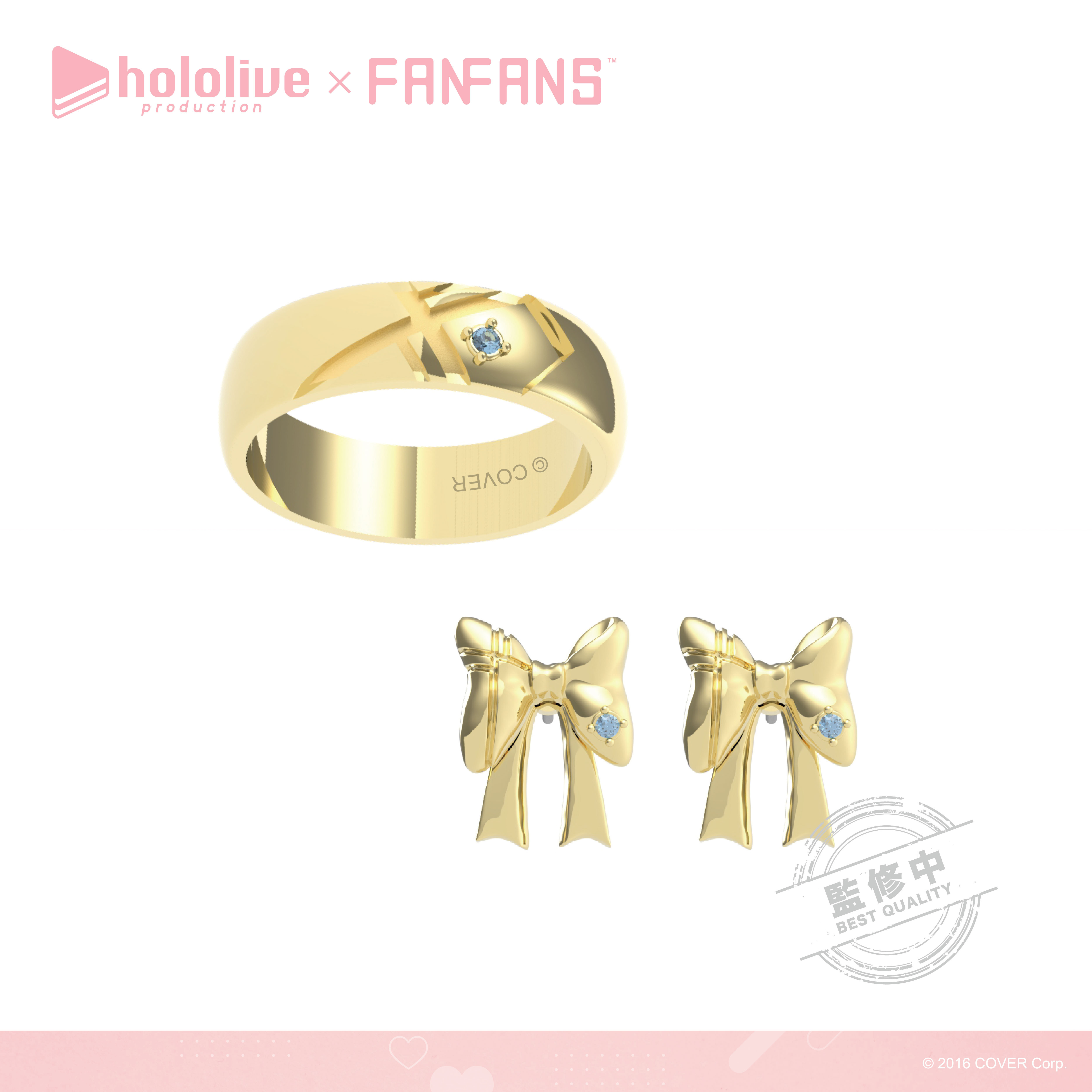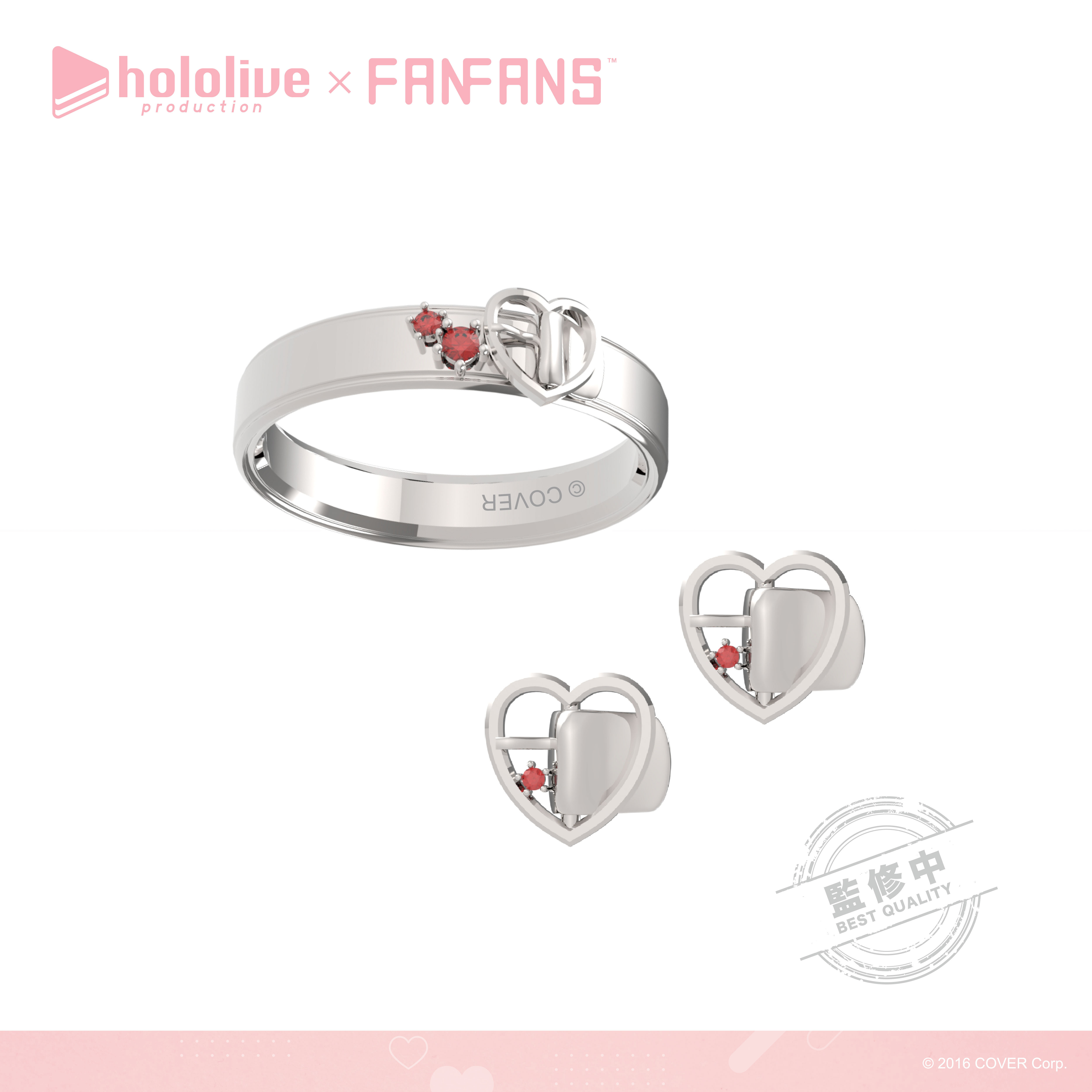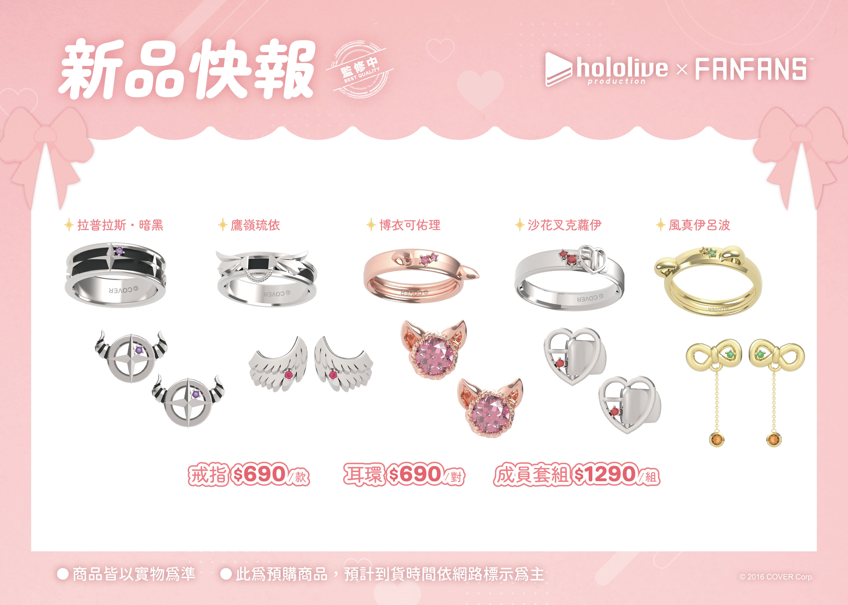 「拉普拉斯.暗黑」以霸氣感十足的粗黑戒指,配上代表拉普拉斯的十字圖案及紫色鋯石,耳環更立體還原了拉普拉斯的尖角。「鷹嶺琉依」將琉依大衣上的翅膀扣鍊元素融合黑色戒指,以不一樣的設計帶出琉依姊的氣場,耳環則是風格典雅的翅膀元素;「博衣可佑理」以玫瑰色系戒指,配上立體的郊狼耳朵,耳環則是以狼耳造型搭配大顆粉色鋯石。;「沙花叉克蘿伊」戒指和耳環皆採用了大衣上的愛心型裝飾,搭配經典紅色小鋯石。;「風真伊呂波」則在淡金色的戒指上做出立體的可愛小狸貓ぽこべぇ的耳朵,加上代表伊呂波的黃色及綠色鋯石,搭配結飾風格的耳環。