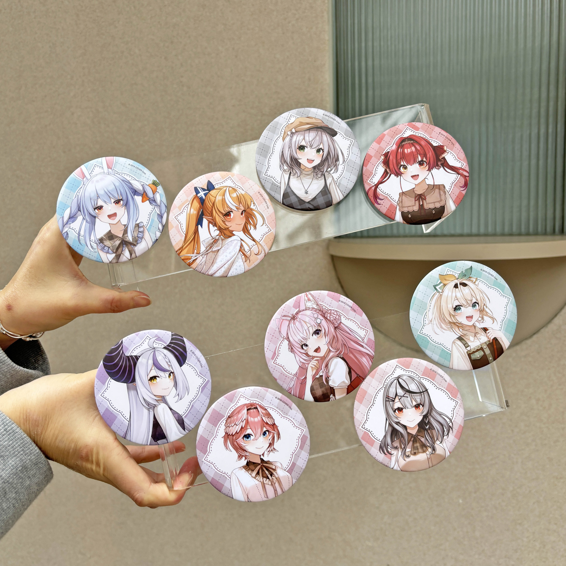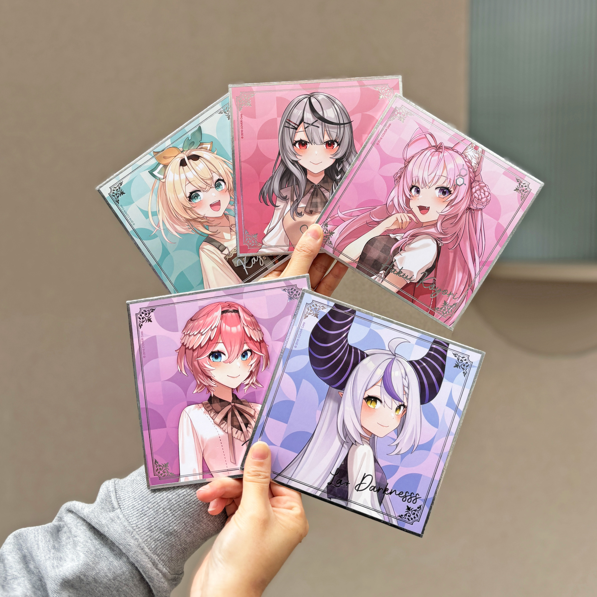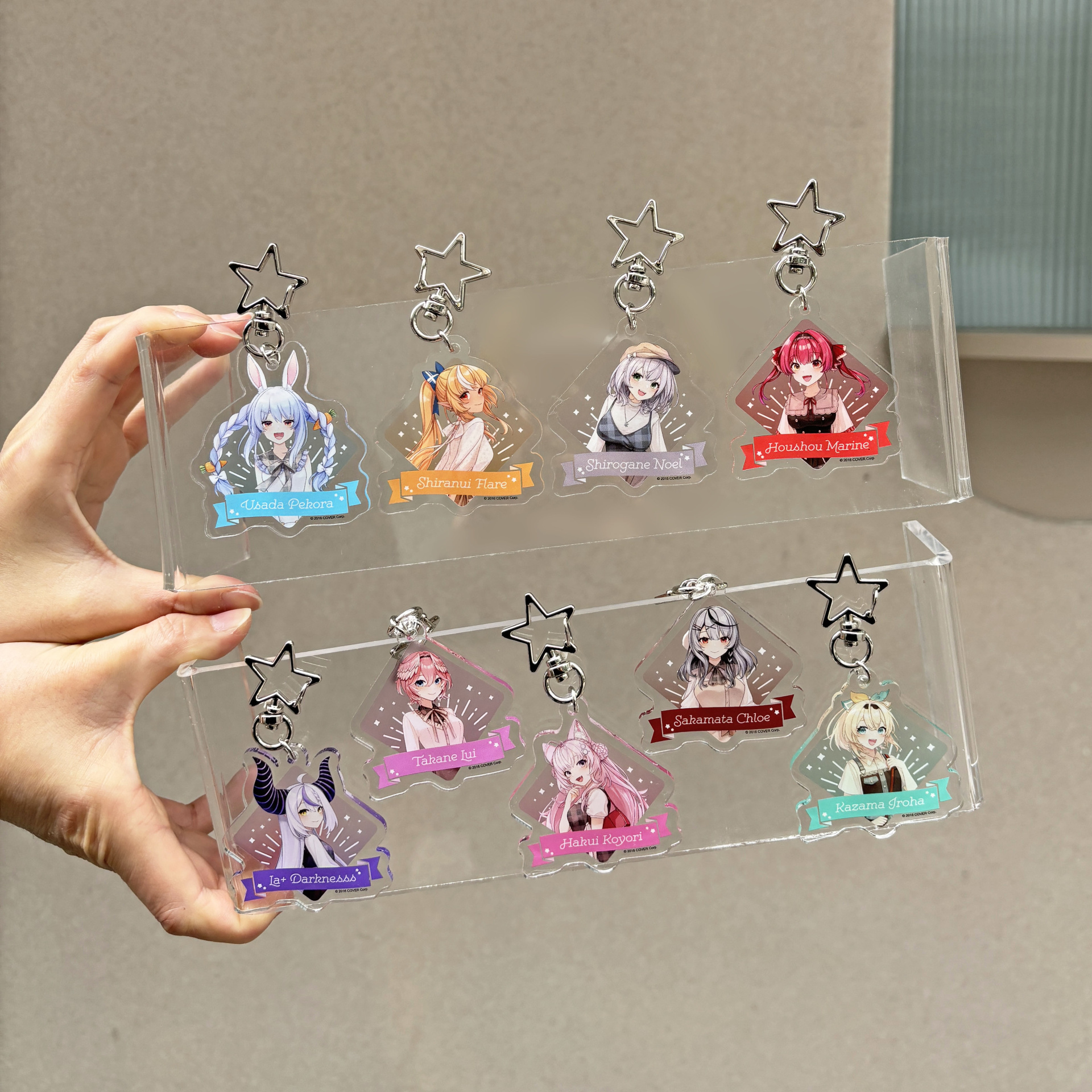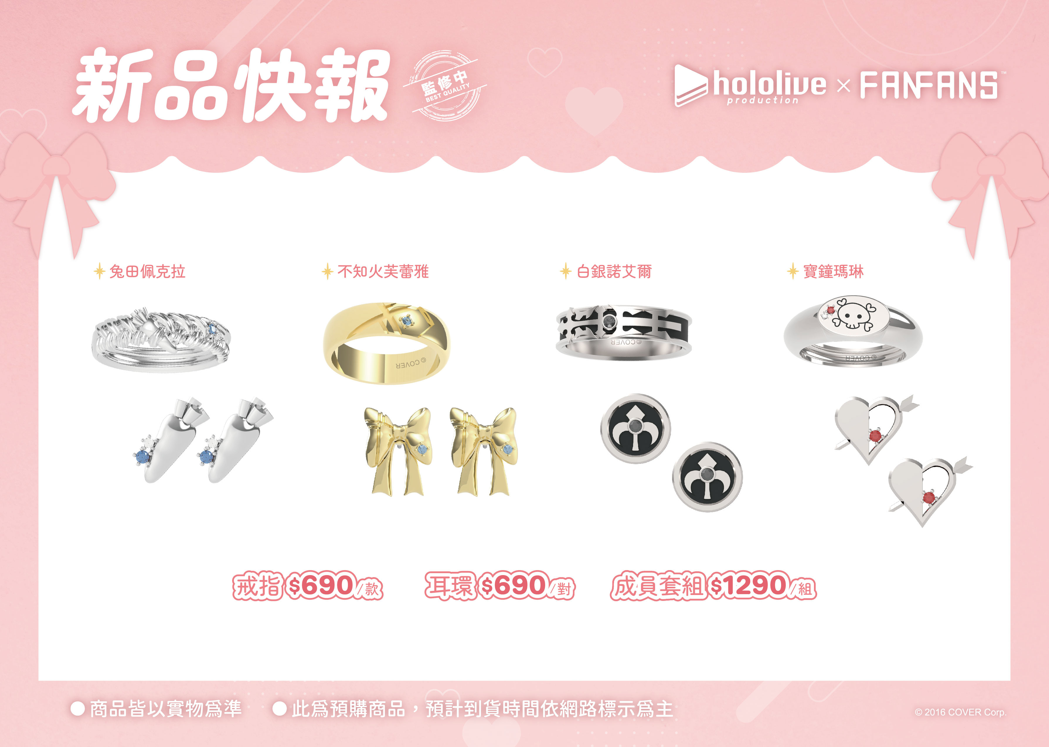 「拉普拉斯.暗黑」以霸氣感十足的粗黑戒指,配上代表拉普拉斯的十字圖案及紫色鋯石,耳環更立體還原了拉普拉斯的尖角。「鷹嶺琉依」將琉依大衣上的翅膀扣鍊元素融合黑色戒指,以不一樣的設計帶出琉依姊的氣場,耳環則是風格典雅的翅膀元素;「博衣可佑理」以玫瑰色系戒指,配上立體的郊狼耳朵,耳環則是以狼耳造型搭配大顆粉色鋯石。;「沙花叉克蘿伊」戒指和耳環皆採用了大衣上的愛心型裝飾,搭配經典紅色小鋯石。;「風真伊呂波」則在淡金色的戒指上做出立體的可愛小狸貓ぽこべぇ的耳朵,加上代表伊呂波的黃色及綠色鋯石,搭配結飾風格的耳環。