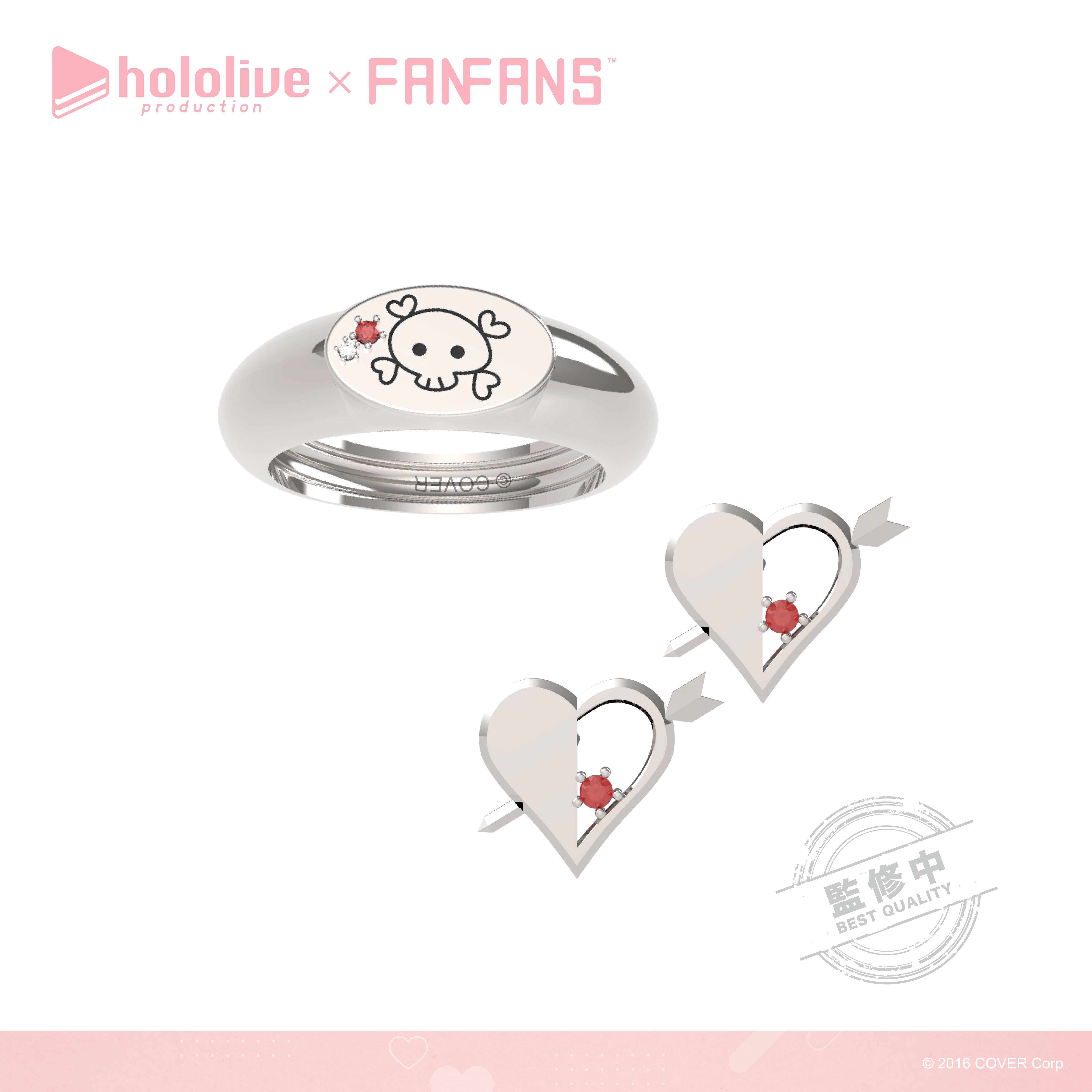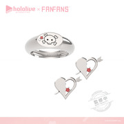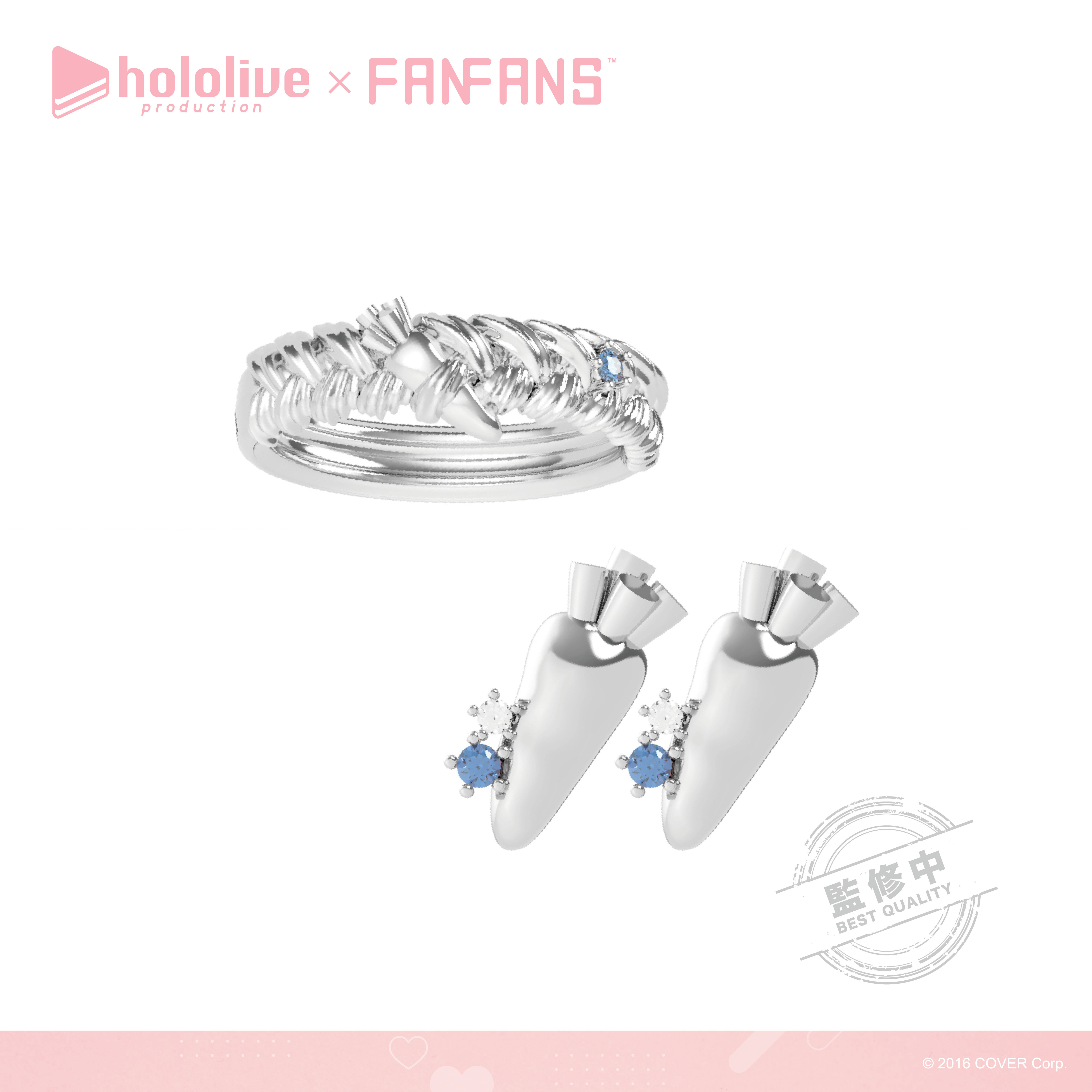 「兔田佩克拉」戒身紋路以佩克拉的辮子為設計概念,中間有著低調的銀色紅蘿蔔,耳環有著可愛的紅蘿蔔造型,搭配淡藍色鋯石。;「不知火芙蕾雅」在金色的戒指上刻有芙蕾雅蝴蝶結的交叉紋路,加上蝴蝶結造型的耳環和藍色鋯石。;「白銀諾艾爾」以中性的黑色戒指為底,融合騎士團服的紋章設計及黑色鋯石,配上圓盾型耳環。;「寶鐘瑪琳」採用瑪琳簽名上的骷髏圖案進行設計,上面有著紅色及白色小鋯石,耳環則是海盜旗幟上的招牌心型圖案。