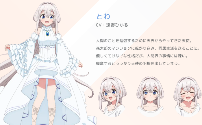作為奉神明之命來到人間學習與人類相關事物,而從天界降臨的天使,可愛的顏值,還有一看就知道惹火的身材,在外貌上就很是引人目光,更重要的是缺一根筋又單純溫和的個性,使得飛羽整個人散發一種軟軟綿綿,讓人看之不由自主跟著微笑的氣質,很是治癒。再加上賢慧的家事萬能屬性,讓森太郎與飛羽的同居生活就更像年輕的新婚夫婦,使作品充滿閃光和甜膩的氣息。