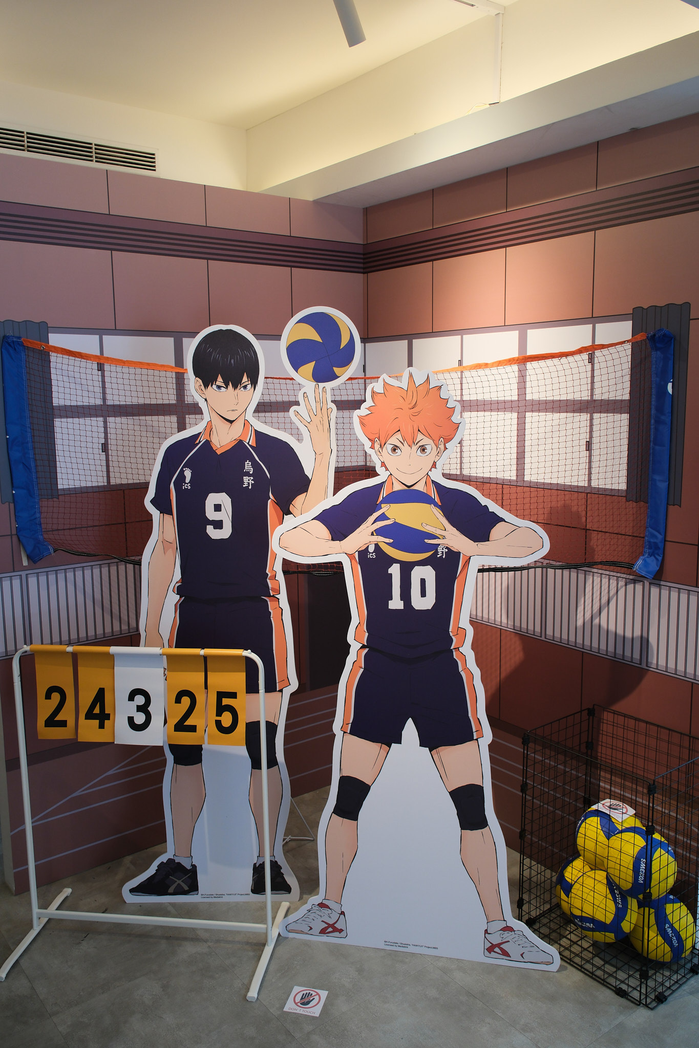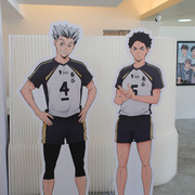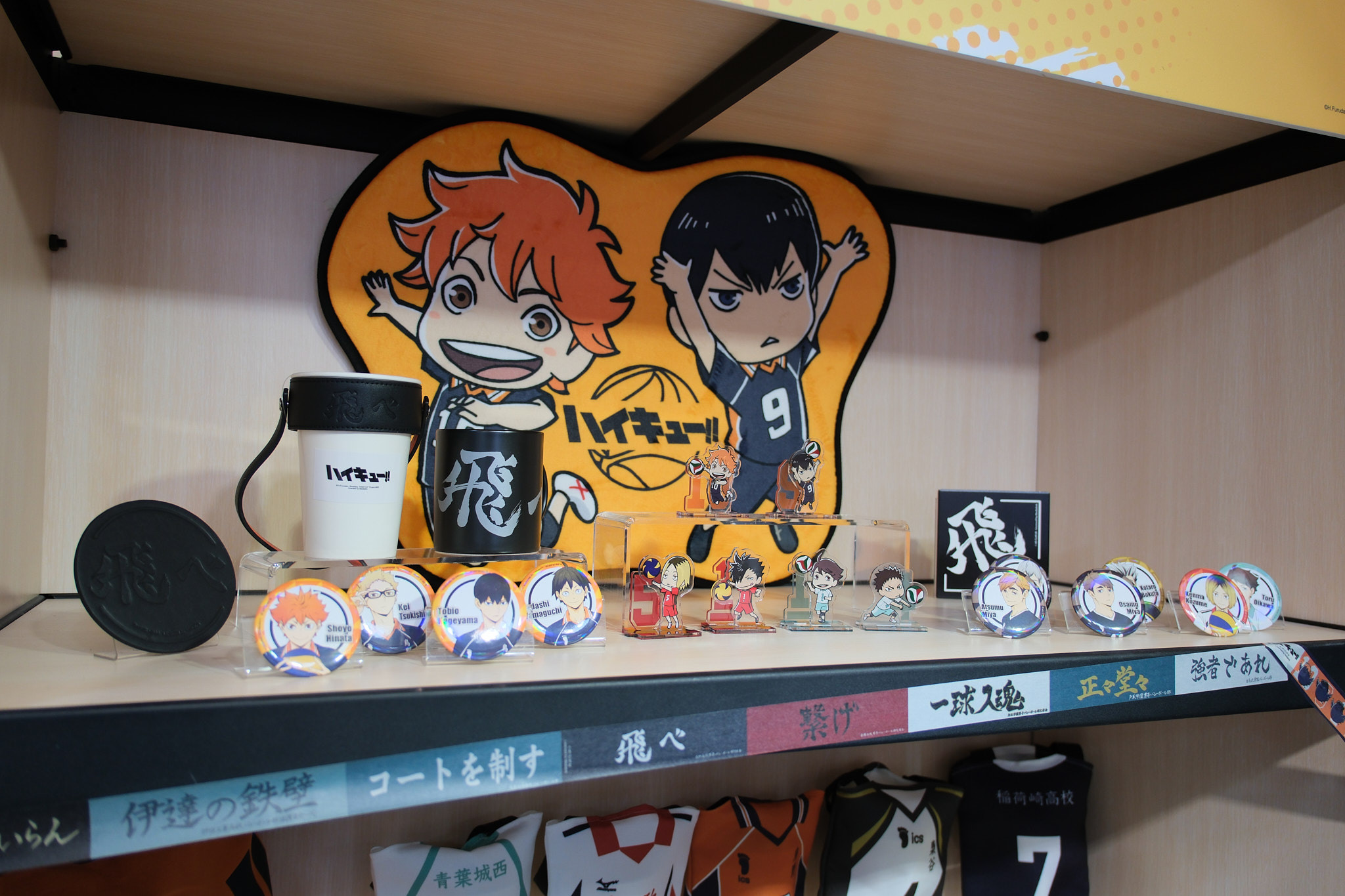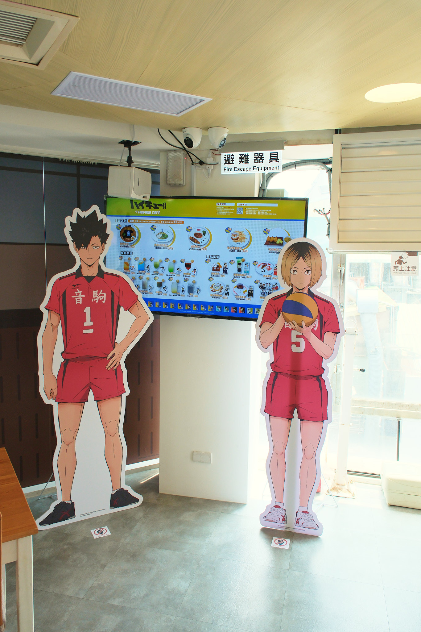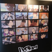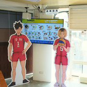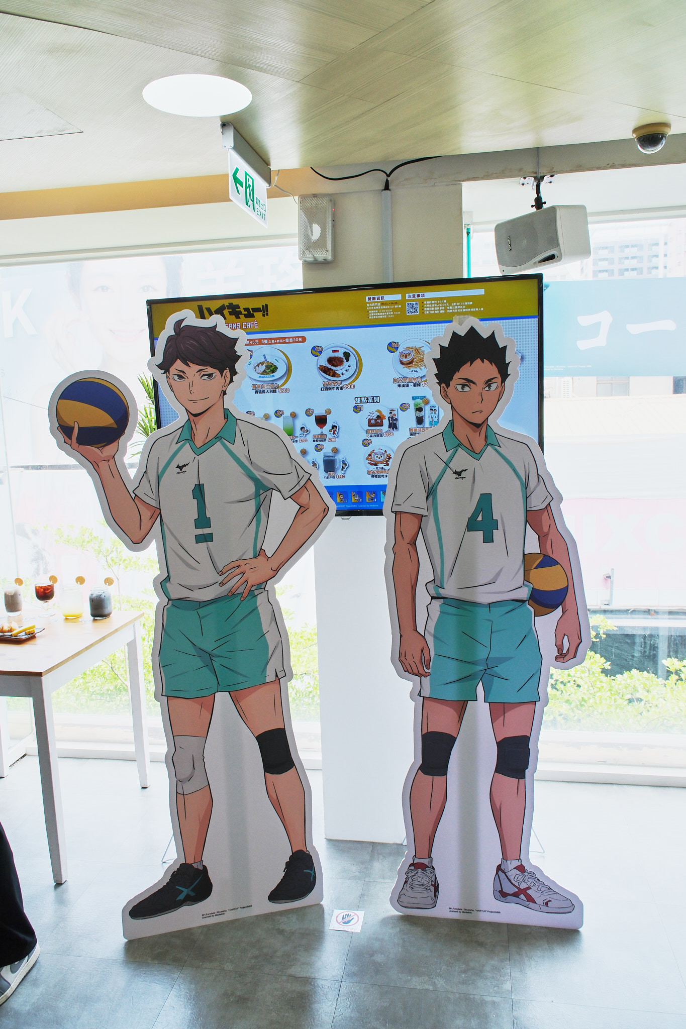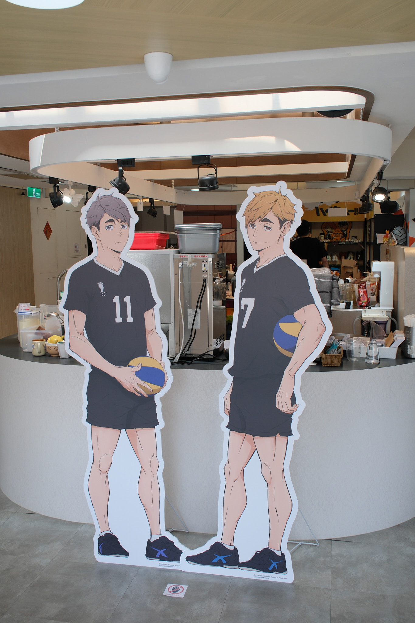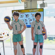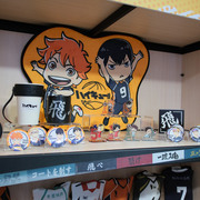 進到 FANFANS CAFÉ,就可以看到日向翔陽跟影山飛雄兩位主角在門口迎接各位。接著往內走可以看到木兔、赤葦,一旁展示了歷來 FANFANS 粉粉推出過的排球少年系列商品;圍繞著整個店內的還有岩泉、及川、孤爪、黑尾,以及宮侑、宮治兩兄弟,並且在店內還掛上了各校的旗幟裝飾。另外,這次《