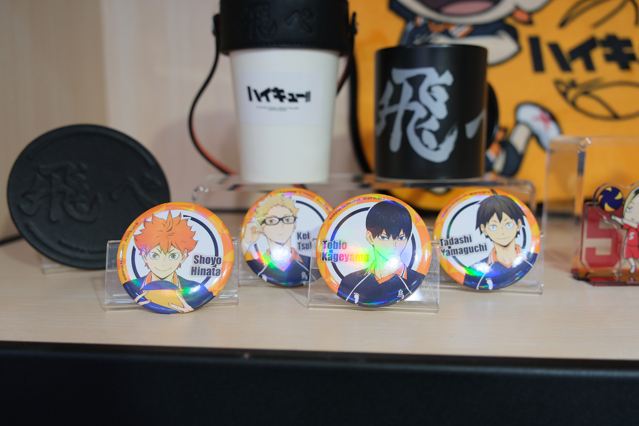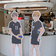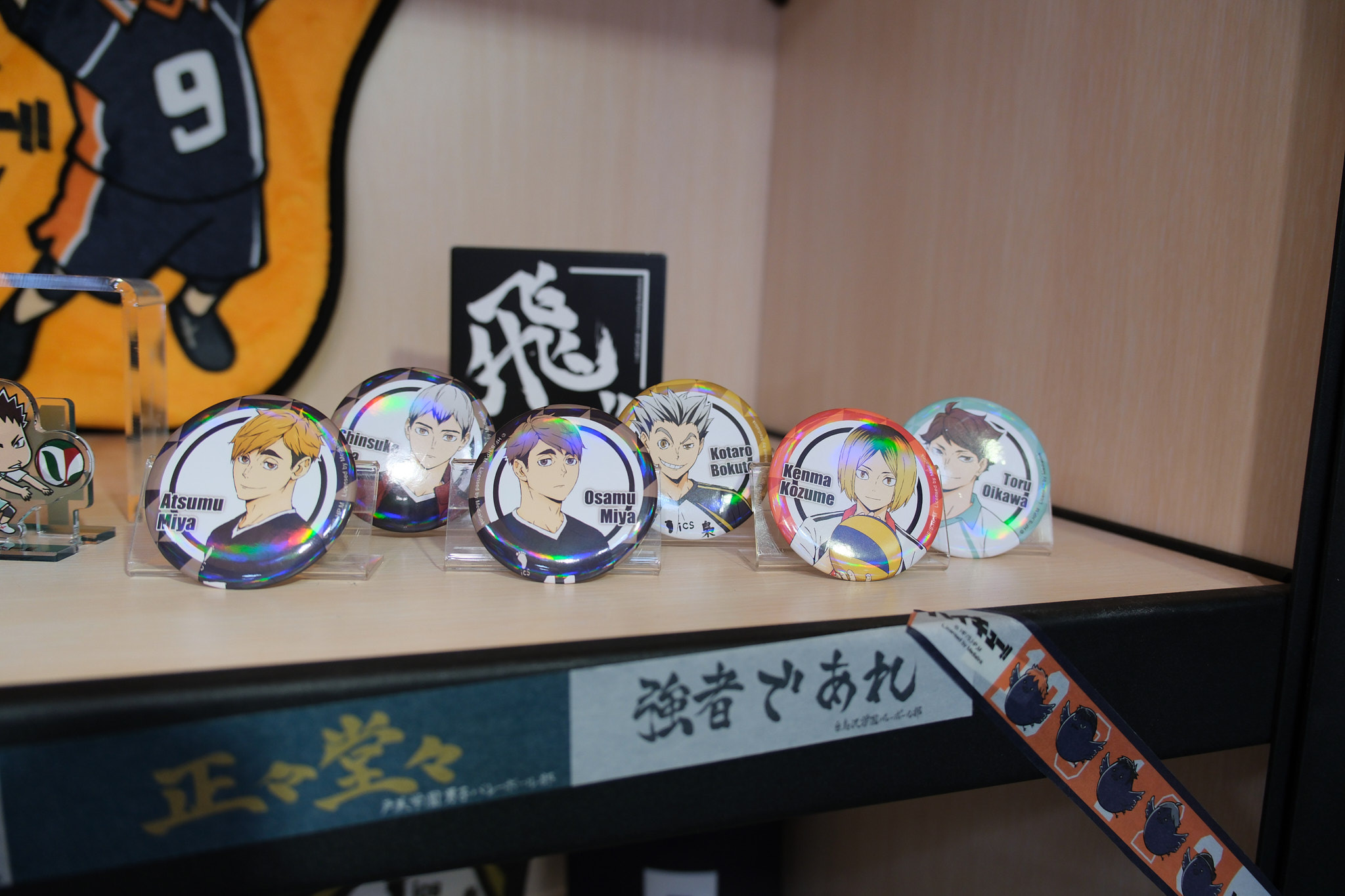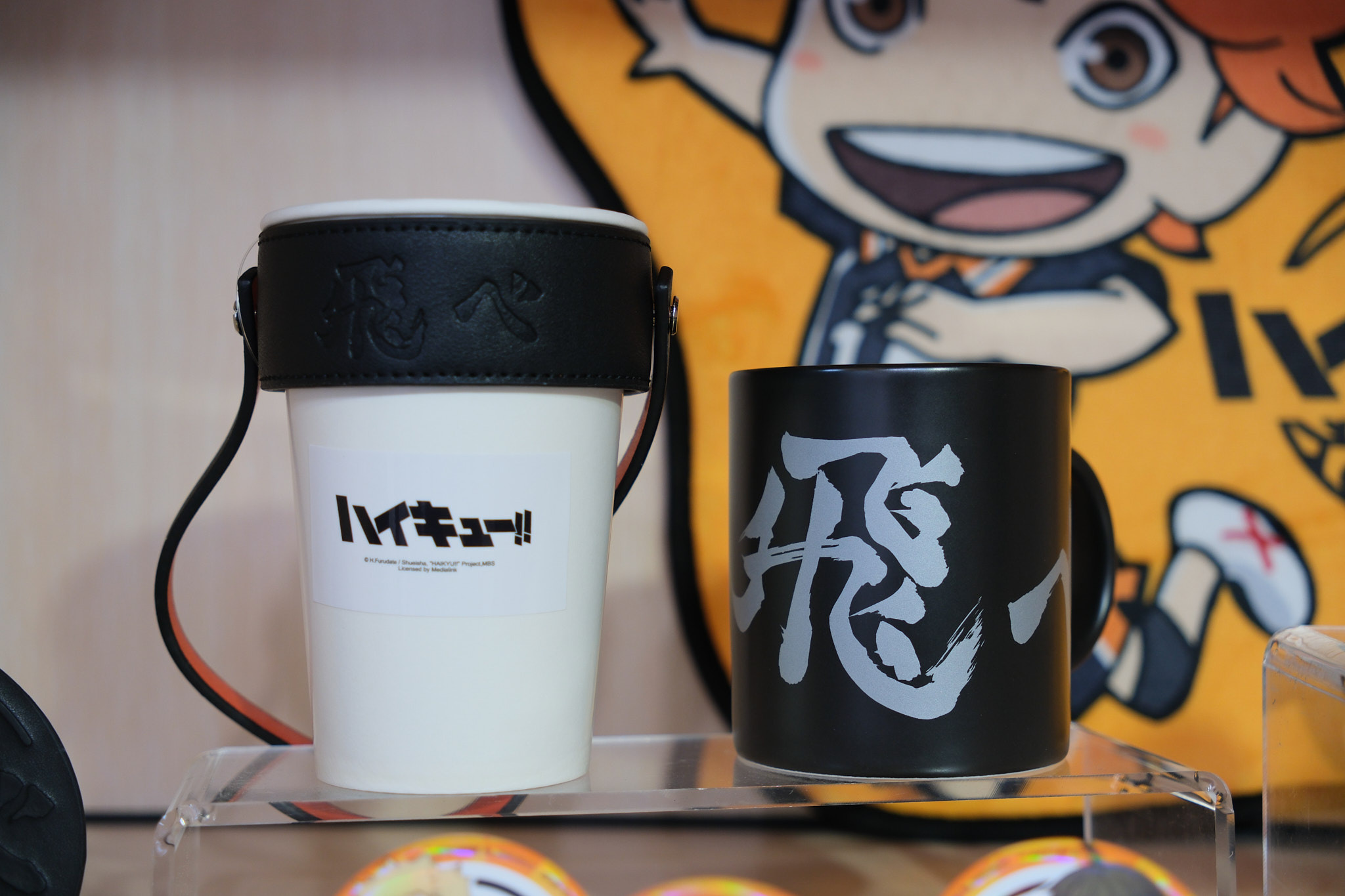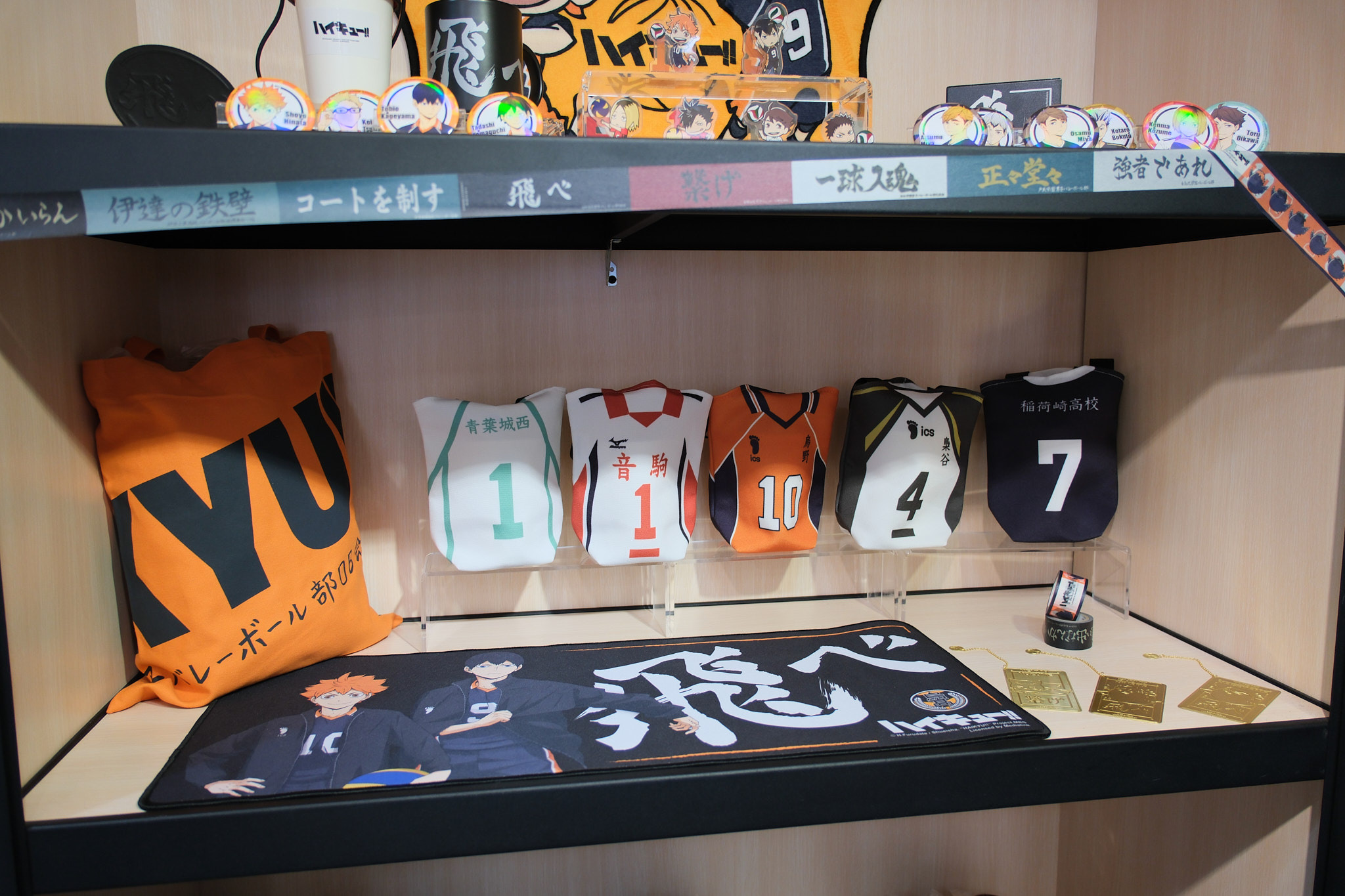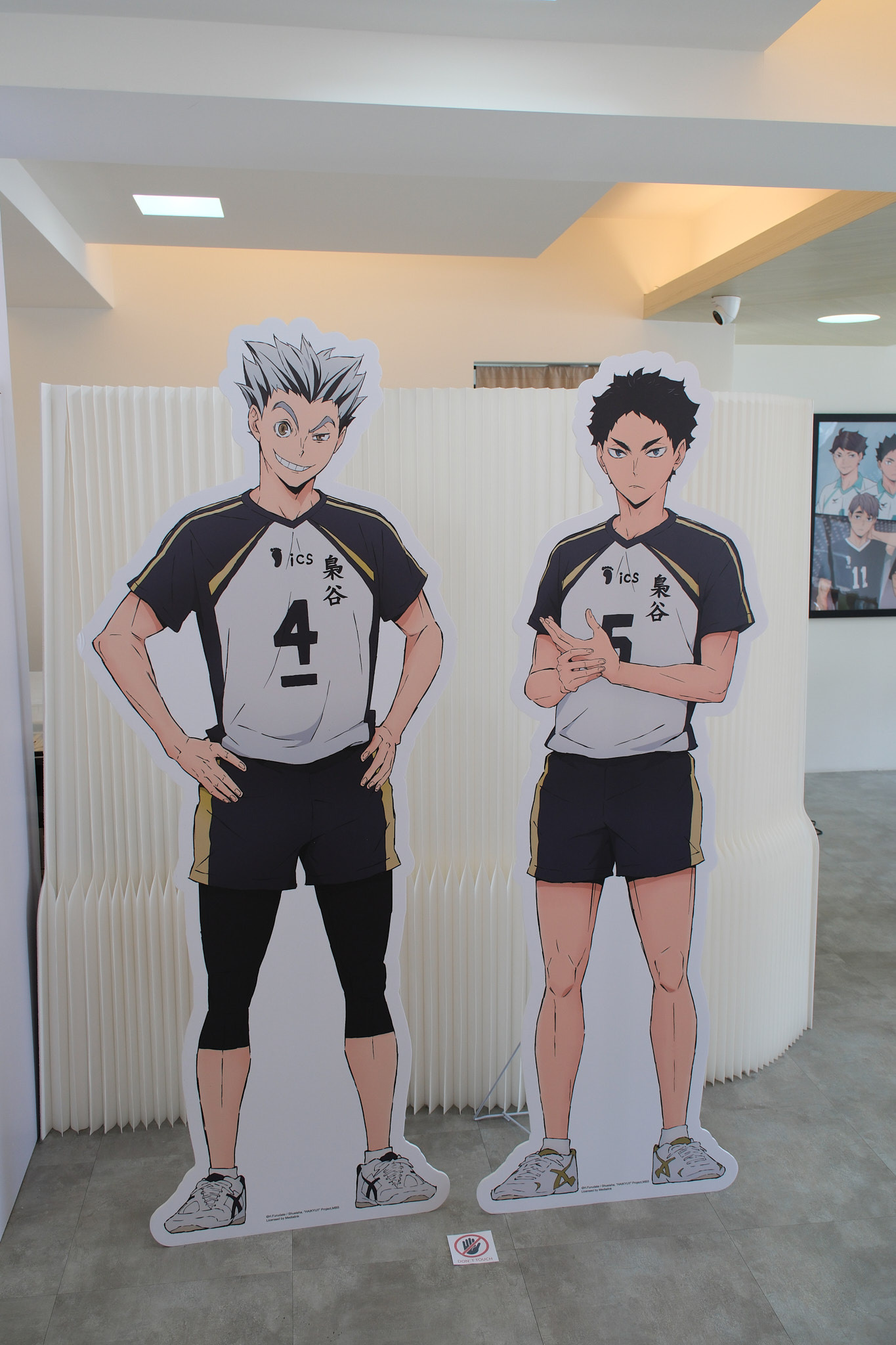 進到 FANFANS CAFÉ,就可以看到日向翔陽跟影山飛雄兩位主角在門口迎接各位。接著往內走可以看到木兔、赤葦,一旁展示了歷來 FANFANS 粉粉推出過的排球少年系列商品;圍繞著整個店內的還有岩泉、及川、孤爪、黑尾,以及宮侑、宮治兩兄弟,並且在店內還掛上了各校的旗幟裝飾。另外,這次《