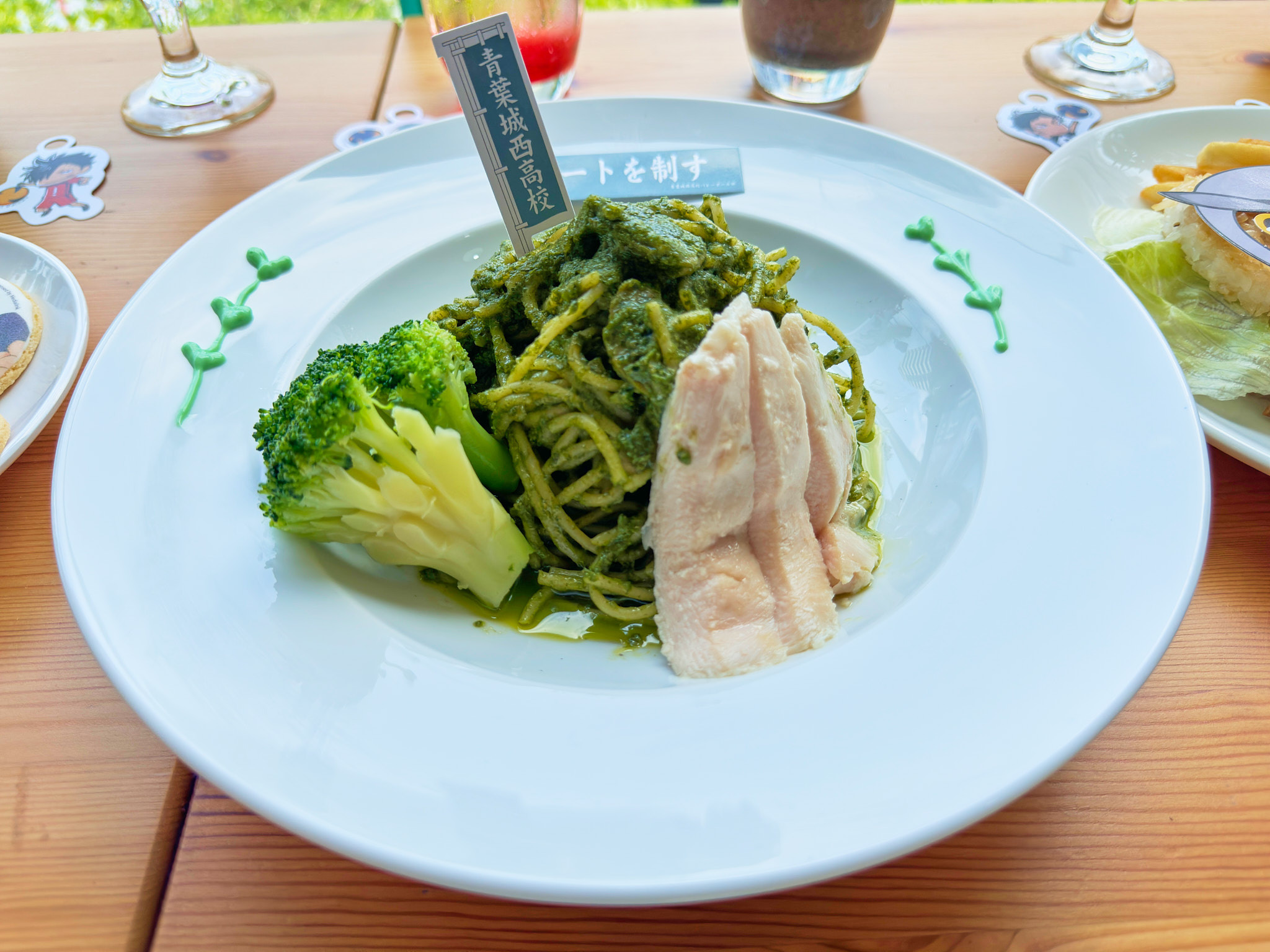 這次餐點以各校為概念,一共推出五道主餐、五道甜點及十款飲品。主餐的部分以學校的特色設計,像是烏野球衣配上咖哩醬汁的「烏野高中」炸雞咖哩飯;「稻荷崎高中」稻荷壽司定食,是以狐狸吉祥物為發想的豆皮壽司定食;「梟谷學園高中」以貓頭鷹造型做成米漢堡套餐;「音駒高中」紅酒燉牛肉,將貓咪造型的飯和代表色紅色醬汁搭配;「青葉城西高中」青醬蘑菇義大利麵,以青城的代表色系為發想,還插上小旗幟。