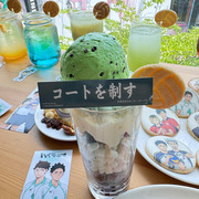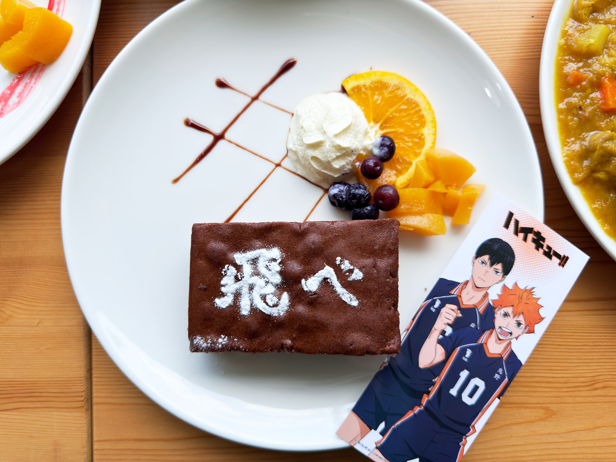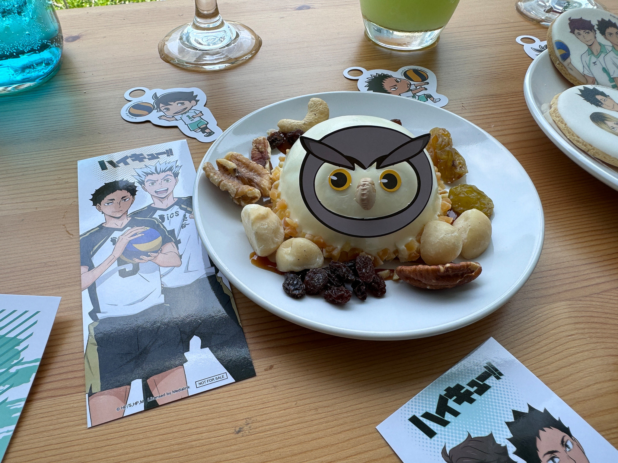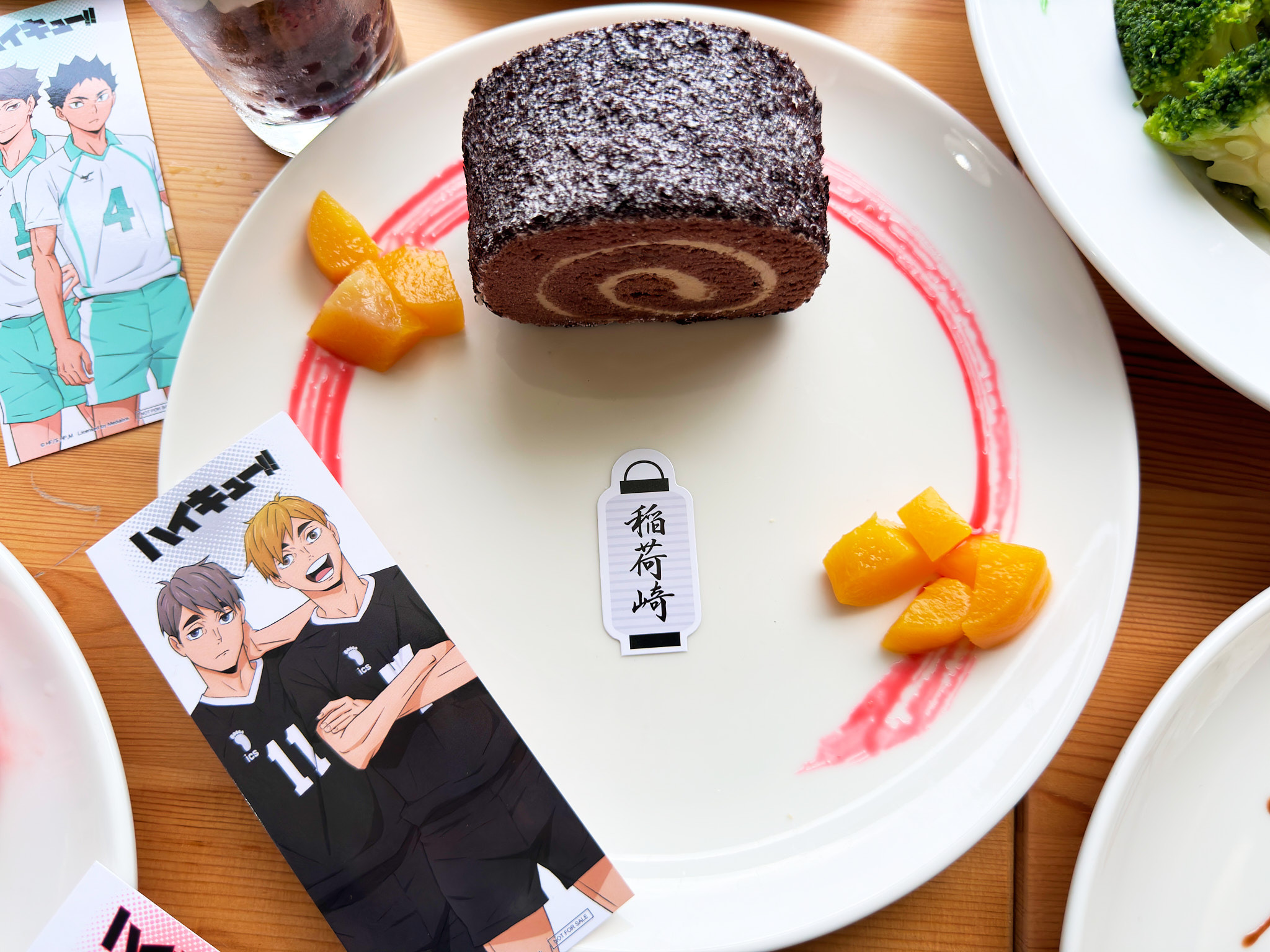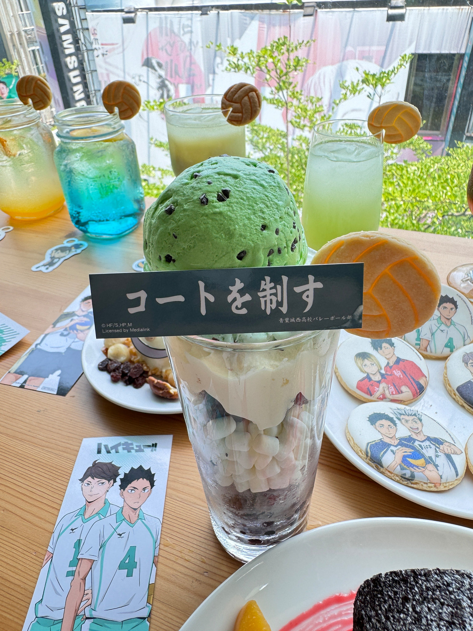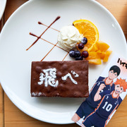 甜點部分有「烏野高中」巧克力蛋糕、「稻荷崎高中」布朗尼蛋糕、「梟谷學園高中」檸檬起司球、「音駒高中」蘋果派及「青葉城西高中」薄荷巧克力聖代;每個甜點上都還有各自代表的旗幟。