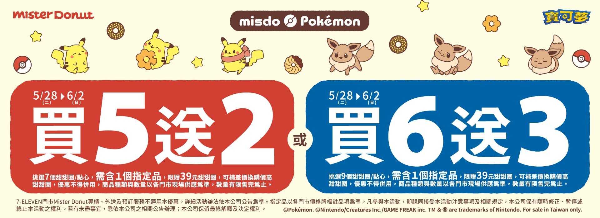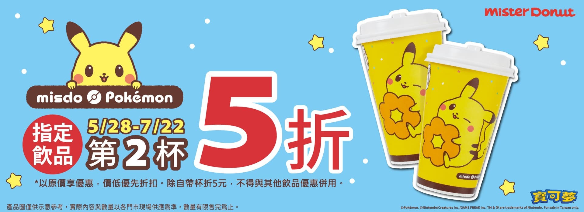 Mister Donut 為迎接寶可夢甜甜圈上市也釋出優惠活動,只要於 5/28(二)~6/2(日)期間購買指定商品即可享買 5 送 2 或買 6 送 3 優惠活動,指定飲品也有第二件 5 折優惠,更多詳情可參考 Mister Donut 官網公告。