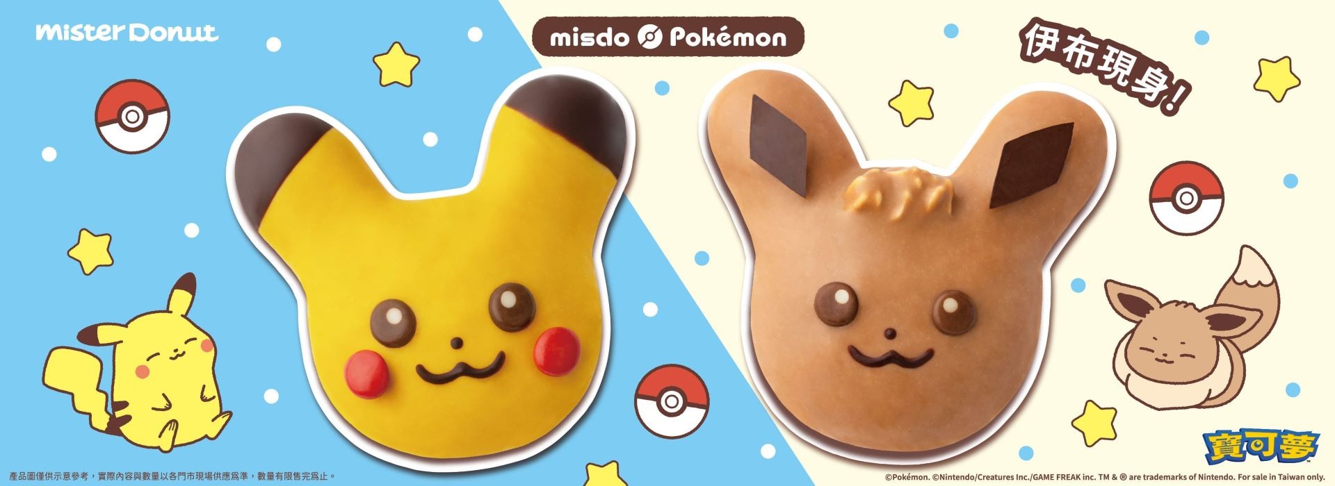 第一波聯名共推出 3 款寶可夢造型甜甜圈,首先是兩款熟面孔「皮卡丘甜甜圈」和「精靈球波堤」,再來則是首次推出的「伊布甜甜圈」。
