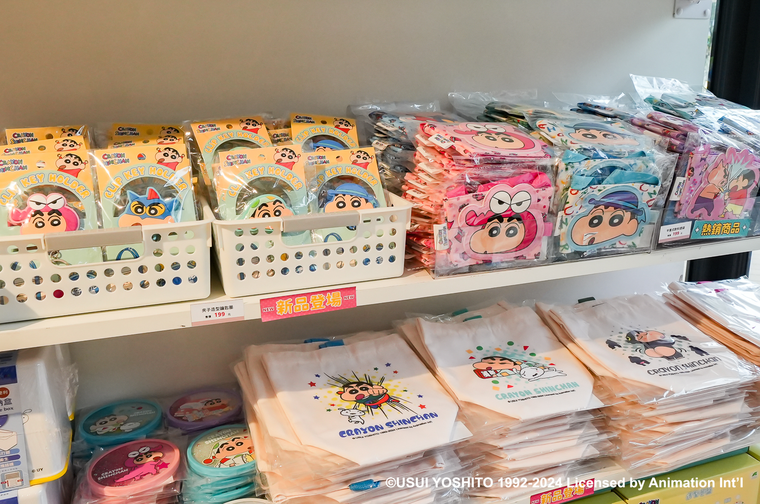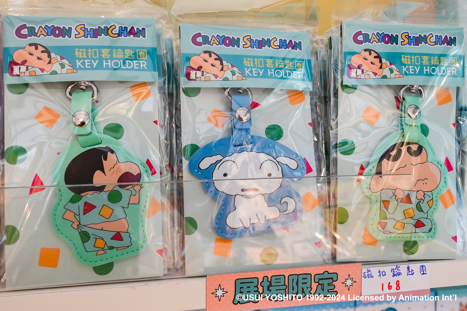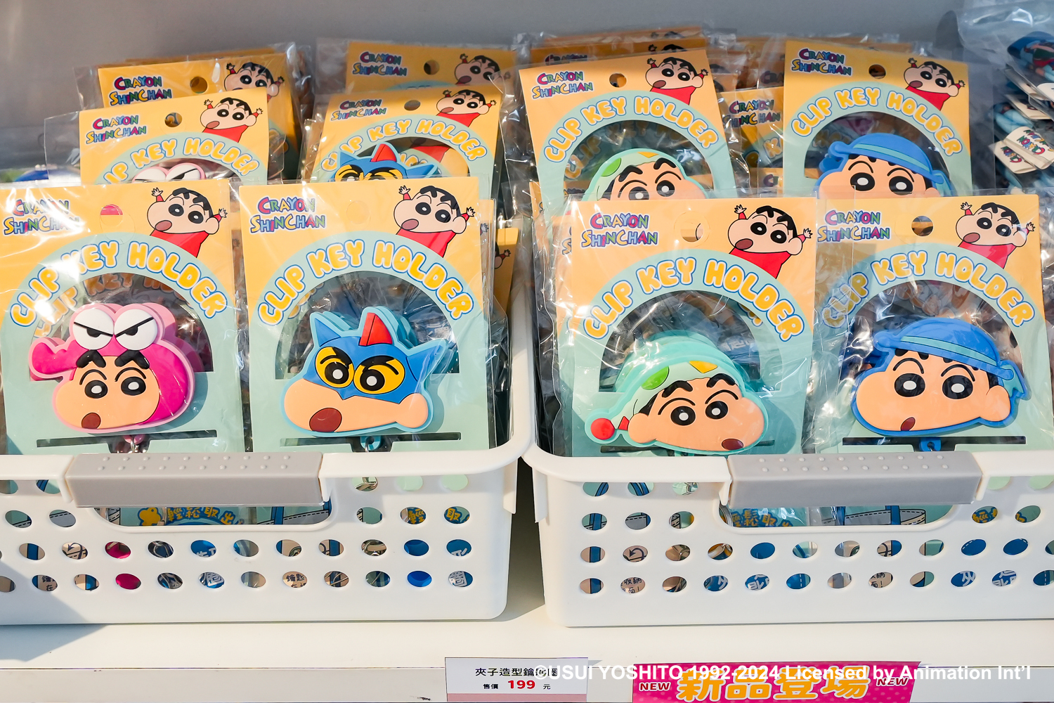 小新換上睡衣、巧克比裝、制服、超人裝、小畫家及日常服裝等造型,加上妮妮與他的兔子多達 10 種款式「壓克力吊飾」選擇障礙就全部帶回家!欸嘿~「解壓吊飾鑰匙圈」Q彈的小新屁屁讓人按的超紓壓,三款皮革材質「磁扣鑰匙圈」,穿睡衣的小新、抓屁屁的小新和小白幫你守護磁扣不亂飛,轉吧轉吧「轉轉鑰匙圈」阿呆的鼻涕、肥嘟嘟左衛門的鮮花、小白的尾巴、超人小新的腰帶及螢火蟲小新的燈籠全部轉起來了!真是又搞怪又實用!
