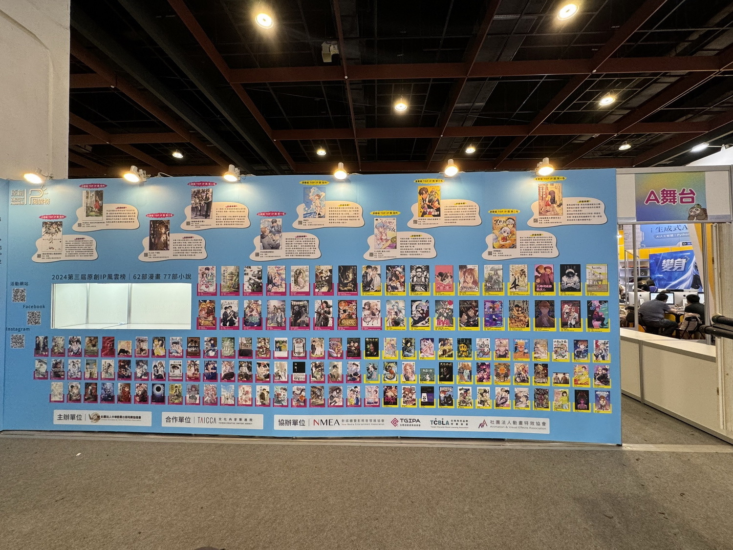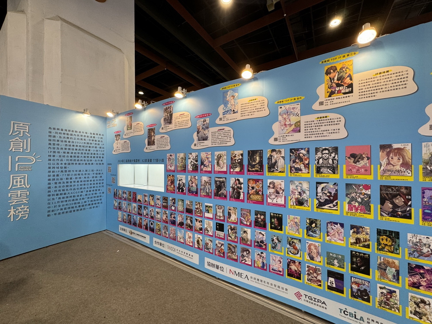 今年原創 IP 風雲榜在漫畫博覽會也擴大展出規模,分別在由文化內容策進院開辦的「臺灣漫畫館」及中華漫協的「原創 IP 風雲榜主題攤位」中展出入圍或得獎作品,該主題攤位同時祭出「原創學堂」 問答活動,讓漫迷透過趣味解題更加快速的認識臺灣原創內容,而在漫博A舞台更有本次所有參賽作品展示牆,揭示本次榜單全貌,成功吸引粉絲駐足圍觀,整個展期活動期待為推動國內的漫畫小說作品推薦榜單打下良好基礎。