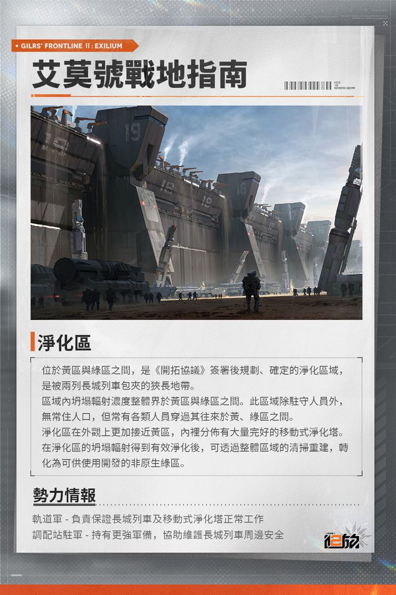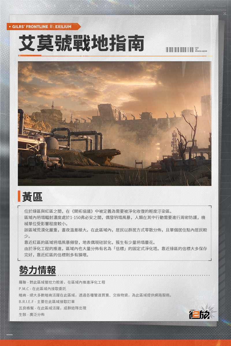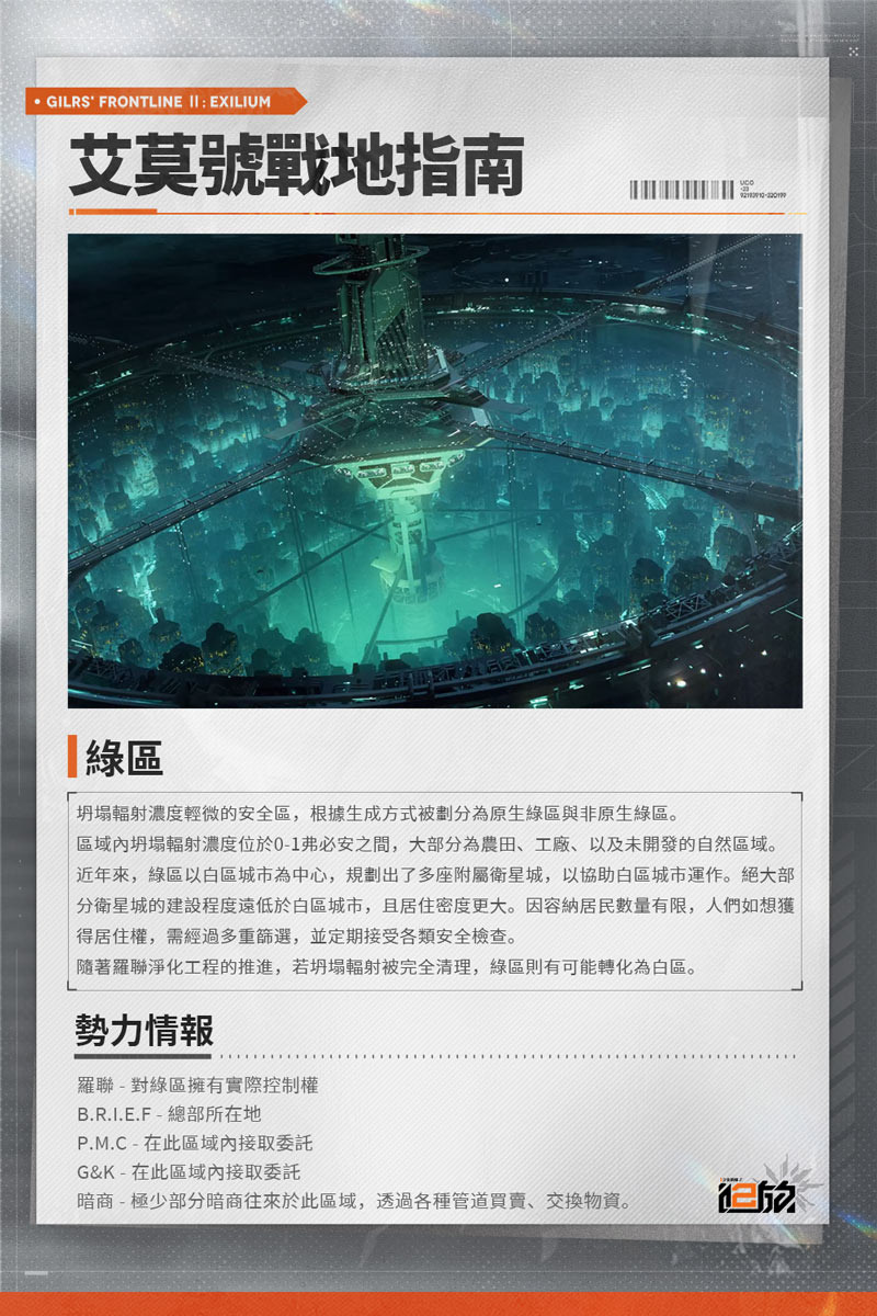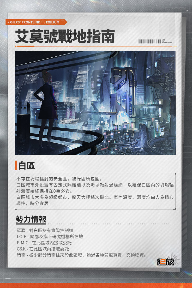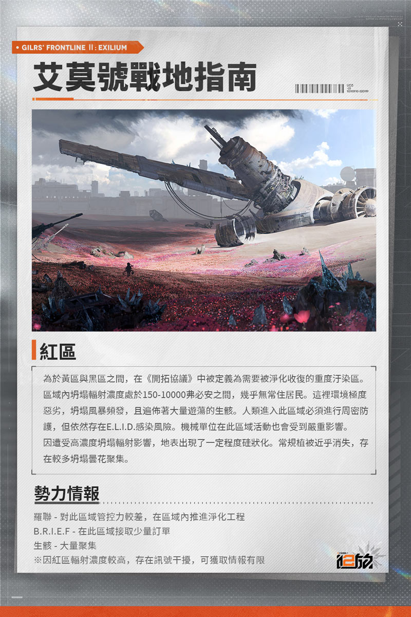》世界觀中,各地遭受著不同程度的坍塌輻射汙染,為此,當代的人們依照不同的汙染以及淨化程度將所在區域分為坍塌輻射源頭的「黑區」、充斥高坍塌輻射的「紅區」、僅能讓人形不受輻射影響活動的「黃區」、坍塌輻射與生骸正在被清理的「淨化區」、較低汙染適合居住的「綠區」以及綠洲中的綠洲「白區」。而故事的開端,就發生在指揮官於「黃區」接下的一筆神秘委託……