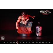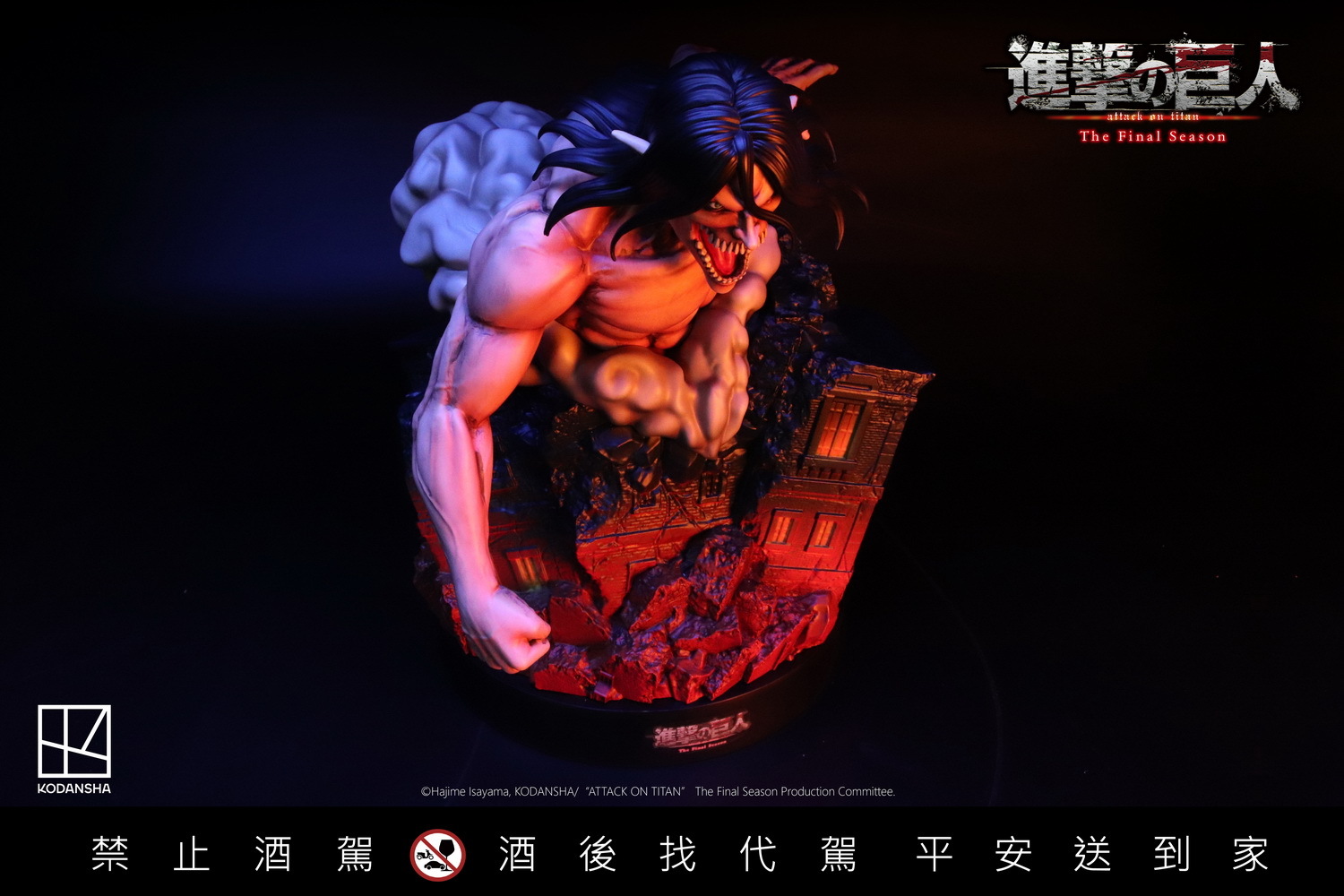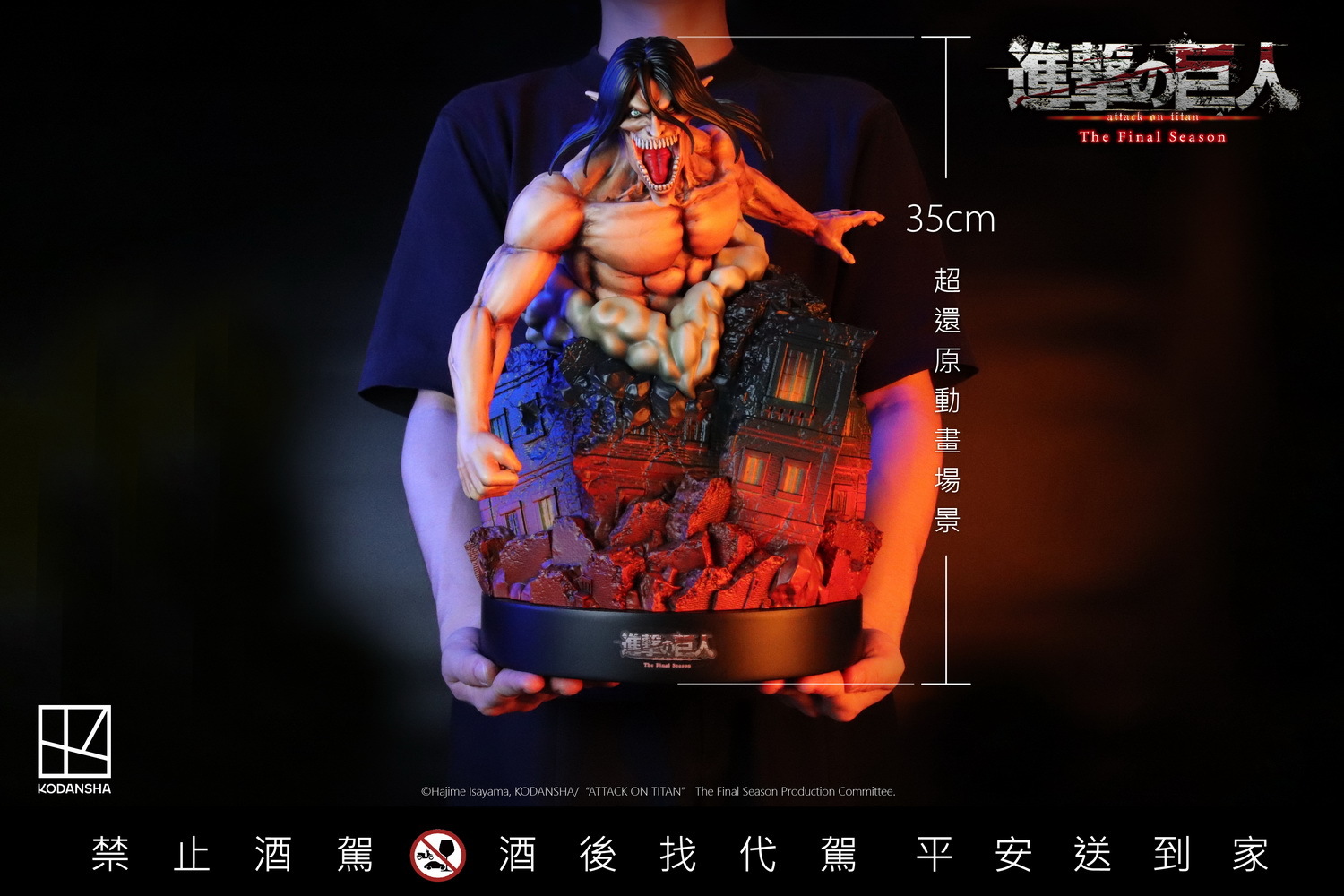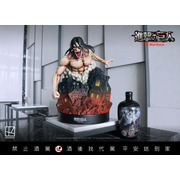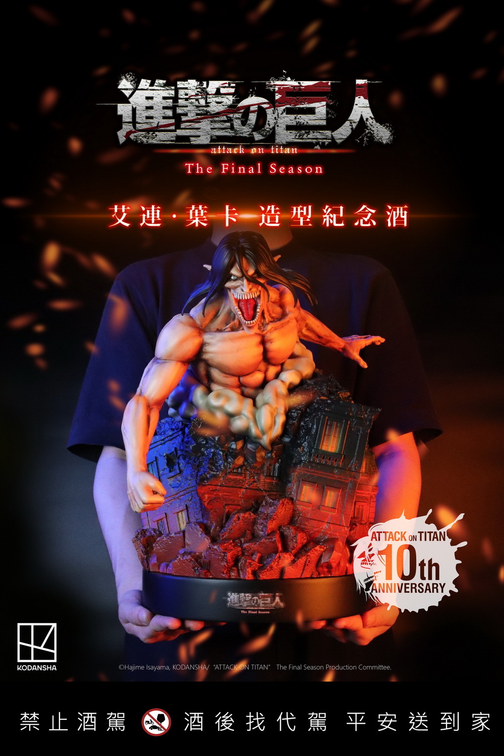 進擊的巨人-艾連·葉卡造型紀念酒」將動畫名場景還原。底座設計模擬出殘缺的建築紋路、破損的窗戶,瓶身燒印艾連與萊納的衝突畫面,內裝醇厚的金門皇家酒廠 58° 高粱酒。不僅如此,底座廢墟中埋入小彩蛋,可以發現地下室的椅子與艾連的拐杖。造型高達 35cm 的艾連與其他「巨人」收藏品一字排開,視覺更顯衝擊力十足。