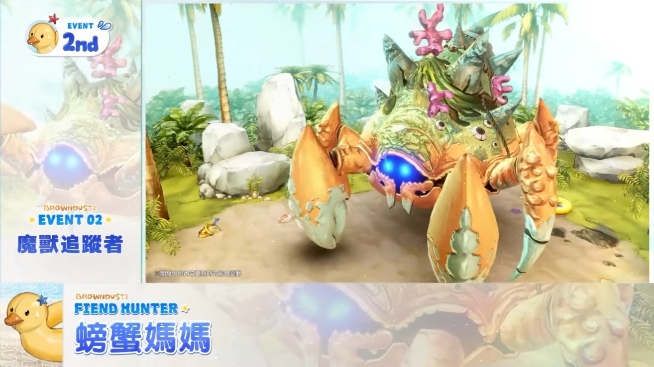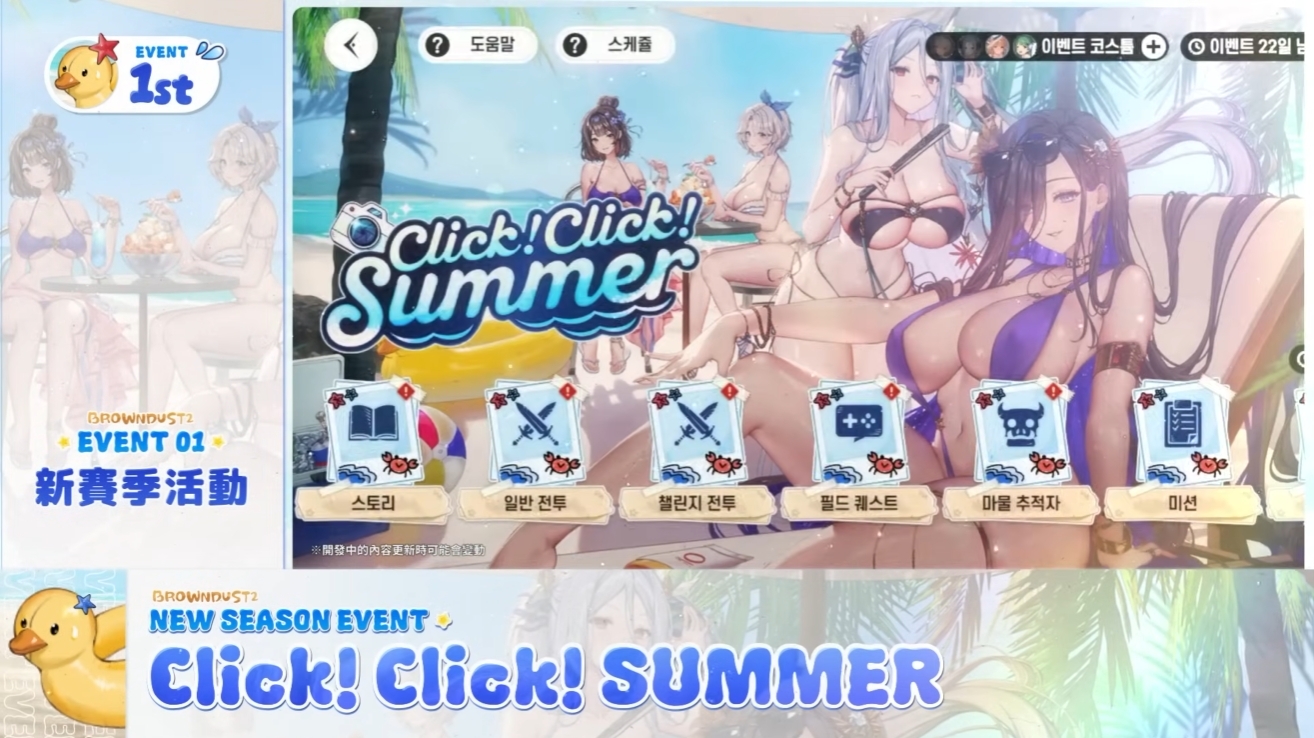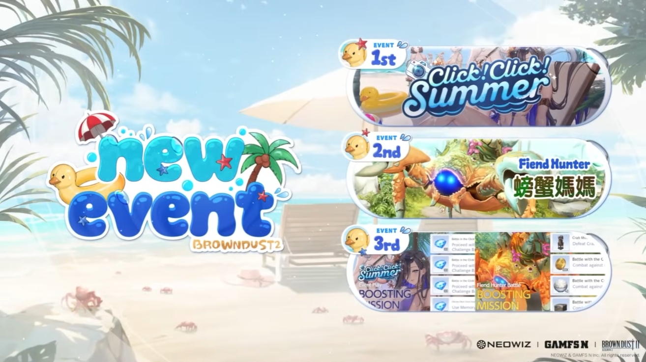 夏季活動《Click! Click! Summer》也進行了更新,將開放到 8 月 29 日。該活動講述了在海邊度假時,為了打倒妨礙的狗仔隊而展開行動的著名演員「伊柯利普斯」和「墨菲亞」的故事。同時,還揭開了另一角色「拉菲娜」的隱藏意圖。玩家可以享受共 30 場戰鬥,其中一般戰鬥和挑戰戰鬥各有 15 場,最終 Boss 為「螃蟹媽媽」。此外,還包括場域任務「海邊打