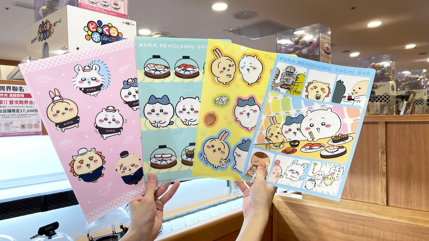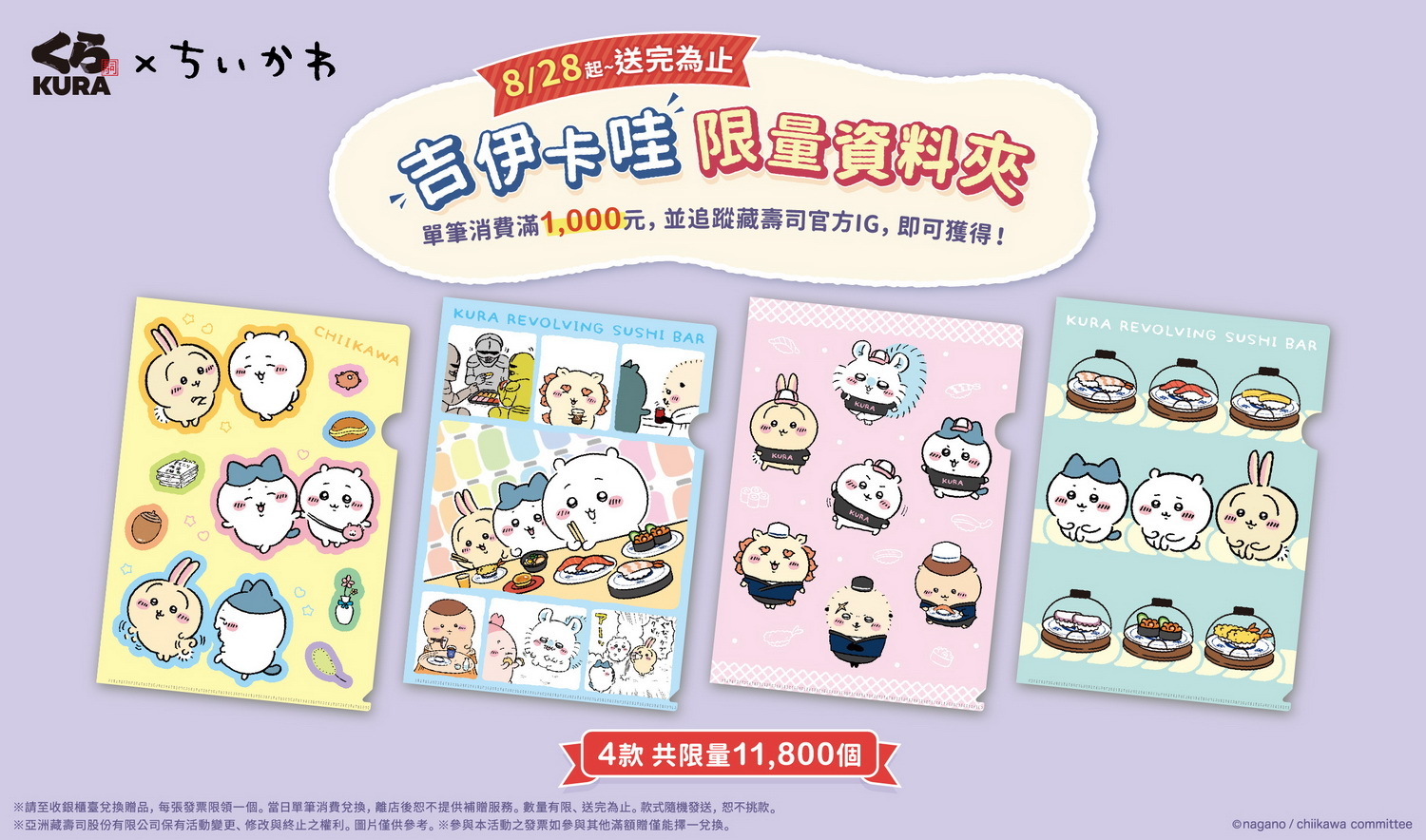 吉伊卡哇限量資料夾」將自 8 月 28 日推出,單筆消費滿 1,000 元,並完成指定任務就可以直接帶回家。藏壽司美味的壽司和舒適的用餐環境讓鎧甲先生都忍不住來參一腳,還能在經典的輸送帶上看到確保食物衛生的「鮮度君」跟引頸期盼的