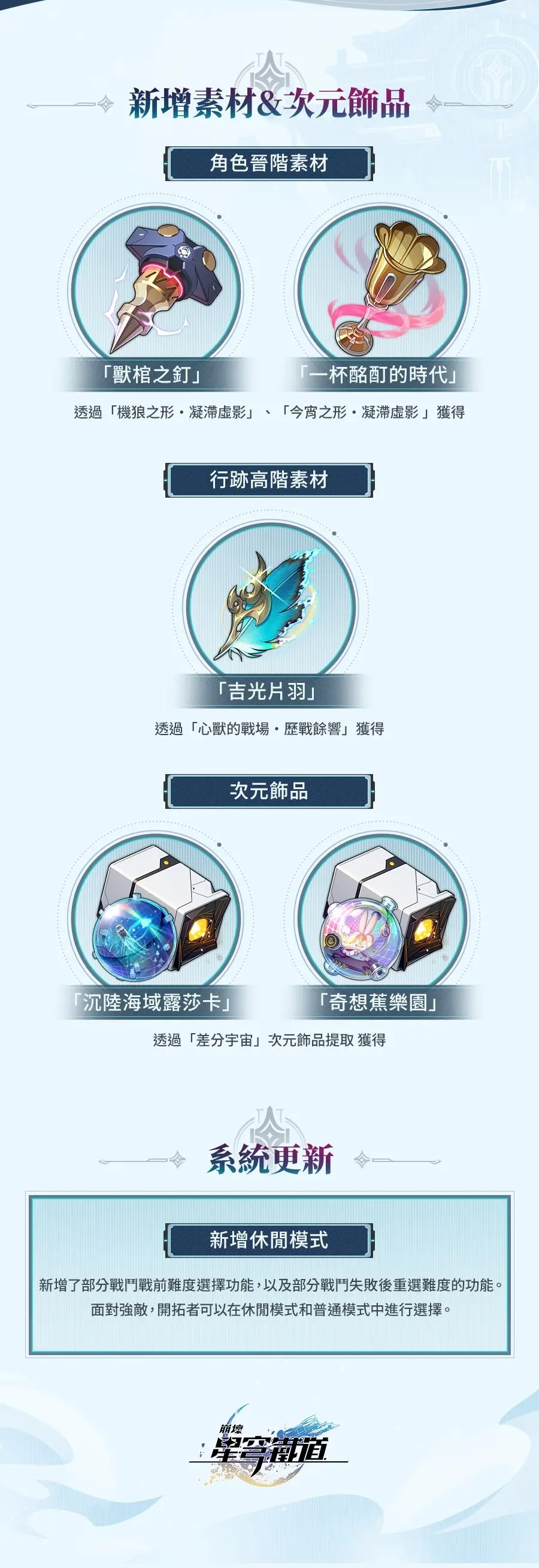 活動期間,限定五星光錐「只需等待(虛無)」以及四星光錐「論劍(巡獵)」、「決心如汗珠般閃耀(虛無)」、「『我』的誕生(智識)」躍遷成功機率限時提升。