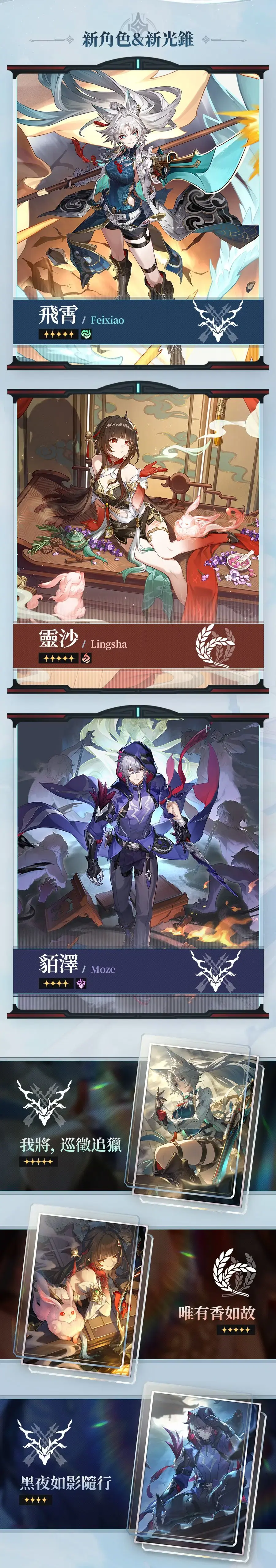活動期間,限定五星角色「飛霄(巡獵・風)」以及四星角色「貊澤(巡獵・雷)」、「艾絲妲(同諧・火)」、「盧卡(虛無・物理)」躍遷成功機率限時提升。