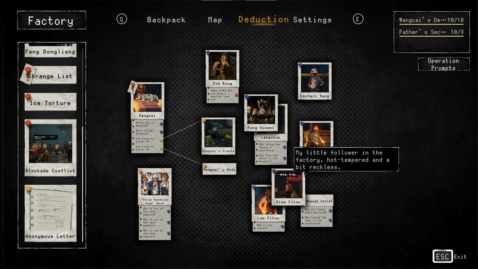 遊戲中,玩家將扮演偵探阿光,調查一系列謀殺案件,揭開隱藏在背後的驚人秘密。玩家可以自由選擇提升你的能力,如力量、精神、魅力,並選擇自己的調查案件方法,像是心理戰?給點錢?還是把嫌疑犯打一頓?遊戲中的推理系統將透過蒐集、分析、連結相關的線索,協助玩家完成破案軌跡。「影子」,一個附身在你背後的奇怪生物,能讀出記憶、還原死者生前的痕跡,玩家也將利用它找到線索。