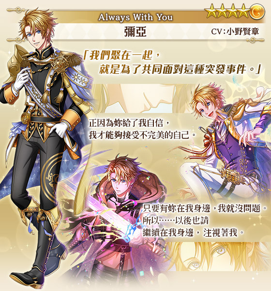夢谷購物中心開啟超優惠儲值活動,超值禮包販售中!累計儲值達指定金額可獲得愛情突破教育員、10 連召喚券、★5 (含 SP) 王子自選券等好禮,本次加碼贈送 9 週年紀念「Always With You」壓克力票卡,共有 3 款絕對都要收集到!