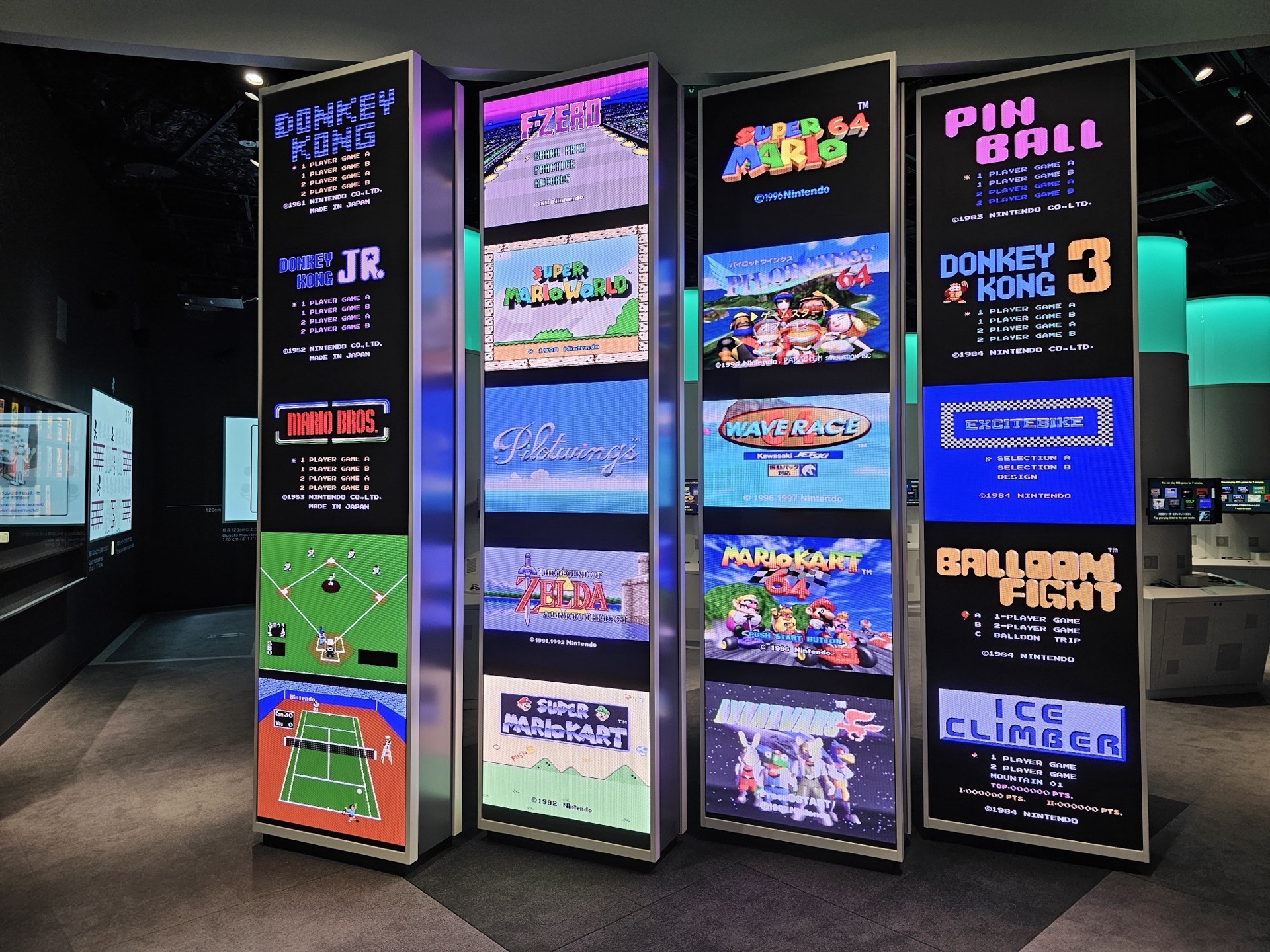 從最早期的花札與撲克牌,到進軍遊戲產業後推出的 Game & Watch、紅白機(Family Computer)、超級任天堂(Super Famicom)及 Nintendo Switch 系列主機及其遊戲軟體,讓不同年齡層的遊客們在各自熟悉的展區回憶過去的遊戲時光。