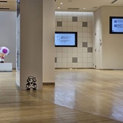 逛完二樓後下到第 1 展示棟 1 樓,有八種將任天堂歷年來製作的各式娛樂項目透過現代技術重新演繹的互動體驗展示。這裡可以看到兩人合力操作的巨大控制器,或是手持智慧型手機在滿布地面的「小倉百人一首」卡片中尋找目標歌牌等,都是任天堂博物館特有的體驗。