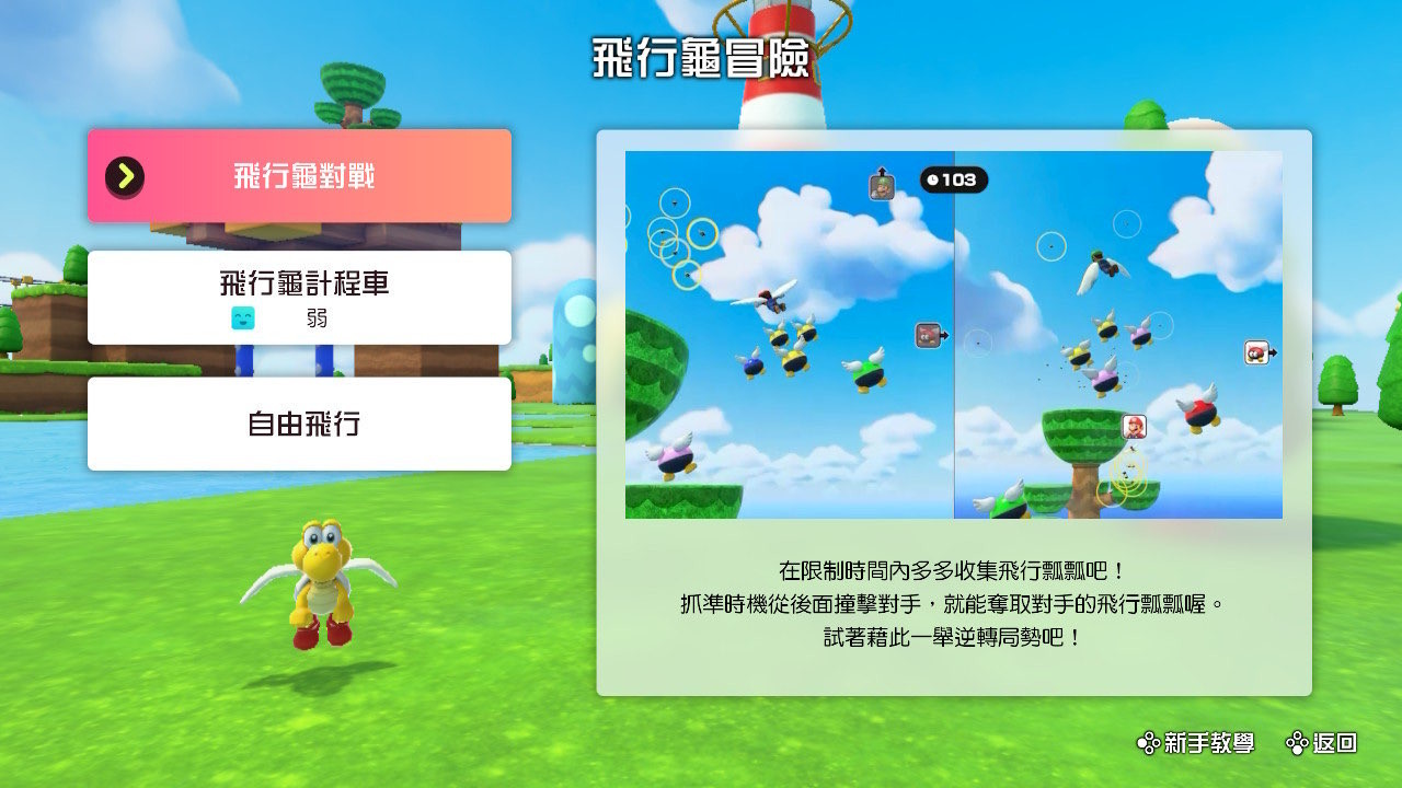 2 人協力將碧姬公主等的乘客送到目的地。2 人需要齊心協力配合節奏揮動翅膀,並保持平衡,避免讓乘客掉落。
