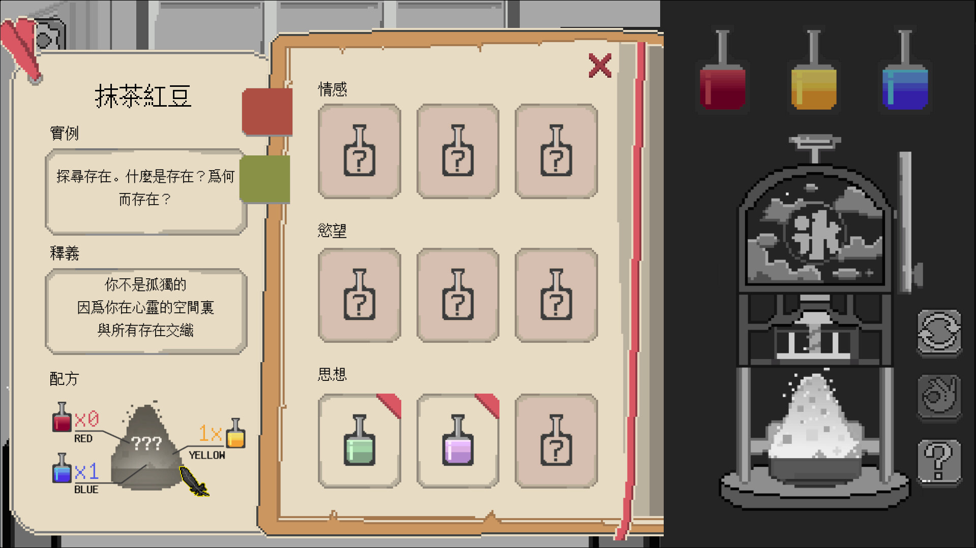 初始擁有三個最基本的顏色,紅(情感)黃(慾望)藍(思想),透過三個基底的調配,可以創造出不同口味的刨冰,用以向來客表達自己的想法。