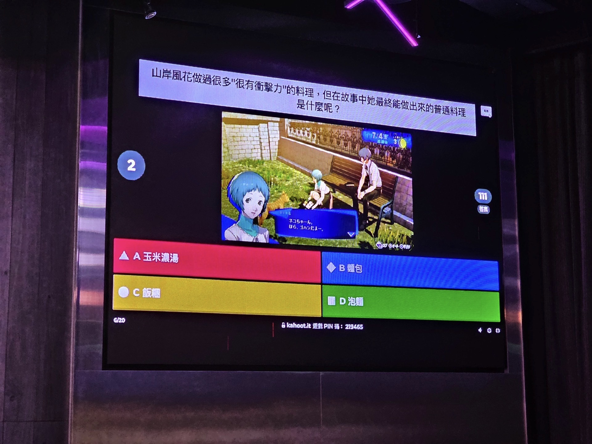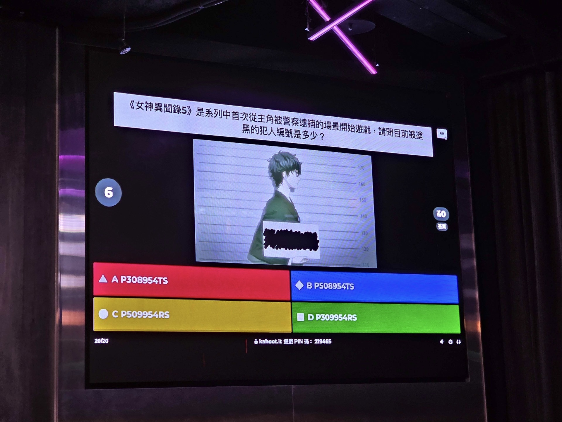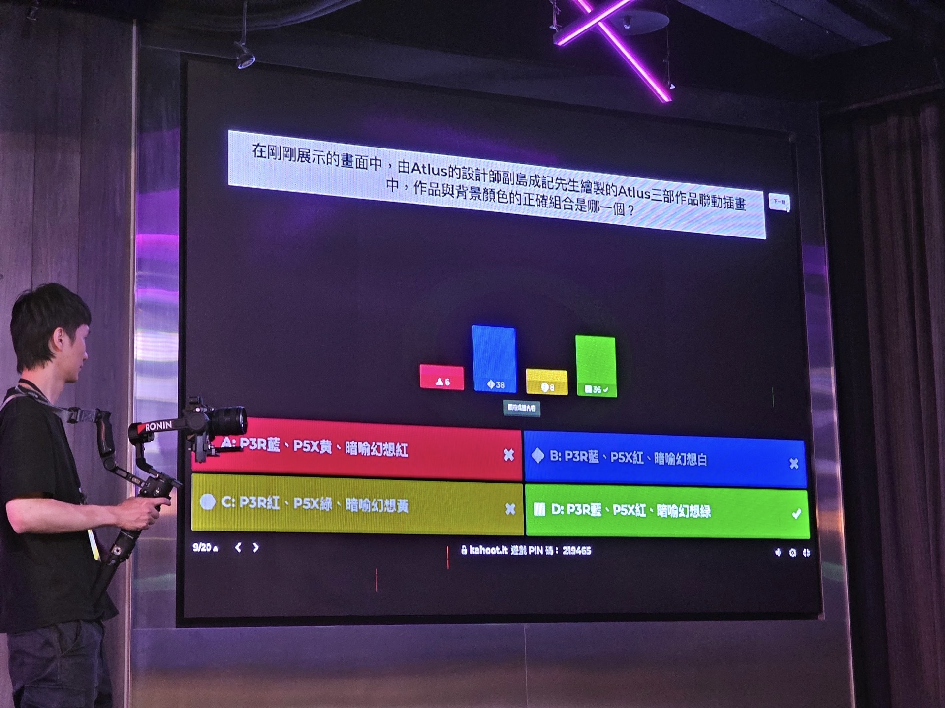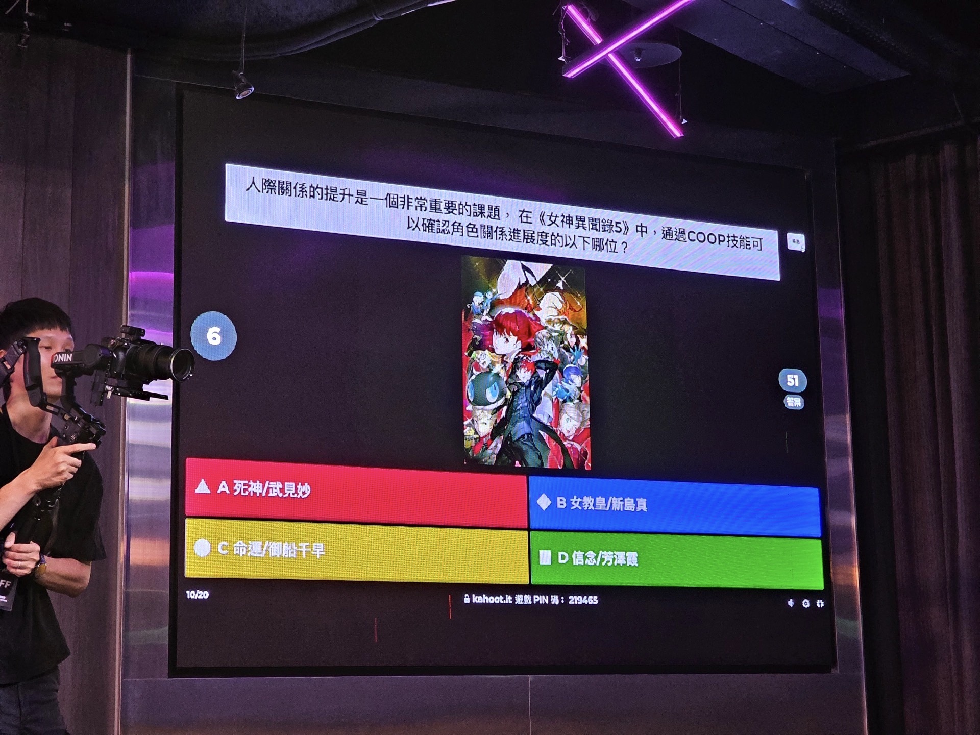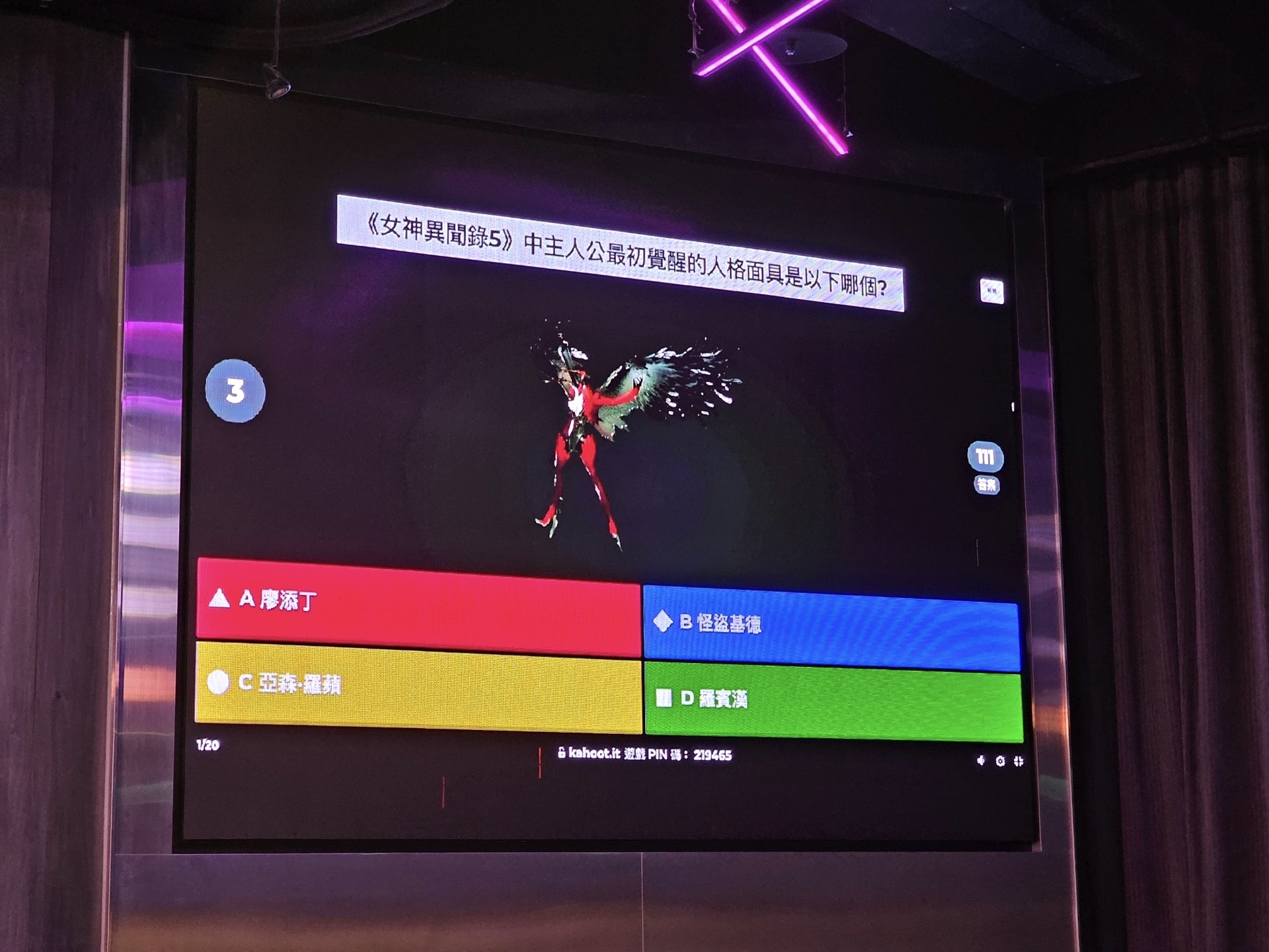 除了來賓分享與問答環節,活動現場還安排了粉絲最期待的互動與抽獎。首先是「難易度 CHALLENGE!女神異聞錄問答挑戰」,參與者需要拿出自己的手機掃描 QR CODE、輸入暱稱加入問答,題目總共 20 題,要在這些選項中擇一作答。除了正解率外,答題速度也會反映在得分上。得分前五高的參加者可獲得豪華獎品。