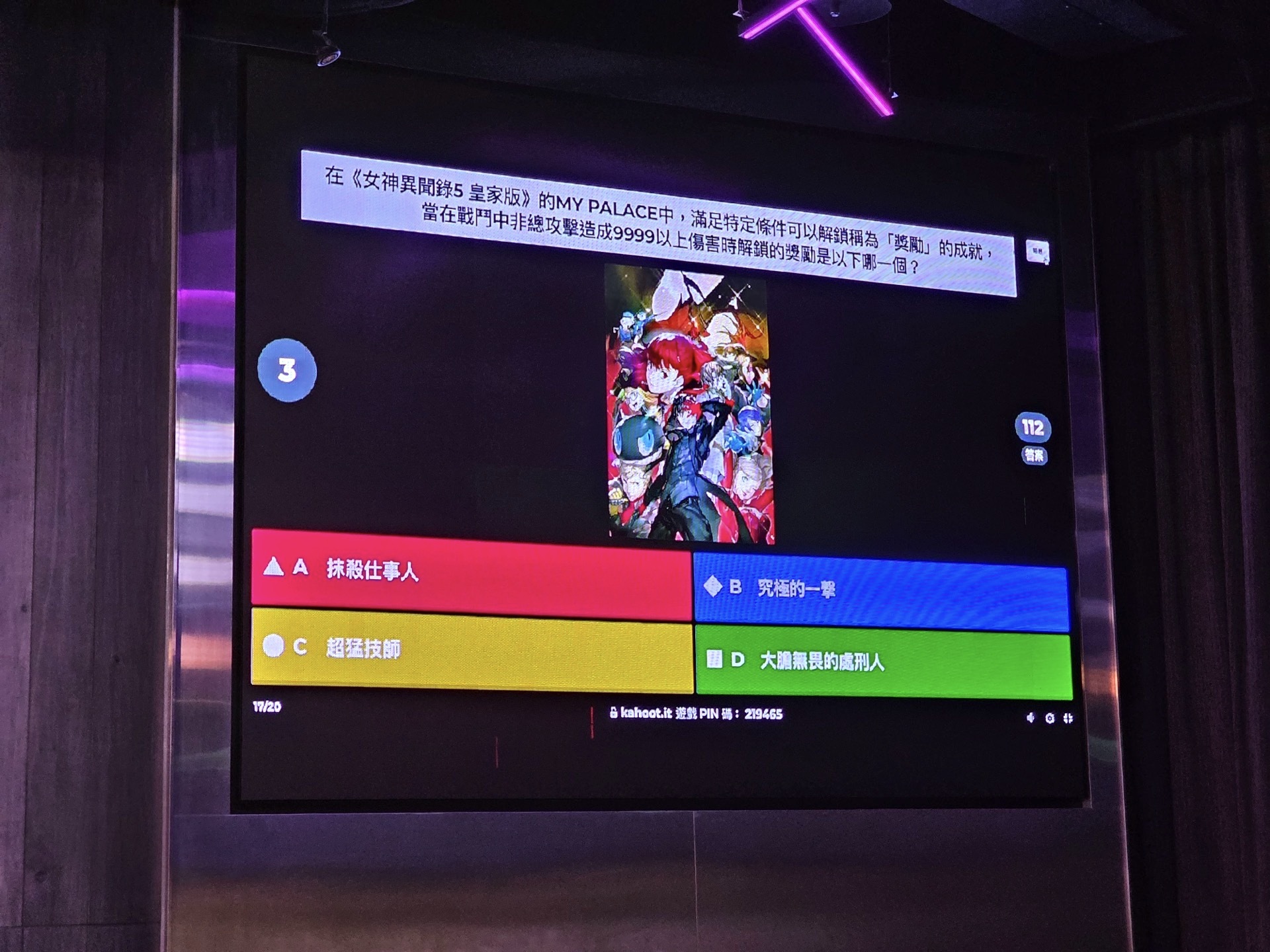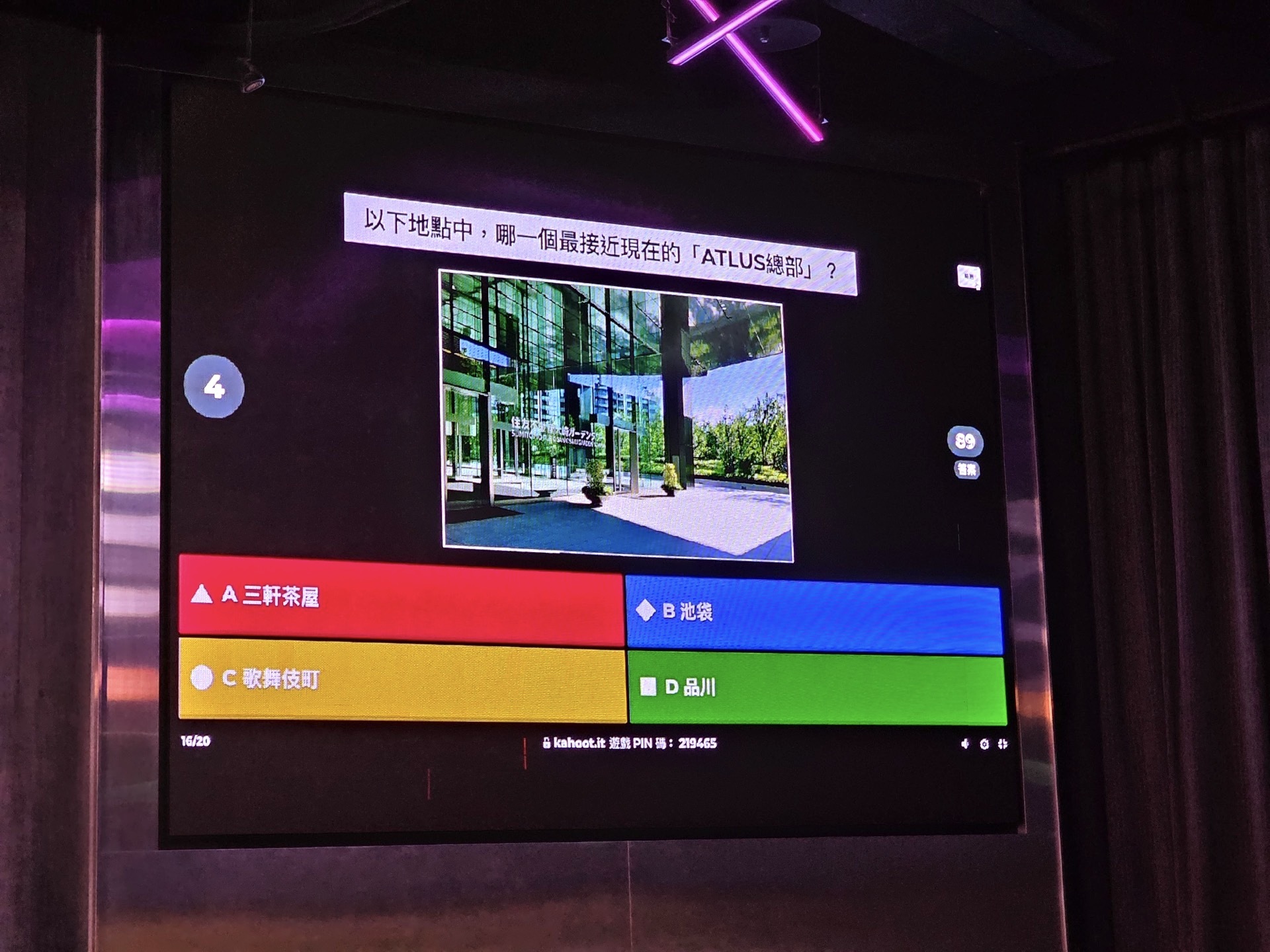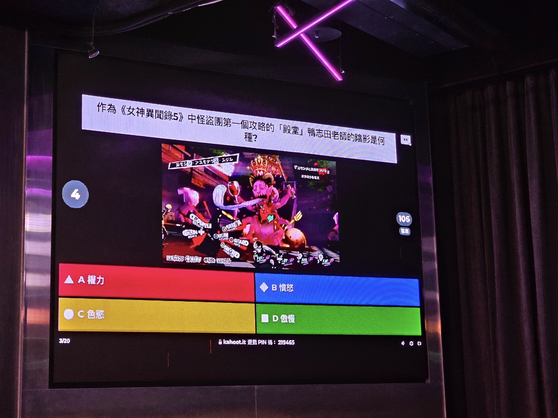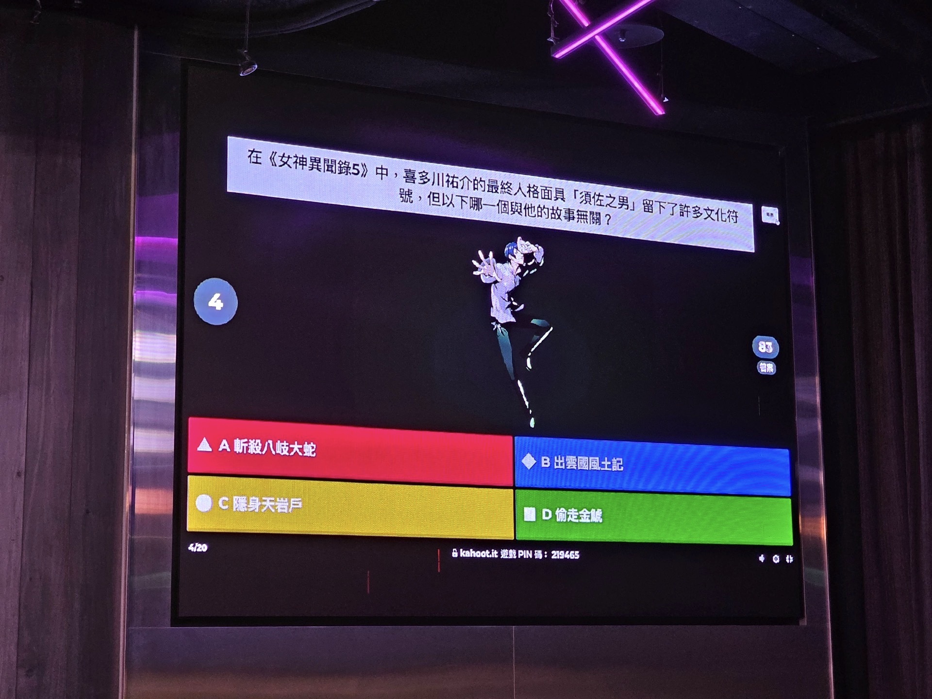 除了來賓分享與問答環節,活動現場還安排了粉絲最期待的互動與抽獎。首先是「難易度 CHALLENGE!女神異聞錄問答挑戰」,參與者需要拿出自己的手機掃描 QR CODE、輸入暱稱加入問答,題目總共 20 題,要在這些選項中擇一作答。除了正解率外,答題速度也會反映在得分上。得分前五高的參加者可獲得豪華獎品。