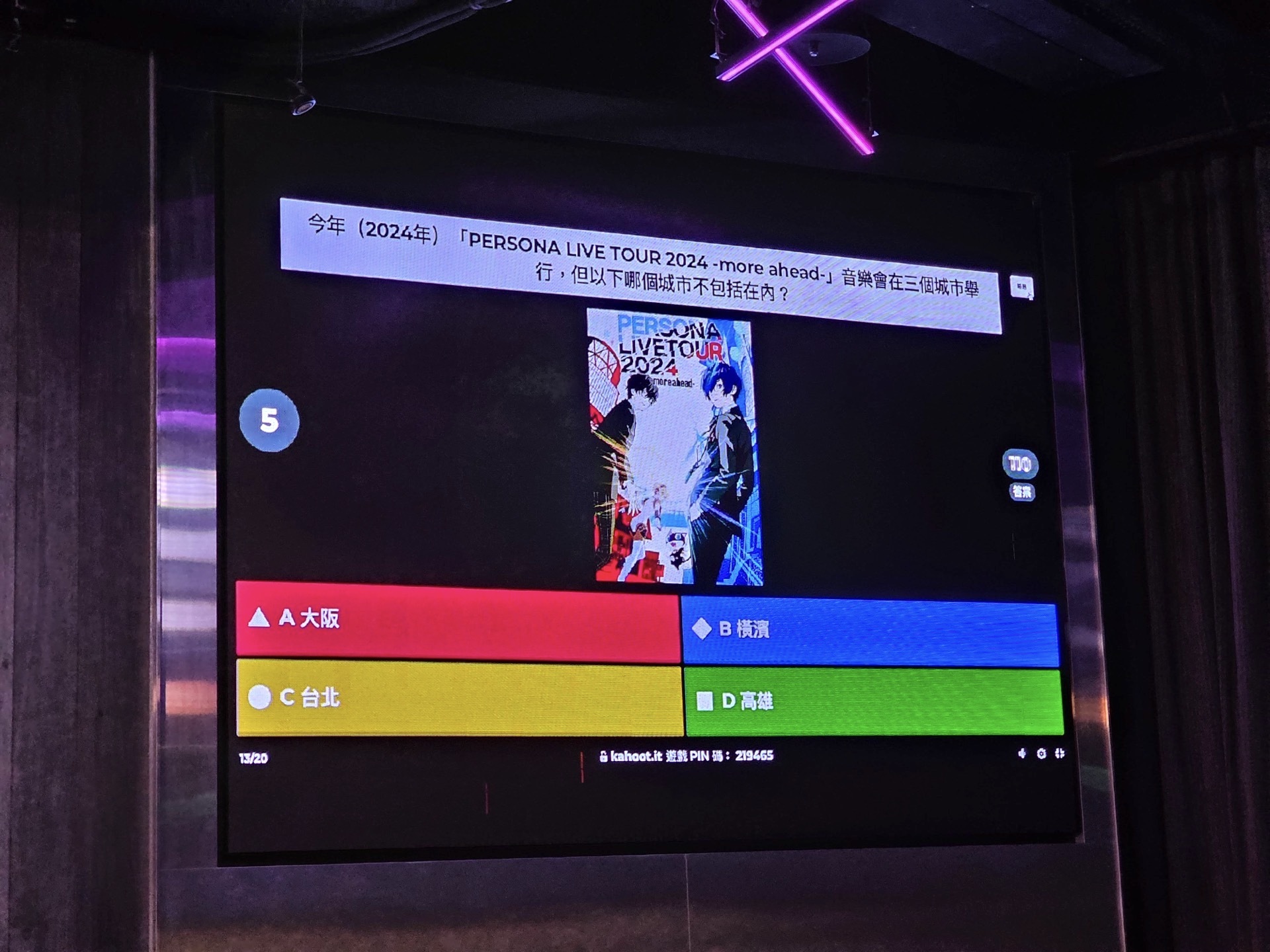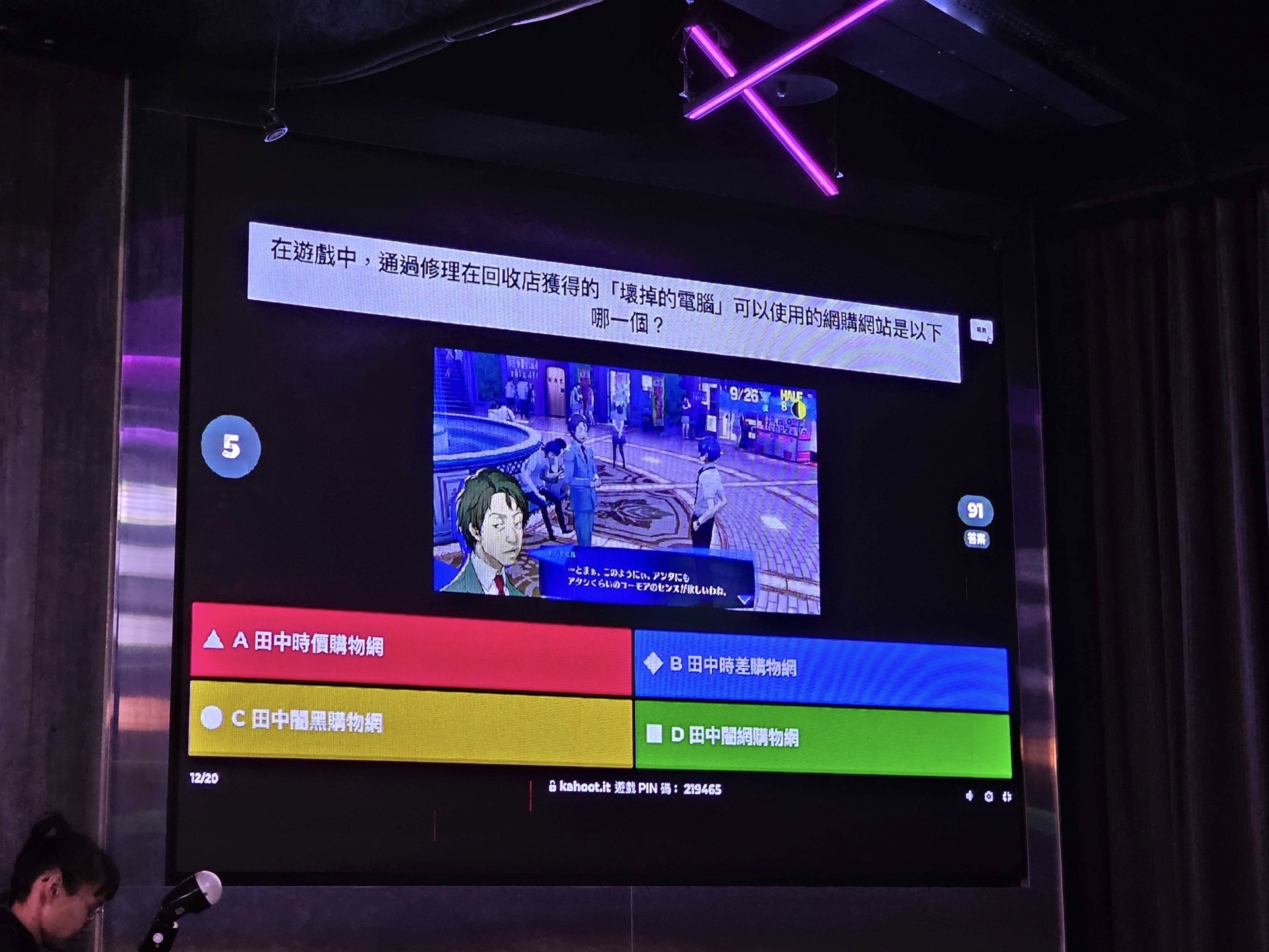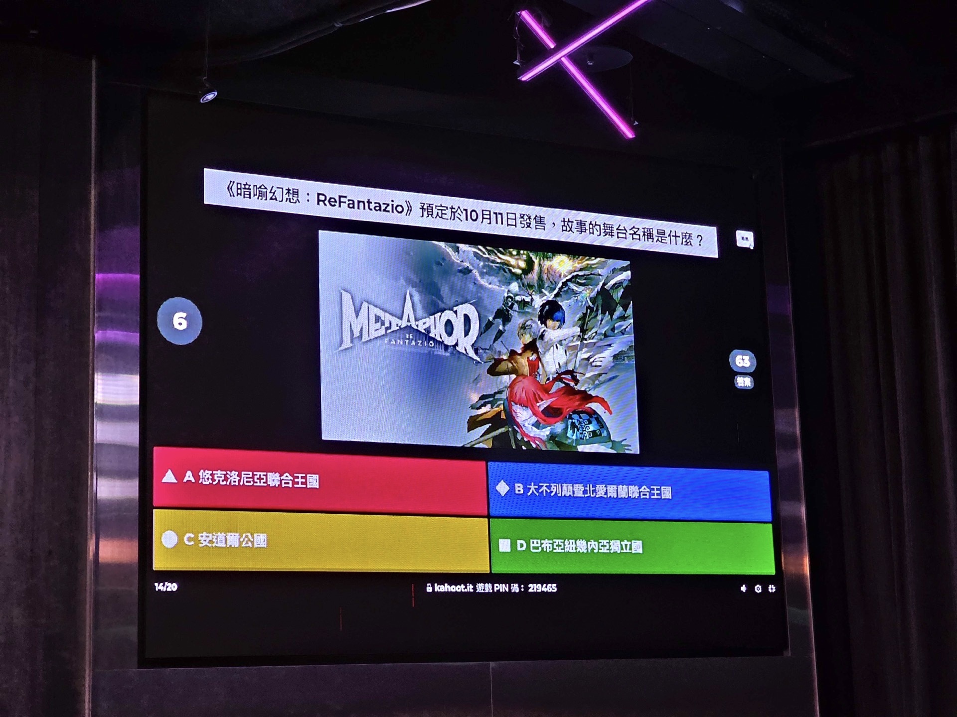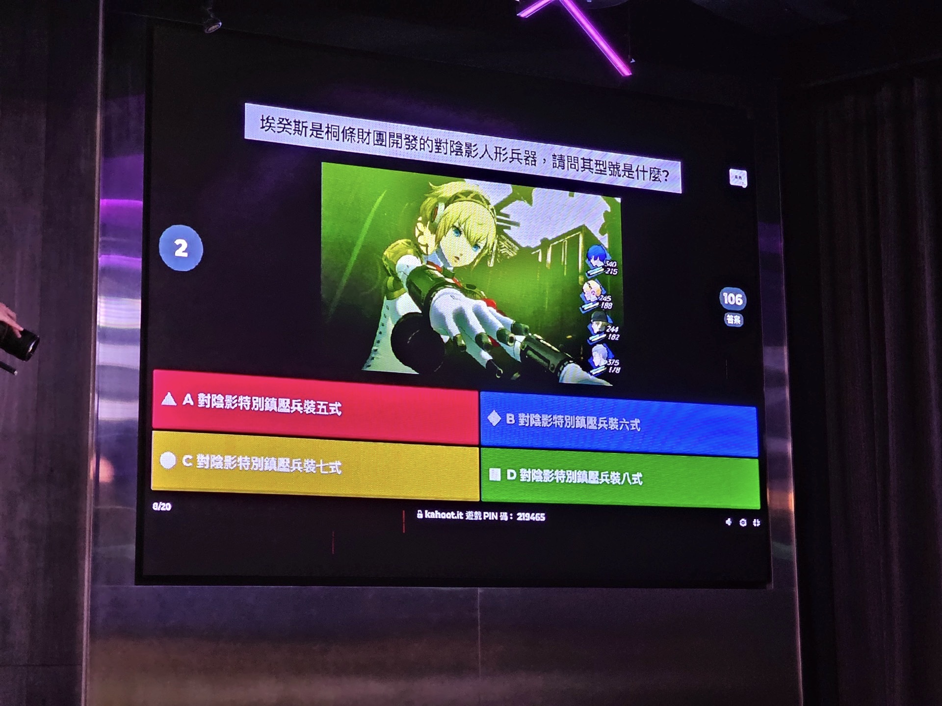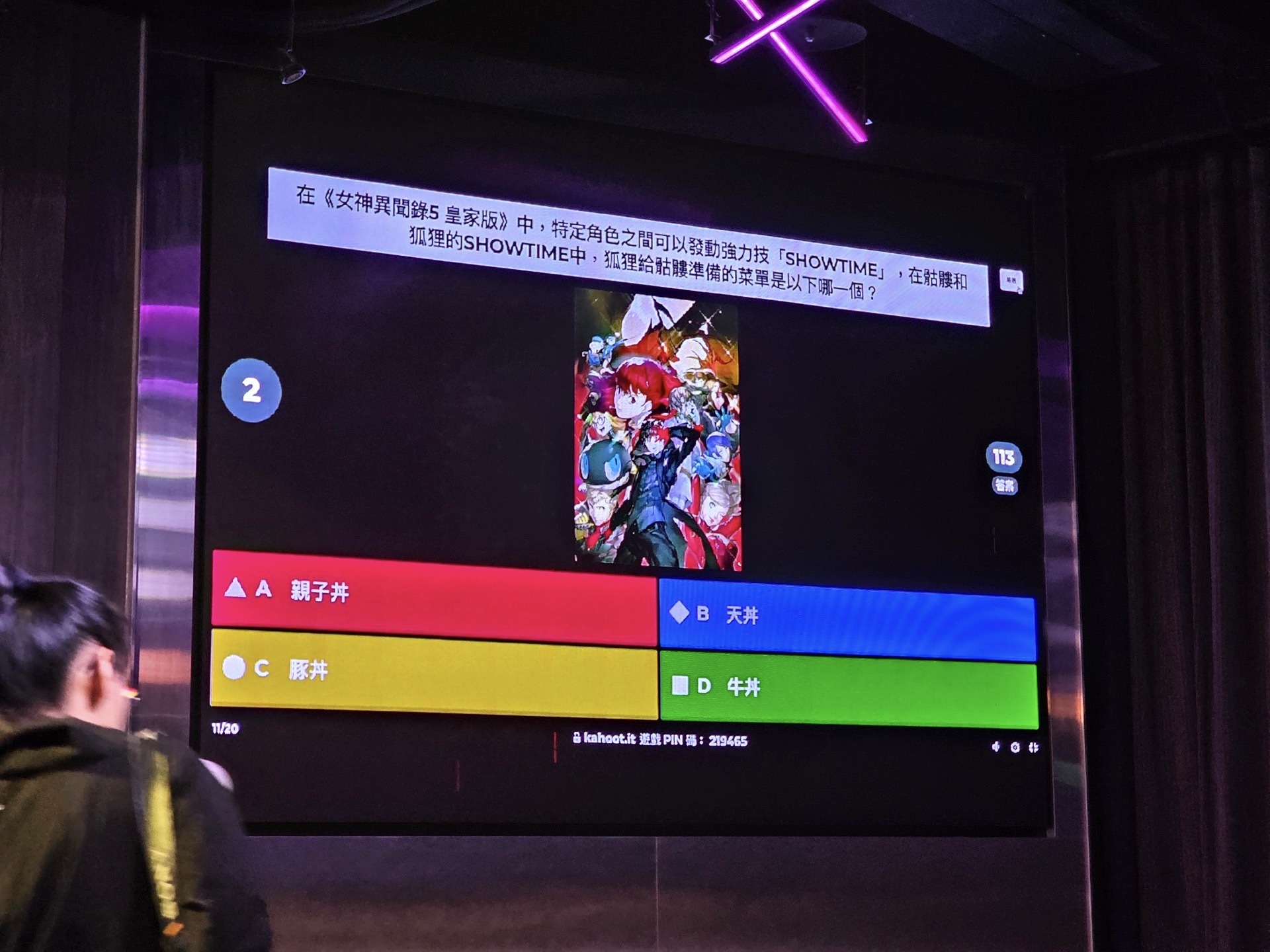除了來賓分享與問答環節,活動現場還安排了粉絲最期待的互動與抽獎。首先是「難易度 CHALLENGE!女神異聞錄問答挑戰」,參與者需要拿出自己的手機掃描 QR CODE、輸入暱稱加入問答,題目總共 20 題,要在這些選項中擇一作答。除了正解率外,答題速度也會反映在得分上。得分前五高的參加者可獲得豪華獎品。