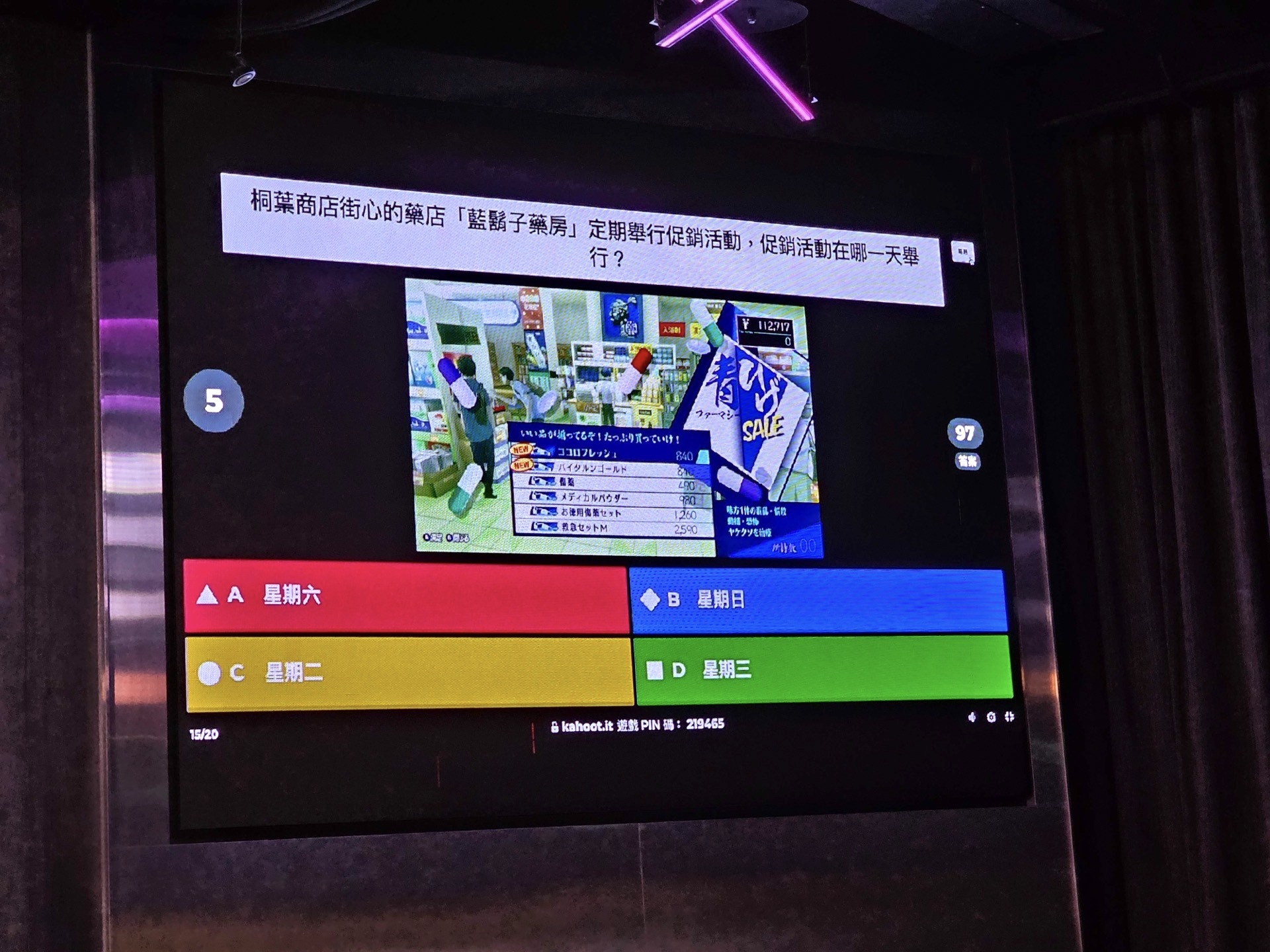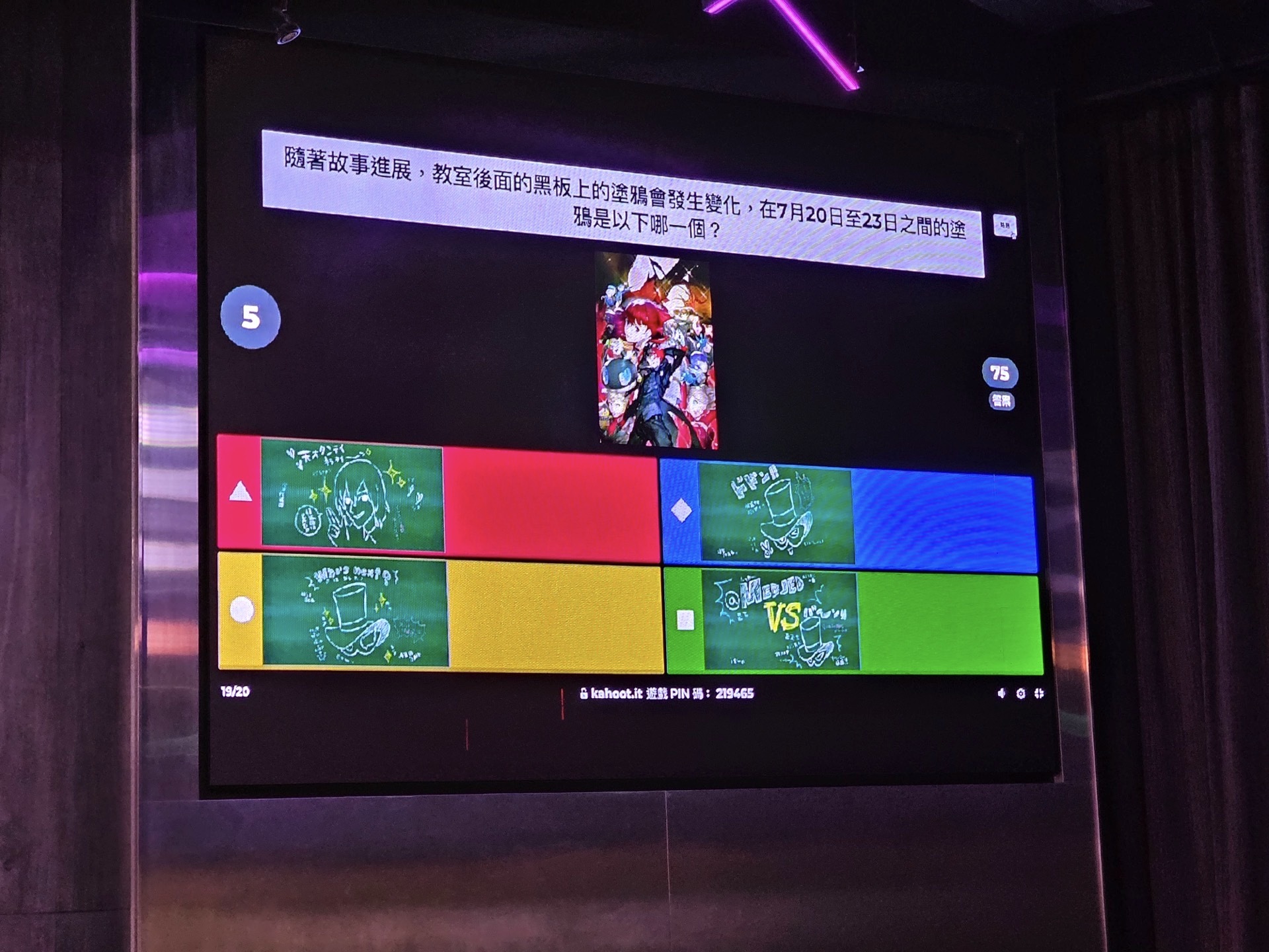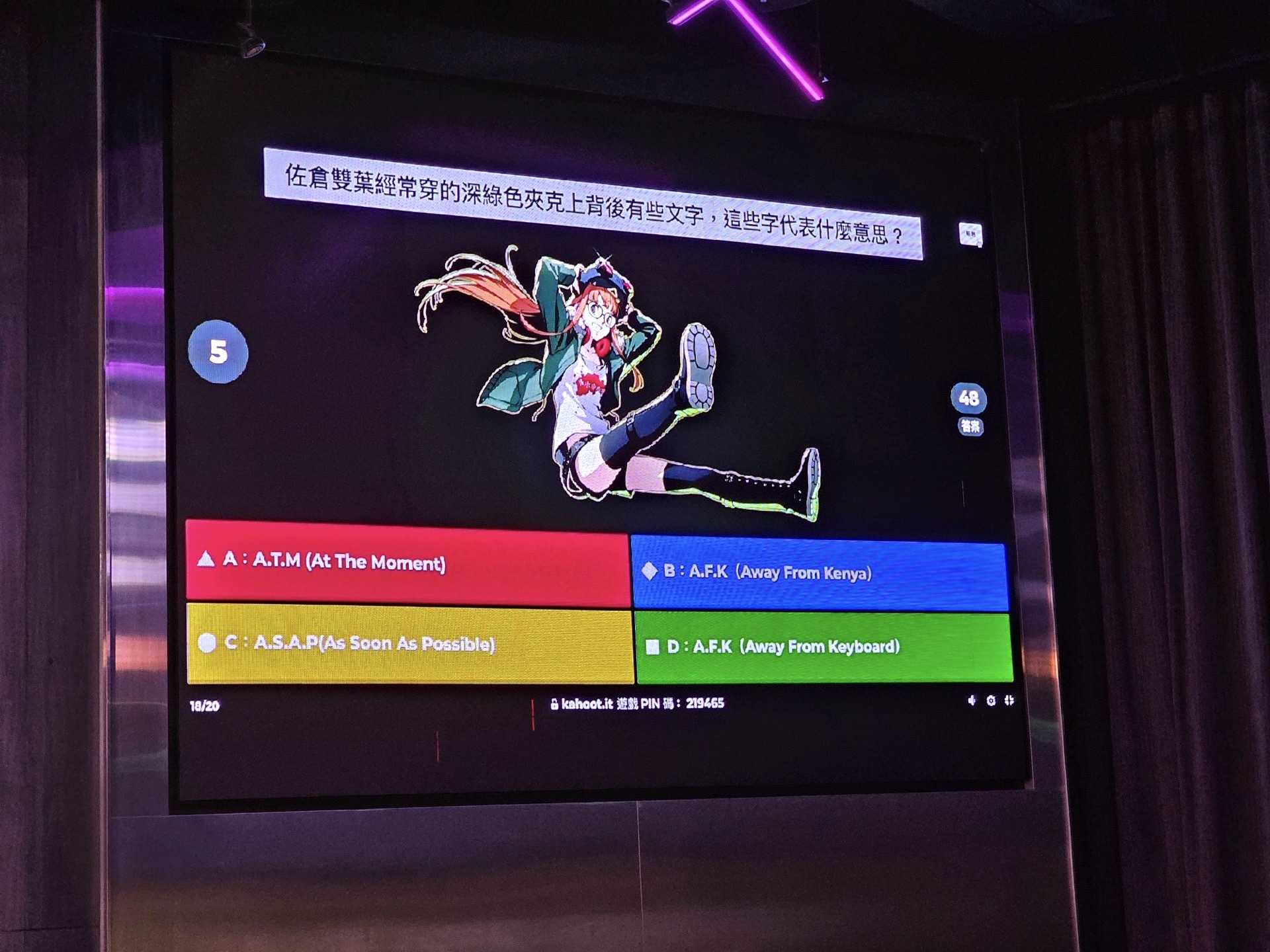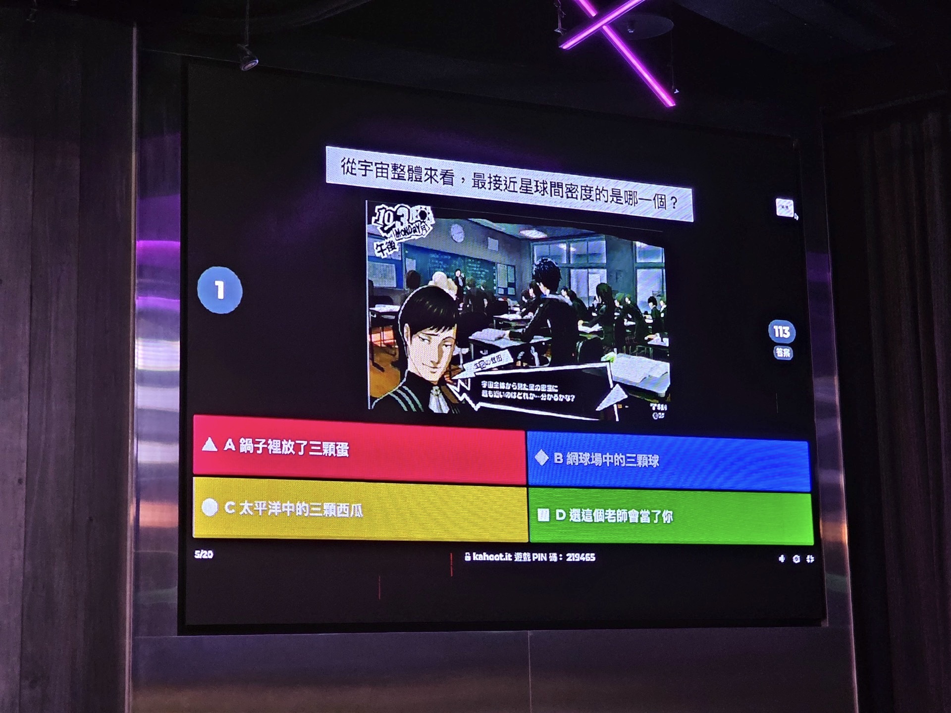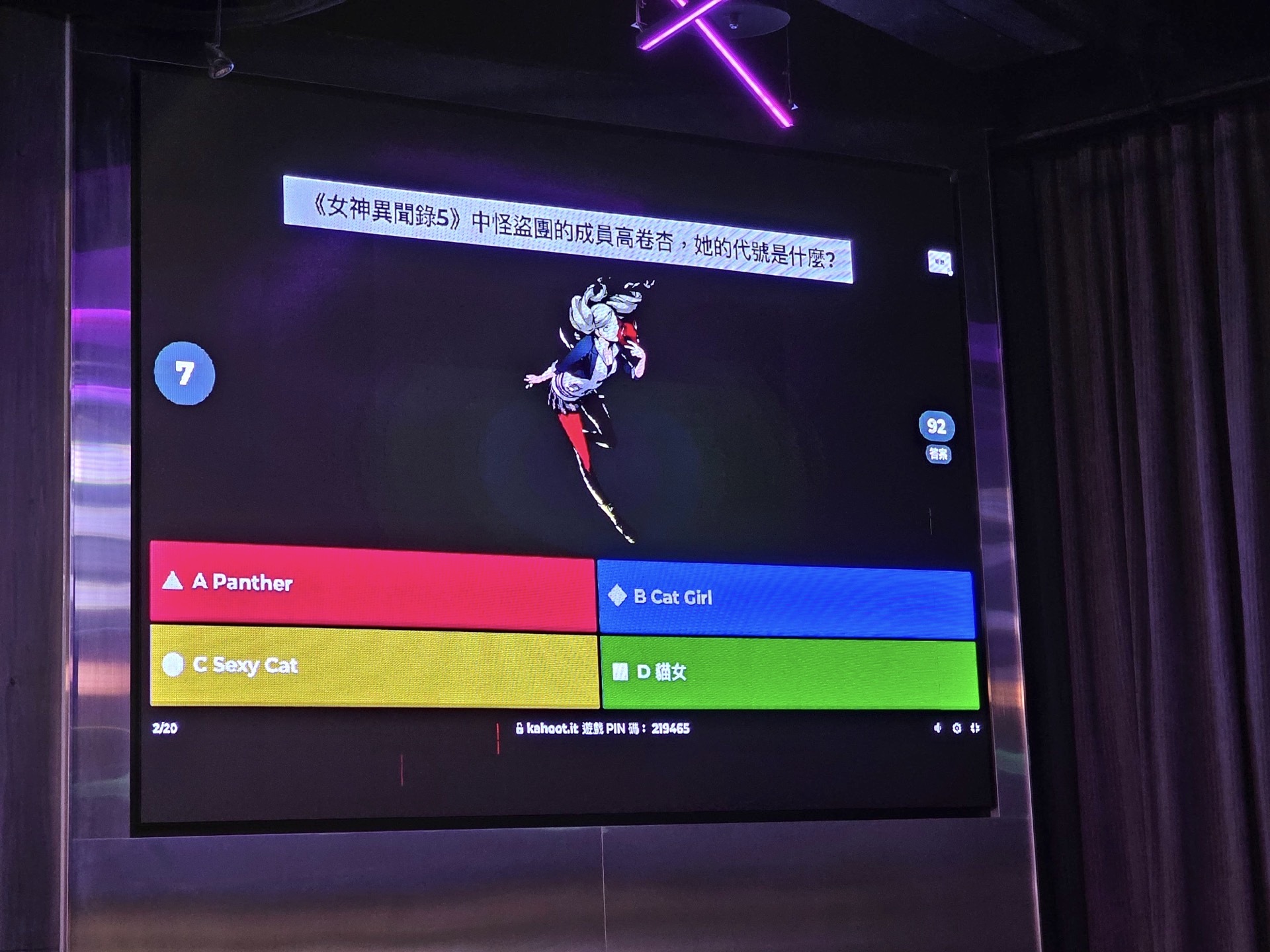除了來賓分享與問答環節,活動現場還安排了粉絲最期待的互動與抽獎。首先是「難易度 CHALLENGE!女神異聞錄問答挑戰」,參與者需要拿出自己的手機掃描 QR CODE、輸入暱稱加入問答,題目總共 20 題,要在這些選項中擇一作答。除了正解率外,答題速度也會反映在得分上。得分前五高的參加者可獲得豪華獎品。
