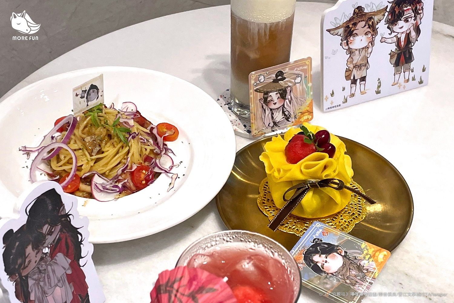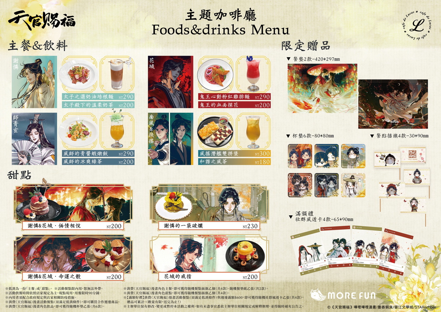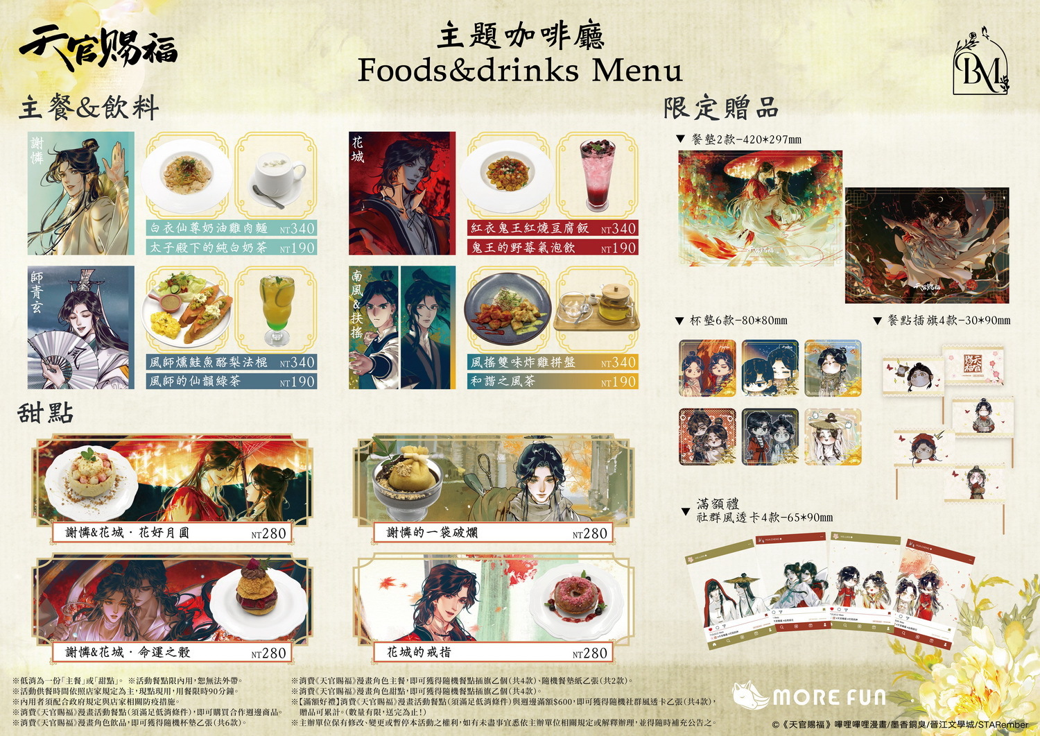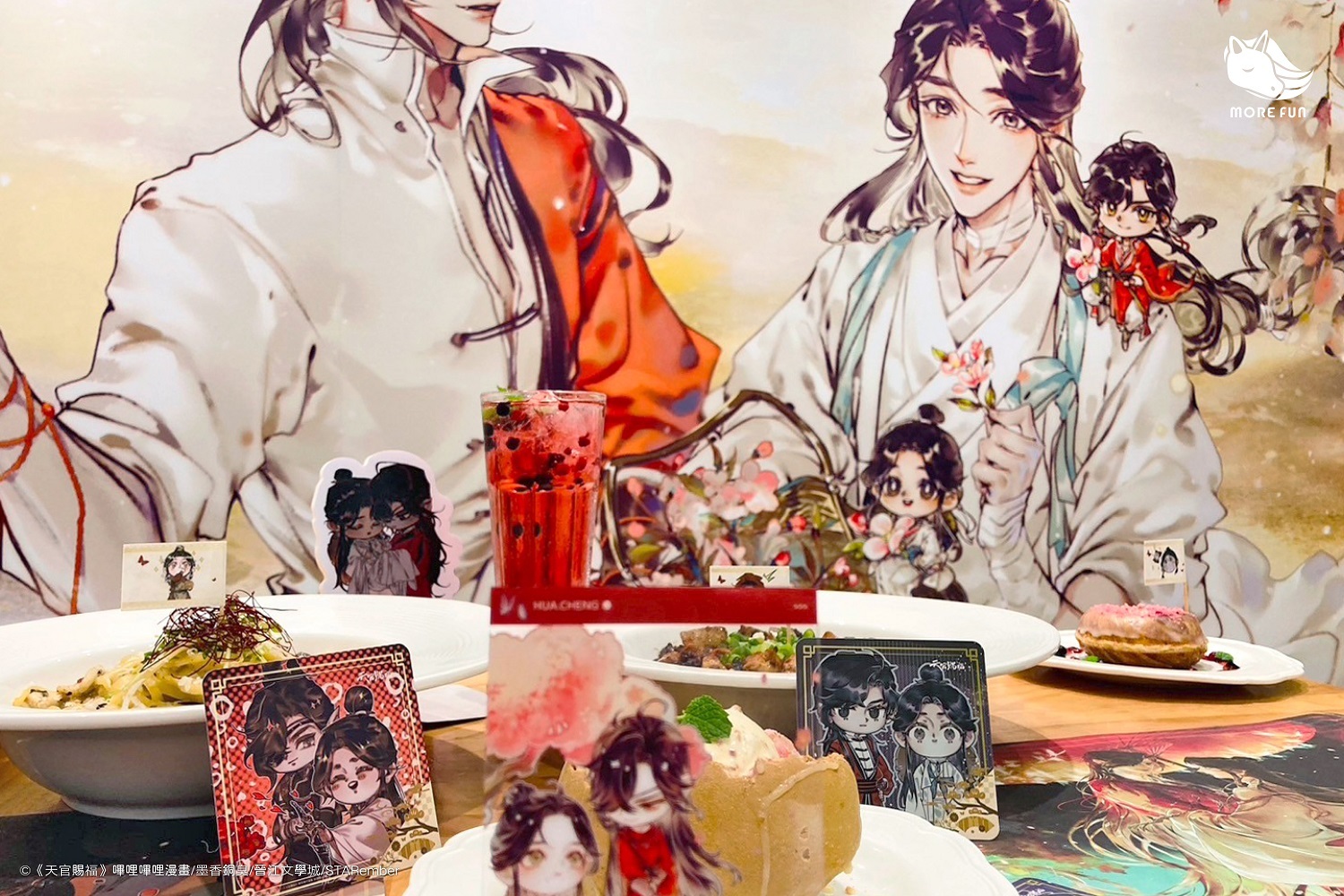 活動期間內特別推出了以「太子殿下—謝憐」、「絕境鬼王—花城」為主題的合作餐點及特色甜品,等著粉絲們來品嚐。消費指定活動餐點,隨餐附贈精美的限定餐墊、角色插旗,及角色杯墊。單筆消費合作餐點或週邊商品滿 600 元,還可獲得社群風透卡。各主題店現場的佈置也讓人宛如置身於