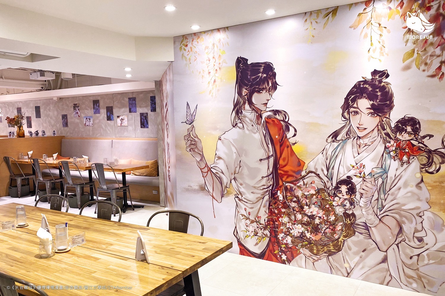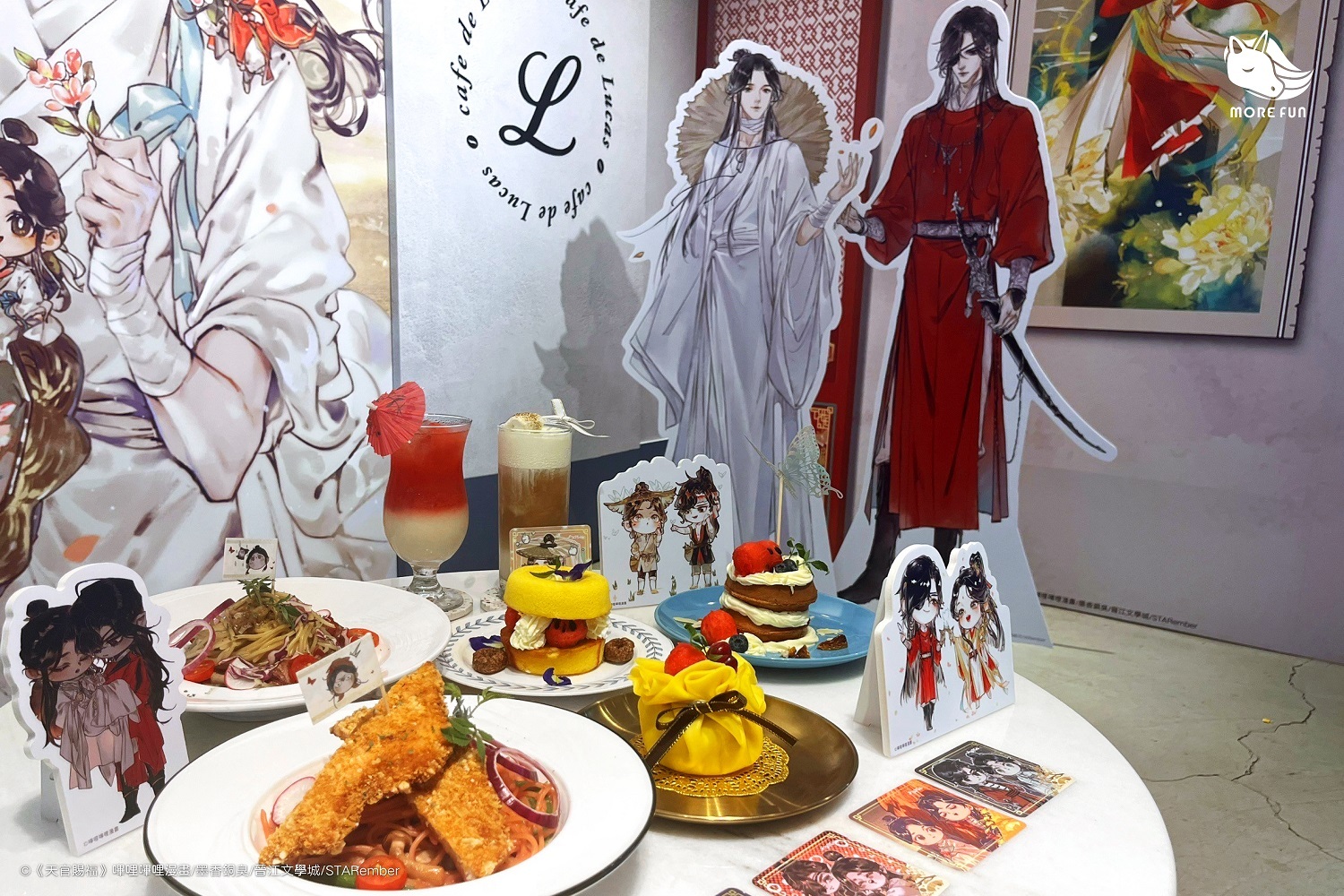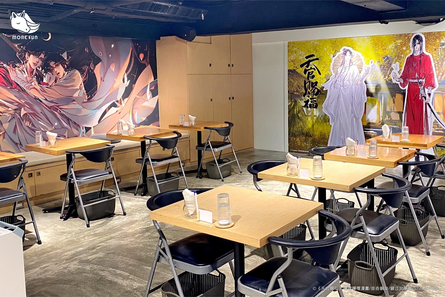 活動期間內特別推出了以「太子殿下—謝憐」、「絕境鬼王—花城」為主題的合作餐點及特色甜品,等著粉絲們來品嚐。消費指定活動餐點,隨餐附贈精美的限定餐墊、角色插旗,及角色杯墊。單筆消費合作餐點或週邊商品滿 600 元,還可獲得社群風透卡。各主題店現場的佈置也讓人宛如置身於