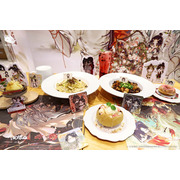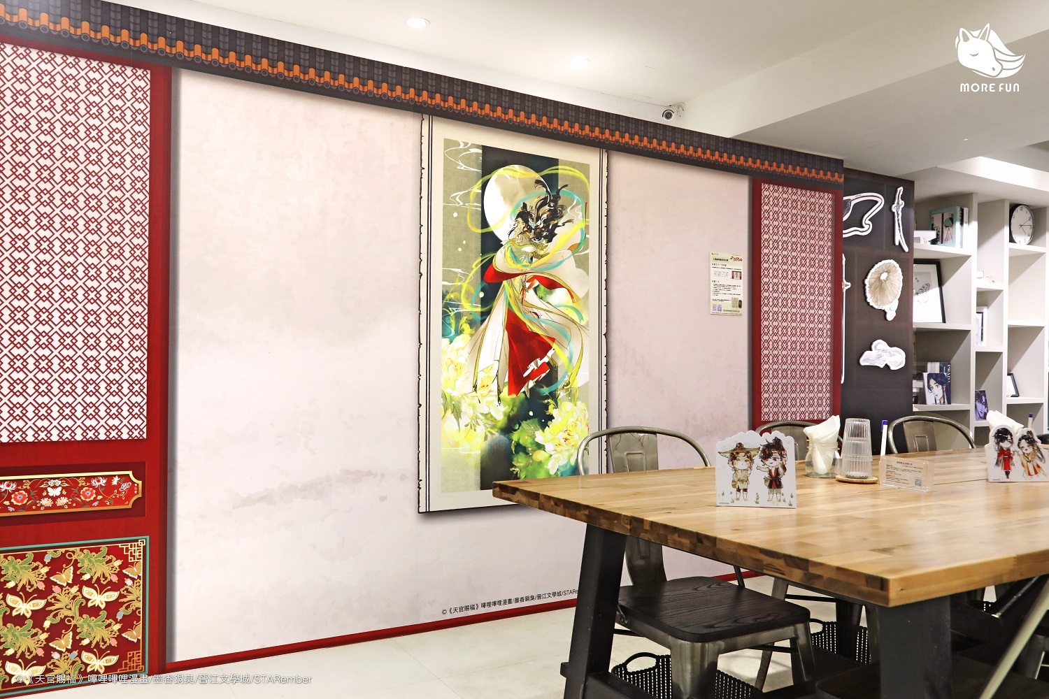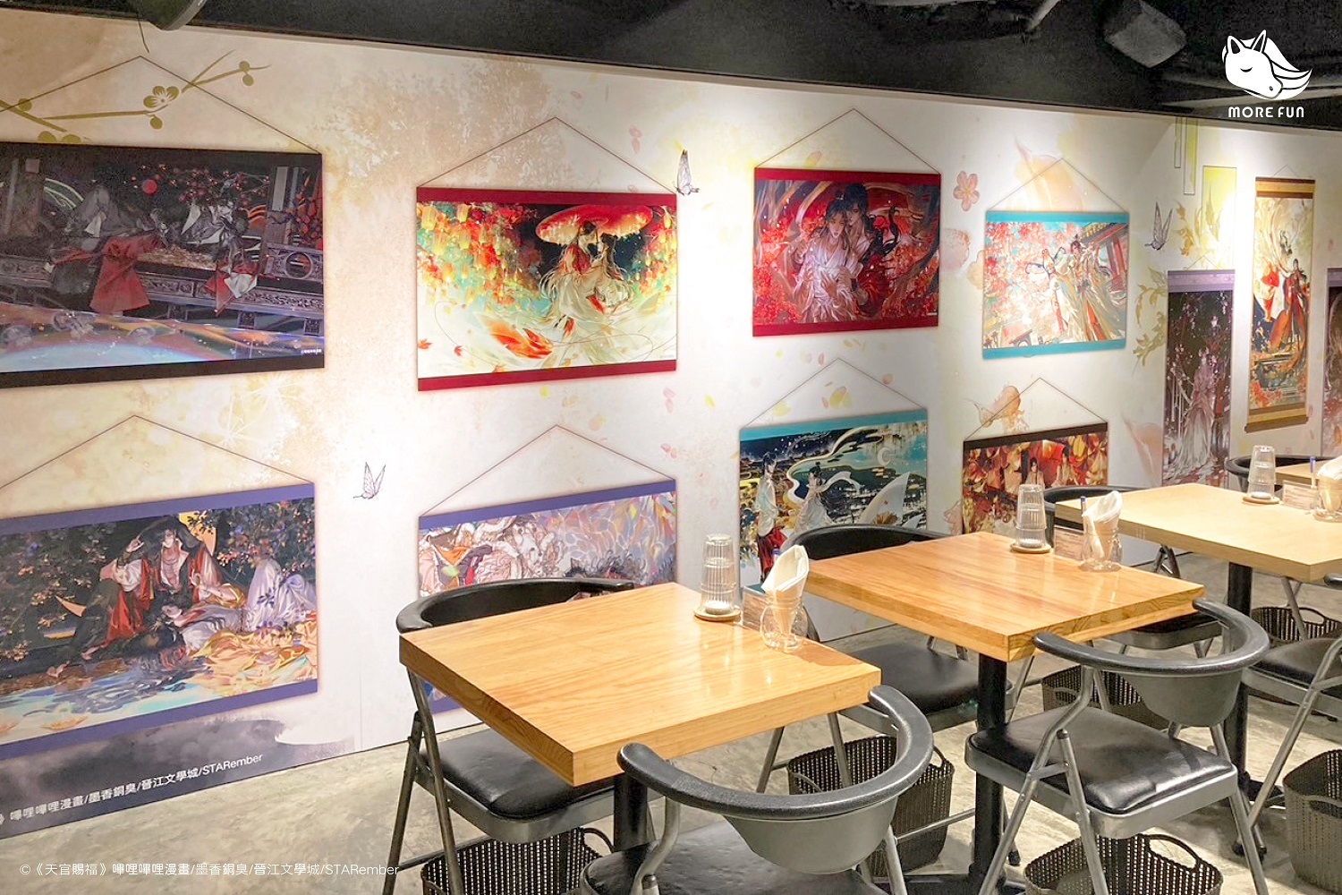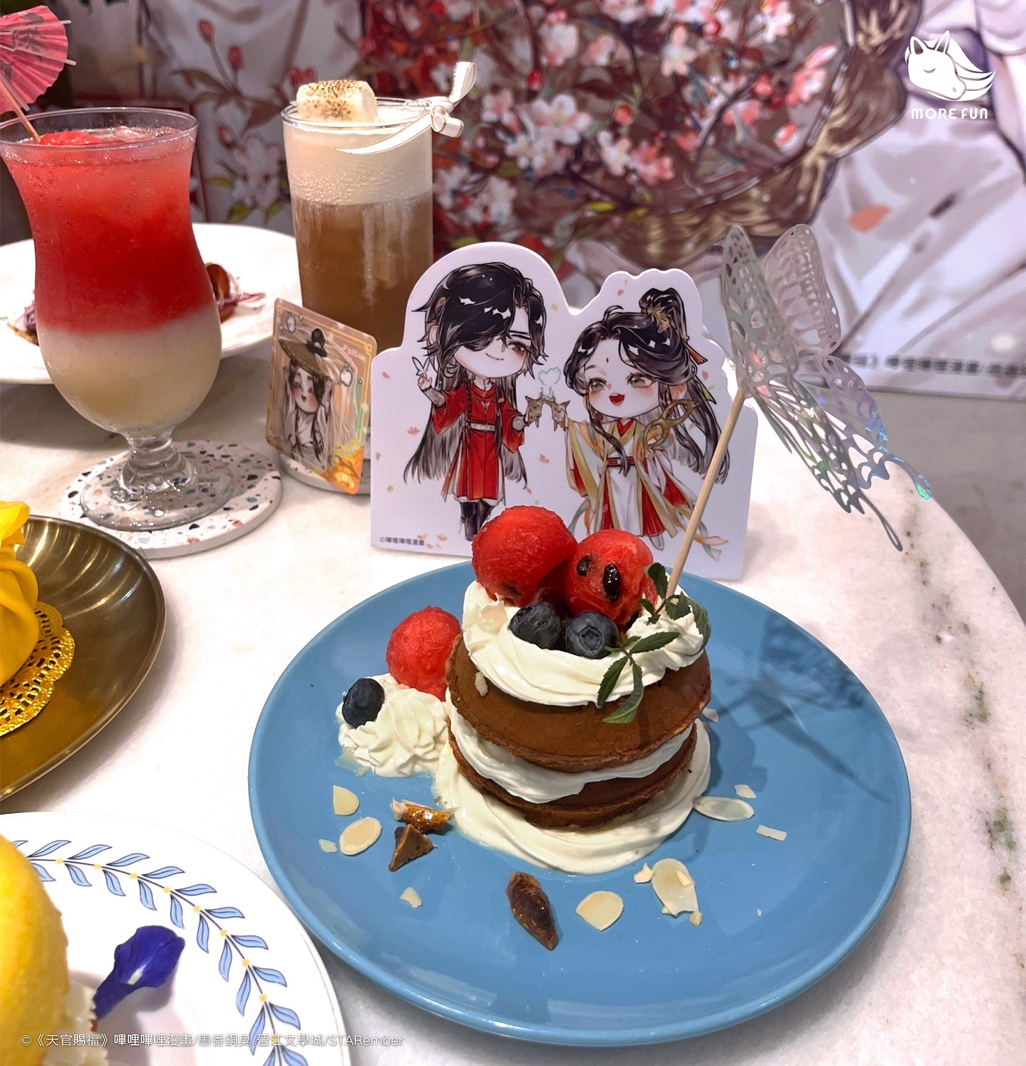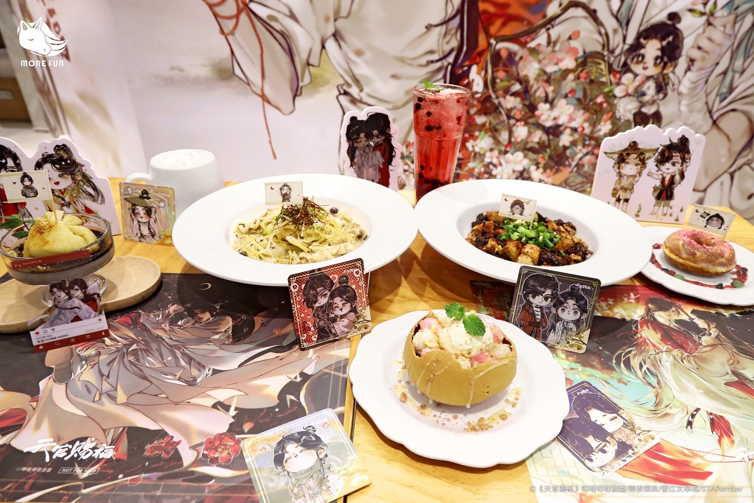 活動期間內特別推出了以「太子殿下—謝憐」、「絕境鬼王—花城」為主題的合作餐點及特色甜品,等著粉絲們來品嚐。消費指定活動餐點,隨餐附贈精美的限定餐墊、角色插旗,及角色杯墊。單筆消費合作餐點或週邊商品滿 600 元,還可獲得社群風透卡。各主題店現場的佈置也讓人宛如置身於