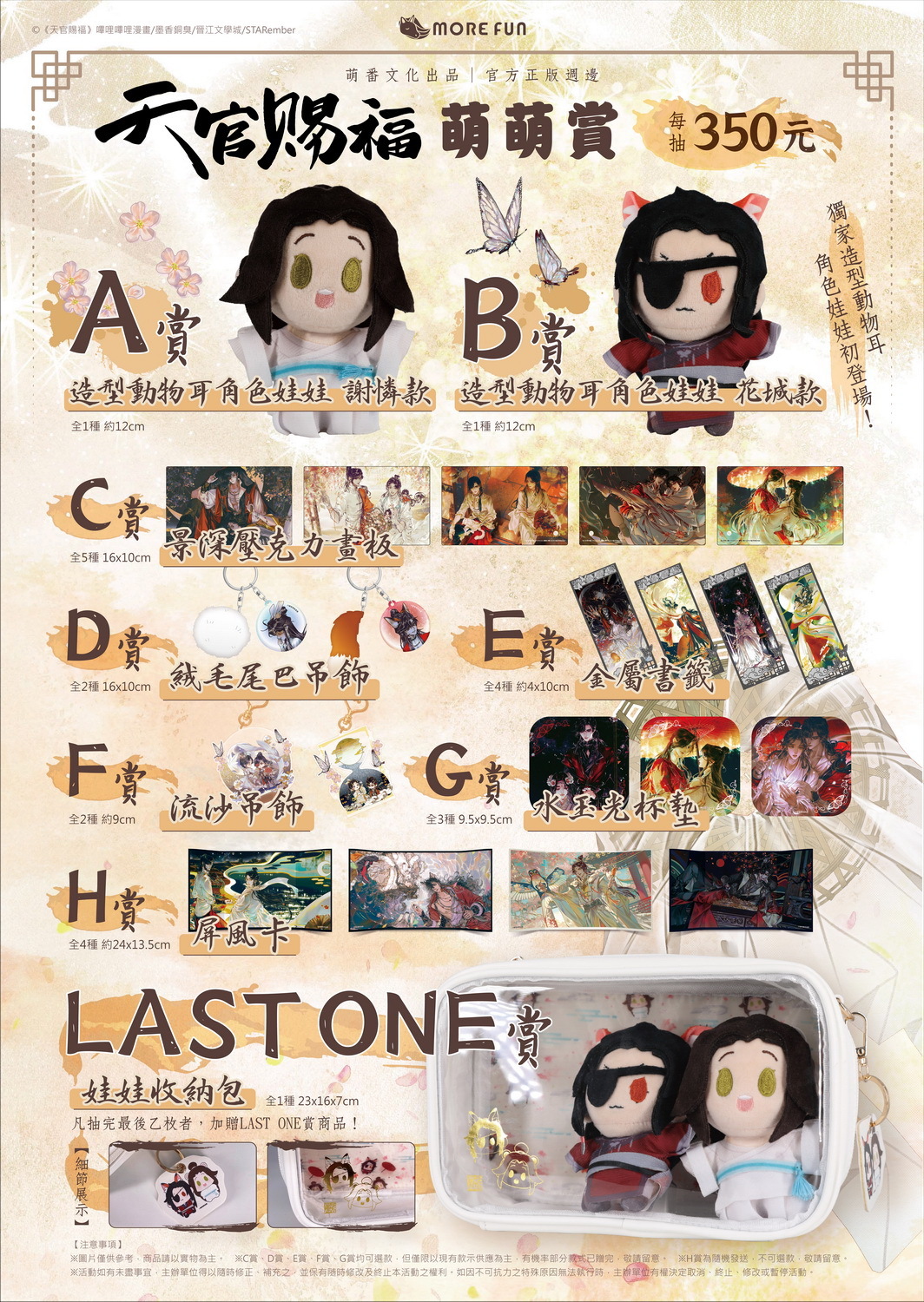 天官賜福》漫畫主題的「仙樂萌萌賞」。獎賞內容包含兩位主角的造型動物耳娃娃、CG 景深壓克力畫板、流沙吊飾等,還有其他獎賞週邊。只要抽走最後一抽的粉絲,更可把 LAST ONE 賞「娃娃收納包」一起帶回家。