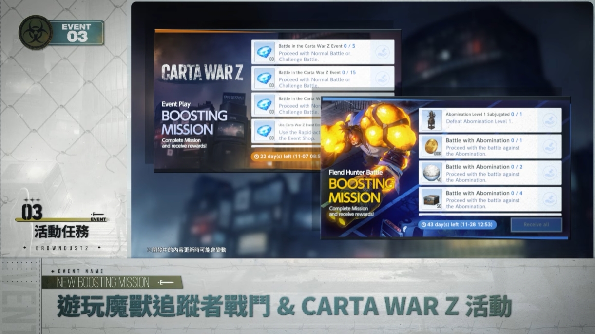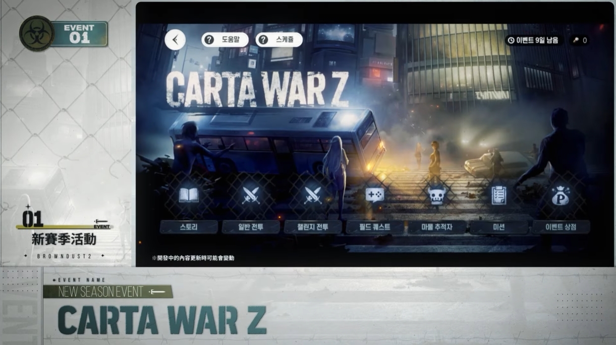 此外,至 11 月 14 日進行的賽季活動「Carta War Z」也一同公開。突如其來的喪屍事件讓米卡埃拉、盧班希亞、賽爾、內布利斯陷入危機,並開始尋找事件的元凶。BOSS 將以魔獸追蹤者的魔王登場,一般戰鬥與挑戰戰鬥各 15 次,可享受到共 30 次的戰鬥。透過場域任務,可遊玩到閃避喪屍並蒐集治療劑的迷你遊戲。