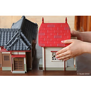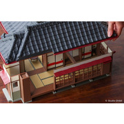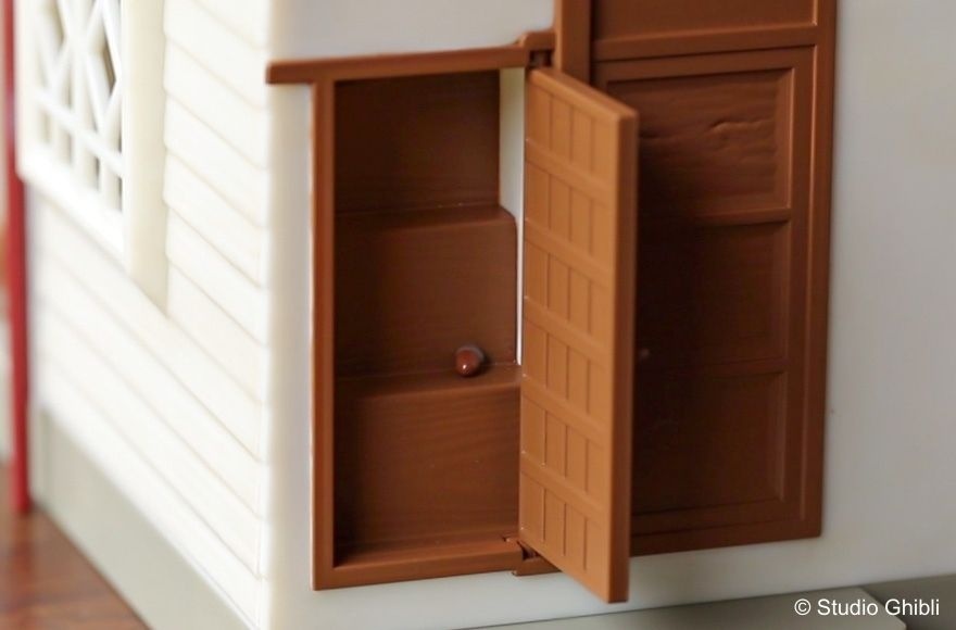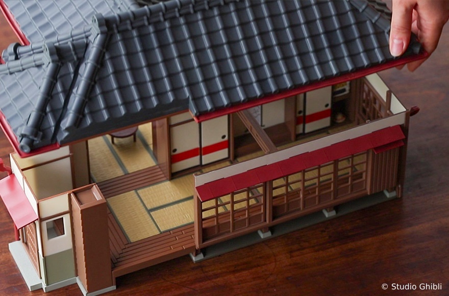 模型屋完全重現電影中,由主屋、書房和廚房/浴室所組成的草壁家,並有茶几、浴蓋和煙囪等配件,其中屋頂可以取下,讓粉絲可以近距離地觀察建築物的內部,以及充滿生活感的物品。跟著小梅小月的腳步,推開拉門進入室內,經過榻榻米和緣廊, 彎入廚房和浴室,壓下手動汲水器,拿起浴缸蓋子,接著進入書房,可上到二樓打開窗戶,在一樓桌上則有小梅送爸爸的花,到了露臺則是腐蝕晃動的舊柱子。搭配安裝電池,點起客廳跟臥室的微亮的橘色燈光,就像電影中溫暖又深邃的夜間場景,細節滿滿完美重現草壁家每個角落。