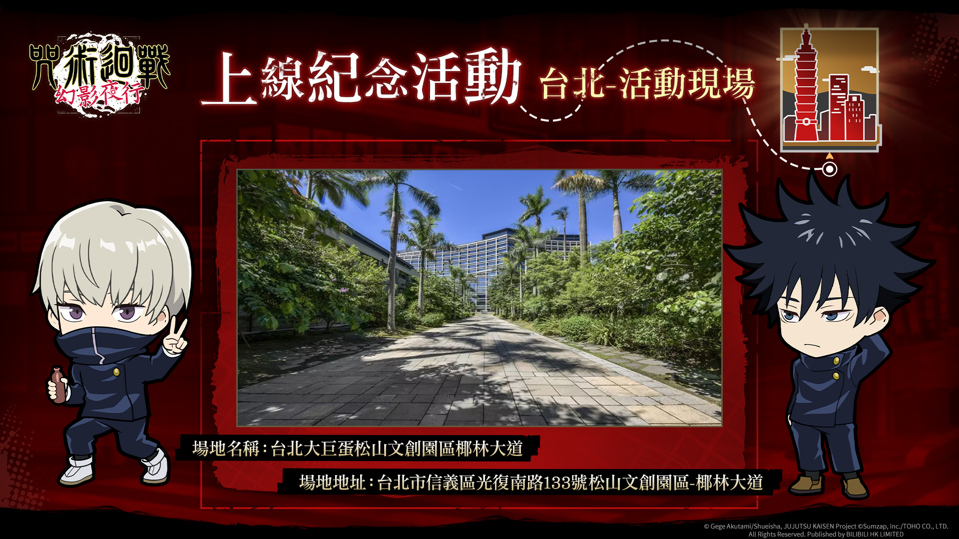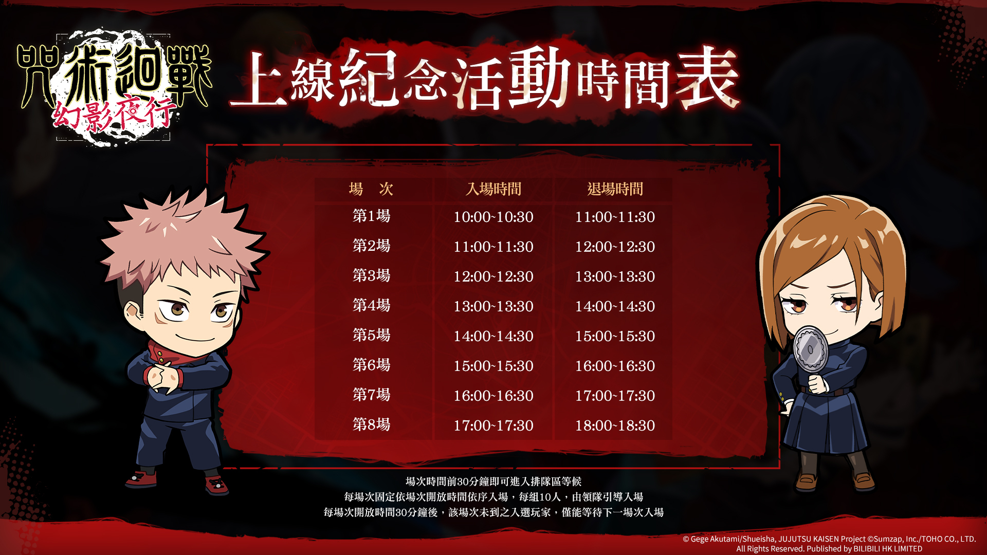 為歡慶遊戲正式推出,首爾、台北及洛杉磯將於 2024 年 11 月 9 日起開始舉辦線下實體慶祝活動。參與活動的玩家將有機會體驗《咒術迴戰》的世界、挑戰遊戲內的專屬特別活動,並收藏限量版的週邊商品。無法親自到場的粉絲,也可以透過活動直播來一起享受全球同步慶祝的熱潮。