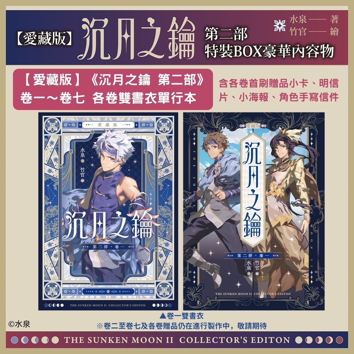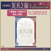竹官全新繪製的插圖「幻世 vs. 迴沙」,設計成兩色風格的「收藏用書盒」和「摺疊海報」,此外,【愛藏版】特裝 BOX 還特別收錄《沉月之鑰 第二部》的「限定人設集」,收錄竹官老師新繪人物立繪、沉月之鑰第二部角色介紹,以及同樣新繪的「雙面壓克力簽名板」。