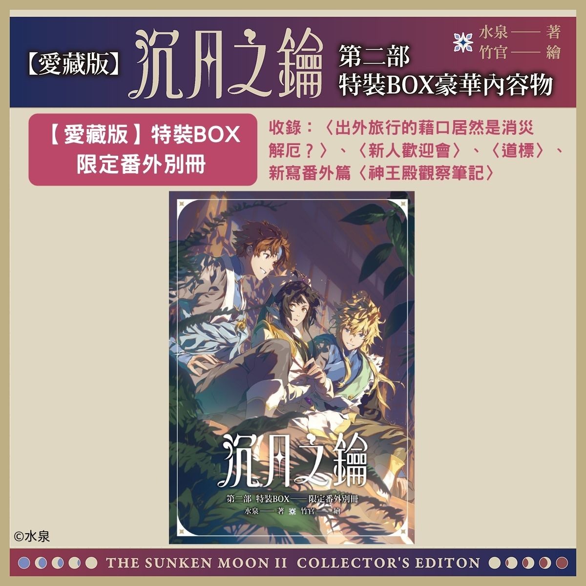 【愛藏版】特裝 BOX 完整收錄水泉《沉月之鑰 第二部》全套七卷,包含全新設計的雙書衣,以及舊版封面圖、內頁黑白插圖與內文。各卷單行本首刷特典附贈「角色手寫信件」、「小卡」、「明信片」與「小海報」。【愛藏版】特裝 BOX 收錄「限定番外別冊」,內容包括「出外旅行的藉口居然是消災解厄?」、「新人歡迎會」、「道標」,以及新寫番外篇「神王殿觀察筆記」。