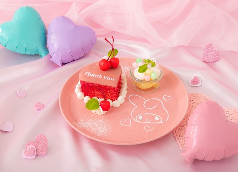 咖啡廳內所有餐點都以粉色為主題,推出了多款特別設計的料理與甜點,包括粉色迎賓蛋包飯、派對拼盤、滿溢美樂蒂愛心的焗烤料理等。甜點部分則有美樂蒂親自畫上自己臉蛋圖案的冰淇淋聖代、裝在禮物盒造型玻璃杯中的鬆餅、還有傳遞美樂蒂感謝之情的心形鬆餅等。此外,還有以美樂蒂為靈感設計的飲品。
