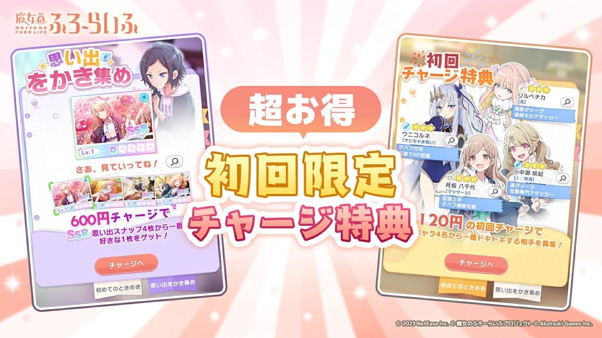 為慶祝事前登錄突破 20 萬人,官方贈送全玩家包括金幣、經驗值券、★2 角色「南原野乃子(白湯)」、SSR 裝飾「豪華柑橘溫泉」等獎勵。此外,遊戲中還提供最多 360 連免費抽卡的機會,並可透過累積 7 日登入獲得更多獎勵。