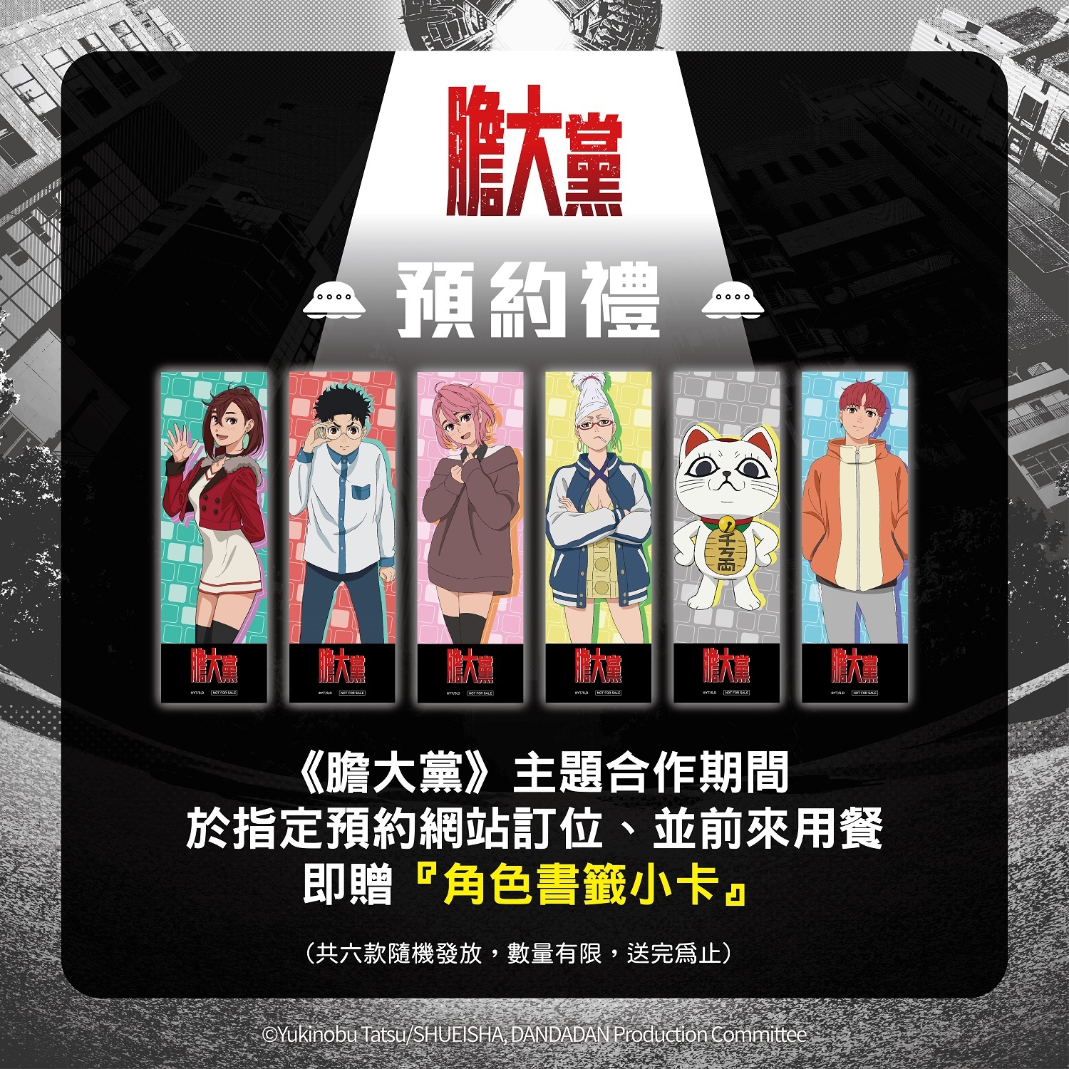 凡透過 FANFANS CAFÉ 指定預約網站預訂並前來用餐,即可獲得「角色書籤」乙張(隨機款式,共六款),想前往用餐的粉絲,請記得先使用網路訂位。