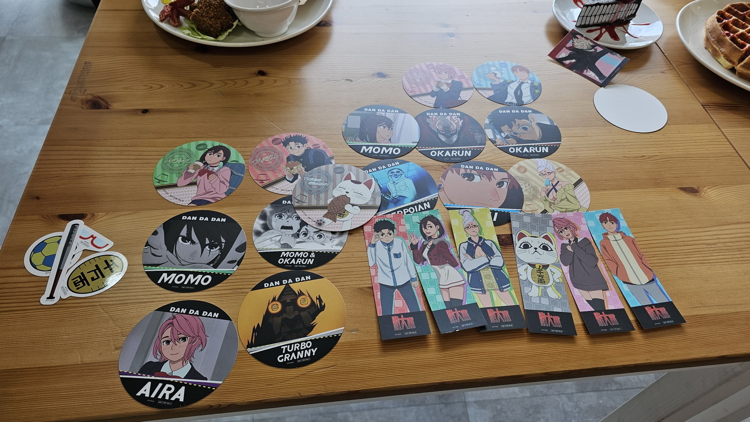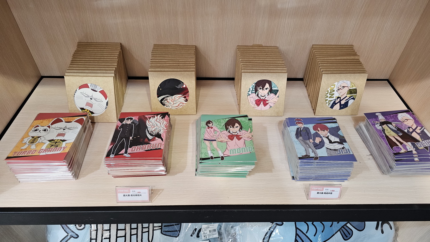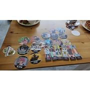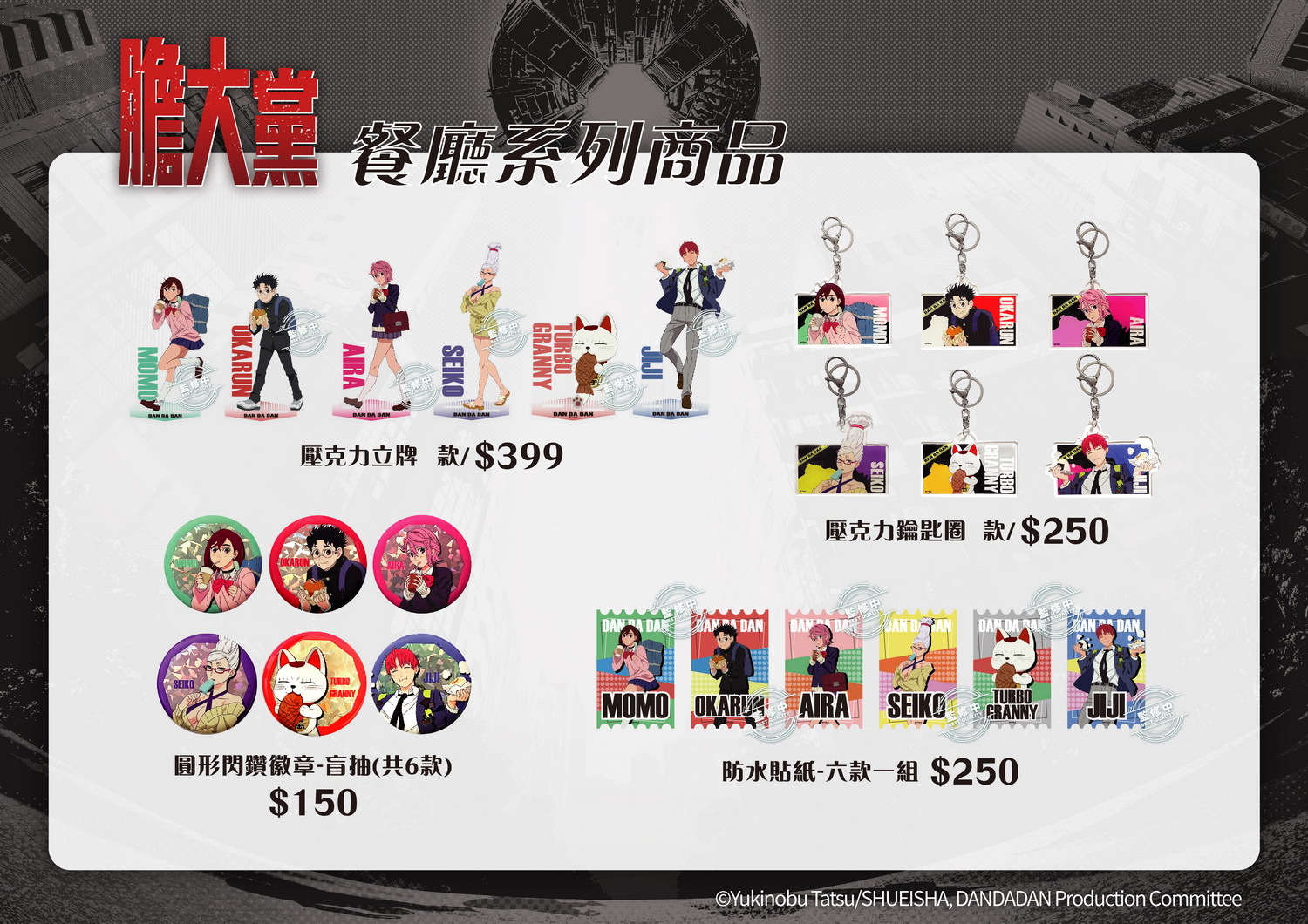 除了餐點之外,本次當然也有由 FANFANS 粉粉獨家設計的限定立繪周邊,並融入日方繪製的全新圖片,角色共有小桃、厄卡倫、星子、愛羅、寺仁、高速婆婆,周邊商品包括經典不敗的壓克力立牌、壓克力鑰匙圈收藏擺飾都超適合。盲抽的圓形閃鑽徽章共六款隨機,此外,還有票卡造型的防水貼紙組。