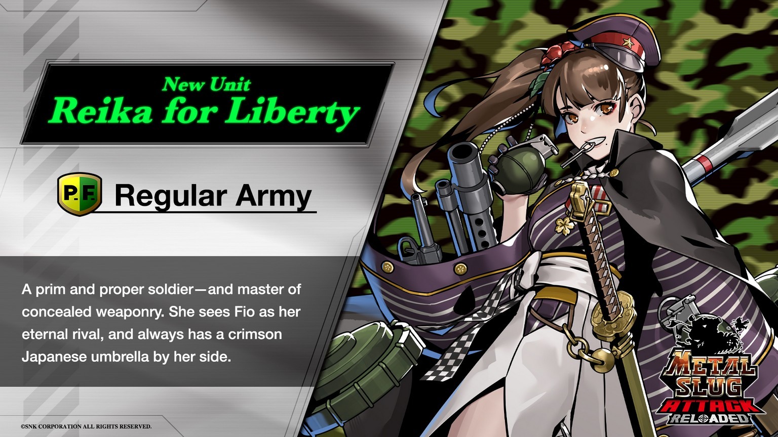 METAL SLUG ATTACK》備受好評的期間限定活動中登場的兵種單位,這次將會作為通常兵種單位進行追加。另外,伴隨兵種單位的追加,常夏篇和聖誕篇的劇情,以及可以瀏覽兵種單位高清插圖的 GALLERY、頭像、任務也將隨之更新。