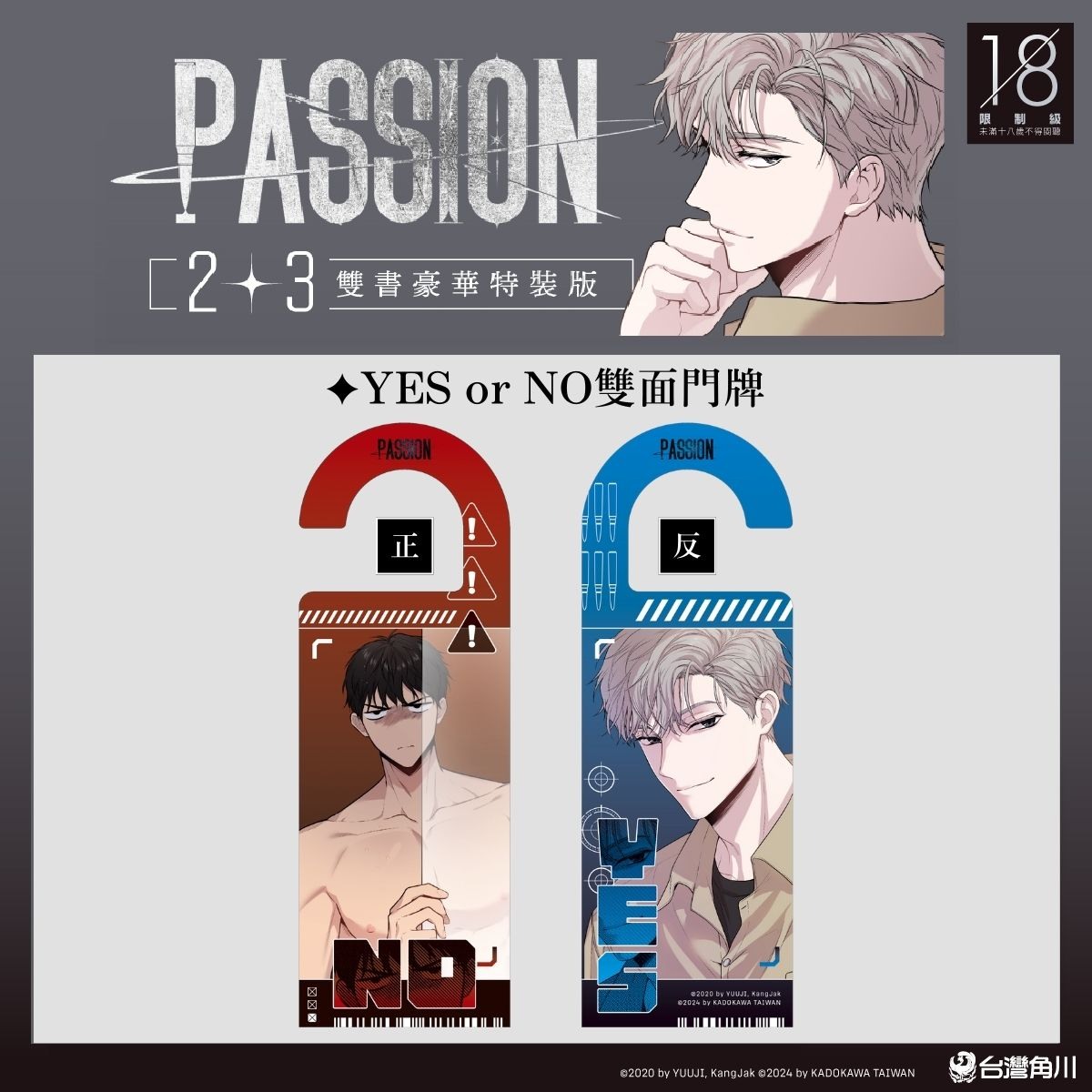 《PASSION》漫畫單行本將同步推出 2、3 集,實體限定首刷特典「伊萊小卡」各一張(首刷售完即無贈品);並同步推出《PASSION》2+3 雙書豪華特裝版,收錄多款限定特典「伊萊、泰義 Q 版壓克力立牌」、「伊萊頭像手機夾片」、「肌情四射資料夾」、「YES or NO 雙面門牌」以及「明信片 4 枚組」,所有特典將收錄於「特裝版珍藏書盒」內。12 月 12 日起於全台指定網路及實體通路與台灣角川官網開放事前預購,預計 12 月 19 日正式發售,特裝版數量有限。